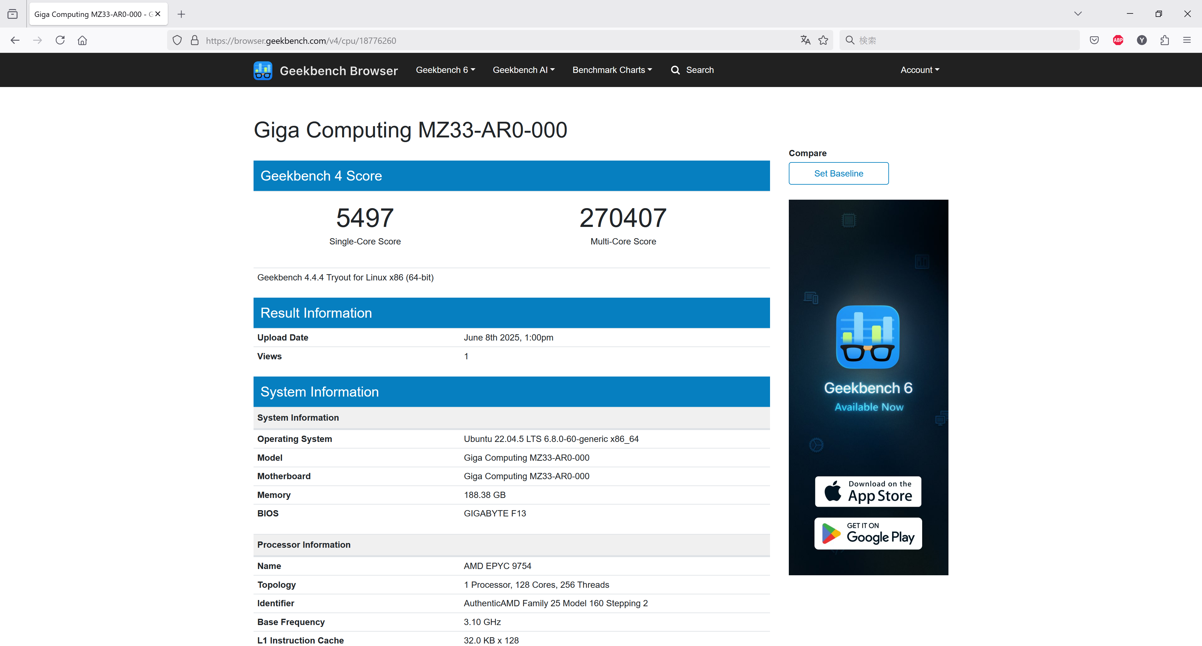 - 第4世代 AMD EPYC 9754 128-Core Processor 256Threads 192GB Ubuntu 22.04.5 LTS GT1030 CUDA 12.9.0 Geekbench-4.4.4-Linuxを動作させてみた Multi-Core Score 272536 270407
