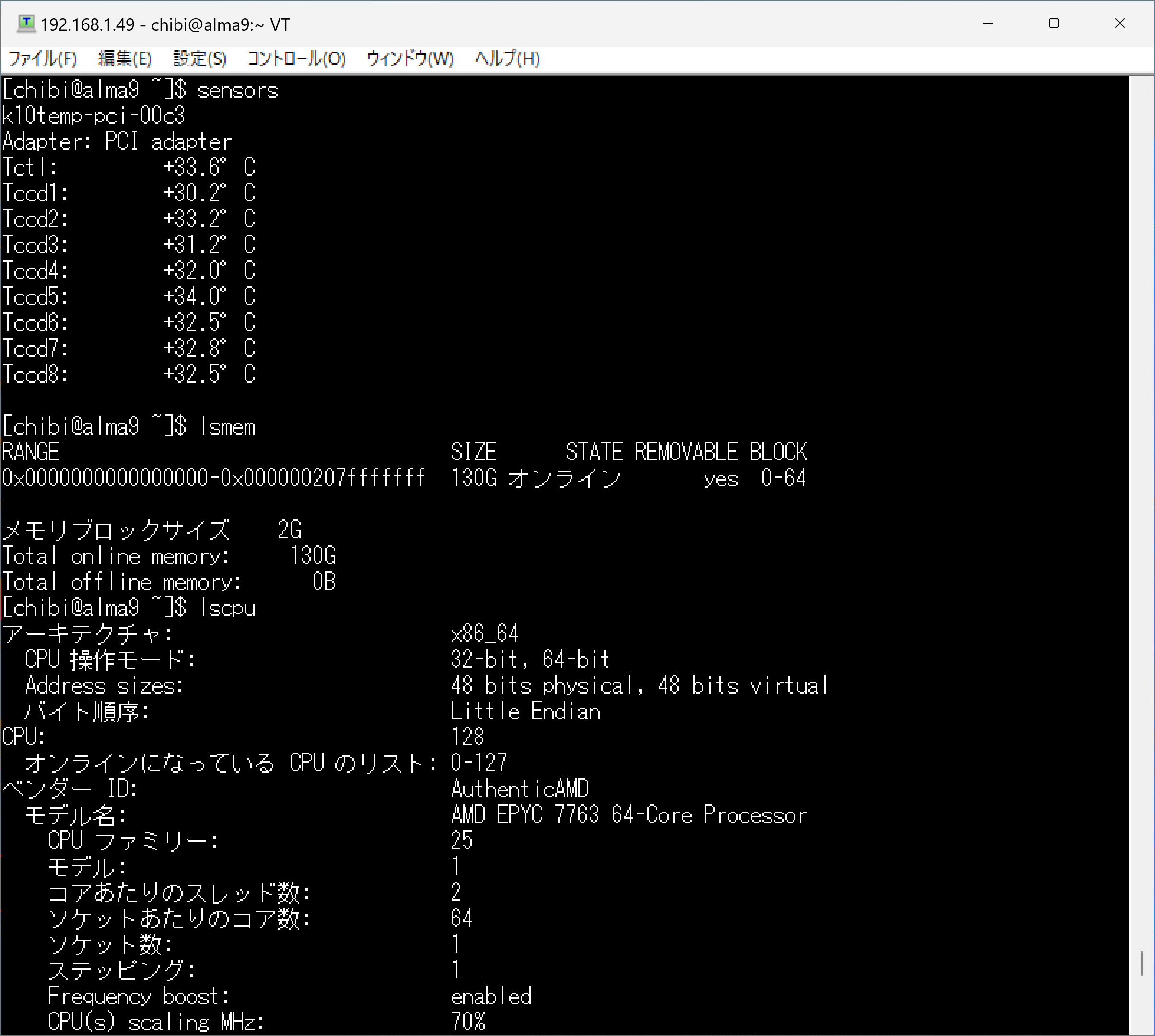 - 第3世代 AMD EPYC 7763 64-Core Processor 128Threads 128GB TITAN RTX ADATA SX8200PNP 256GB で構成された Red Hat Enterprise Linux release 9.5 へ CUDA.12.9.0 をInstall して nvidia-smi nvcc -V cat /etc/redhat-release sensors nvme list nvme smart-log /dev/nvme0n1 lsmem lscpuを設定した