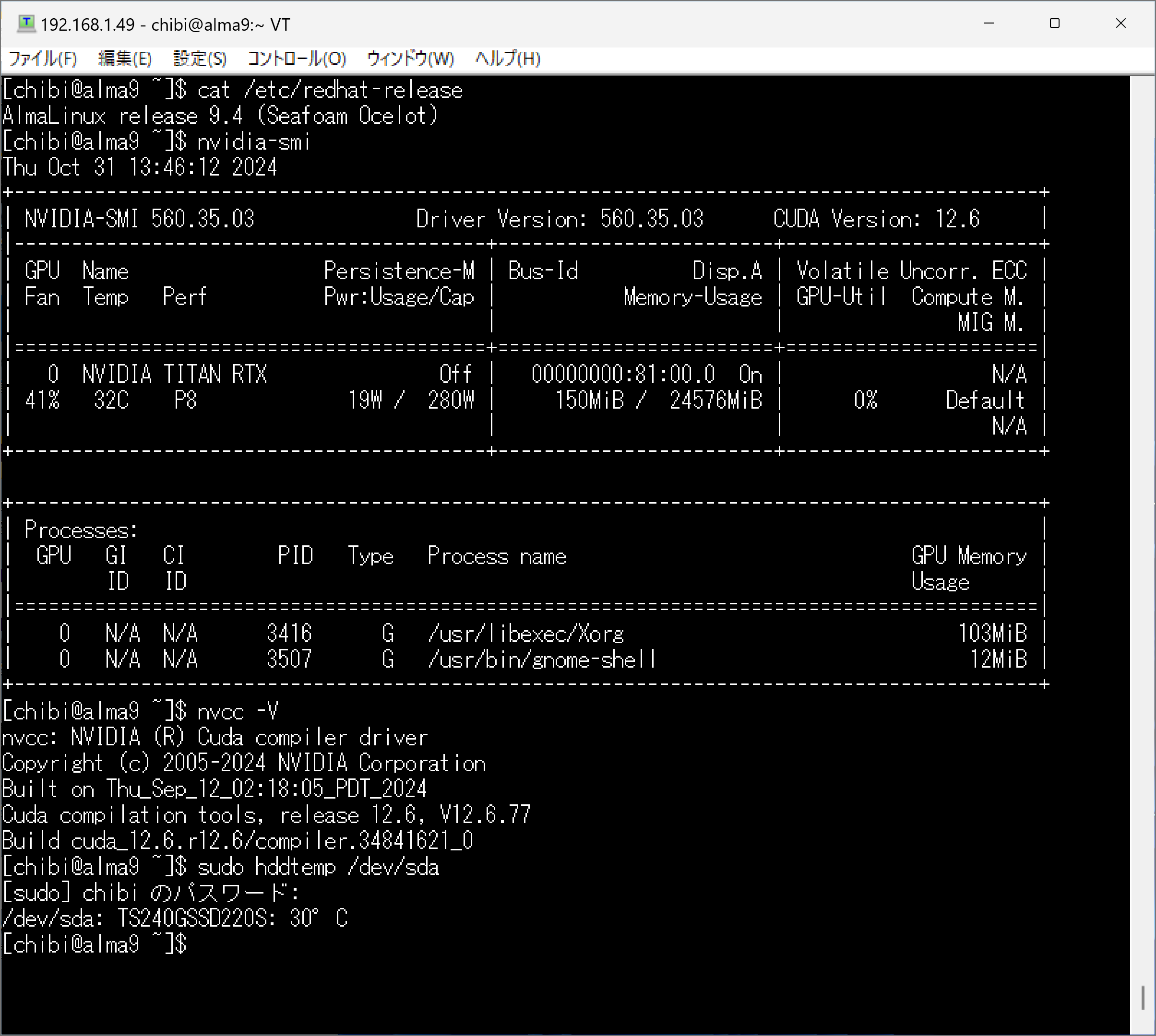 - 第3世代 AMD EPYC 7763 64-Core Processor 128Threads 128GB TITAN RTX TS240GSSD220S 256GBで構成された AlmaLinux release 9.4 へ CUDA-toolkit 12.6.2をInstall してcat /etc/redhat-release nvidia-smi nvcc -V sensors hddtemp lsmem lscpuを設定してみた