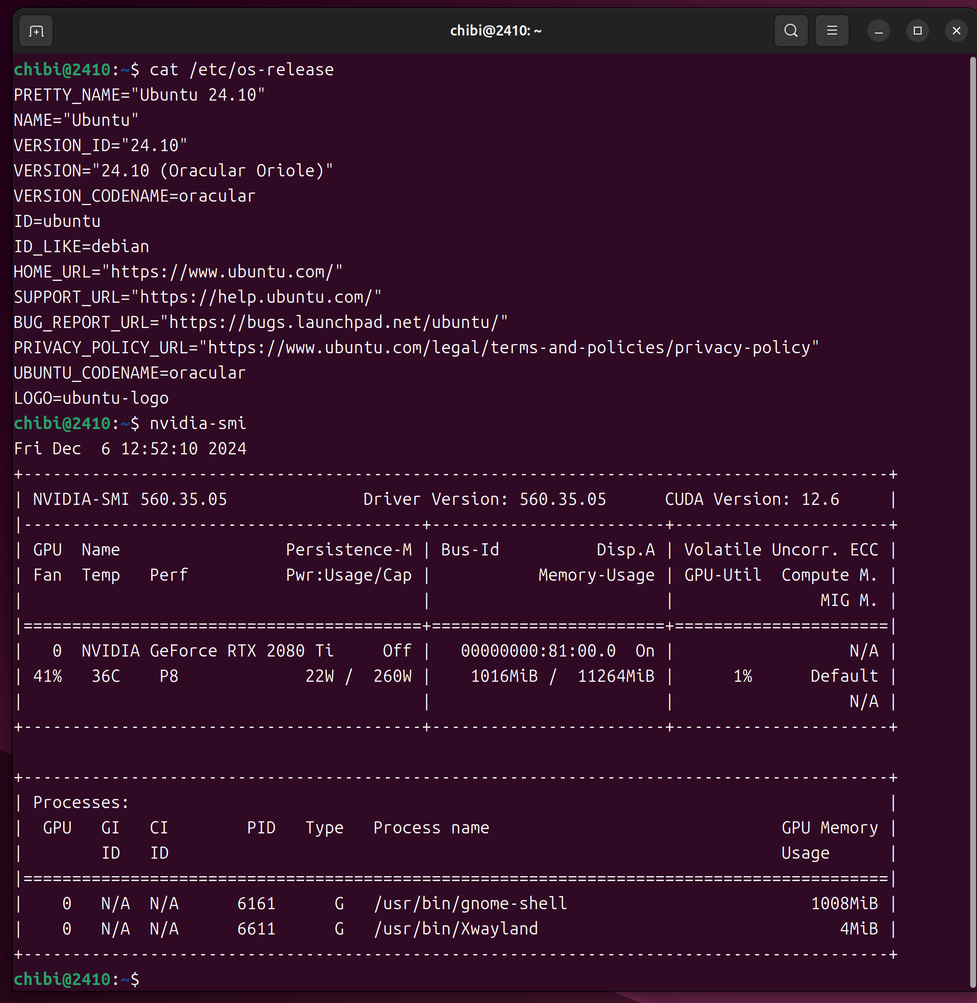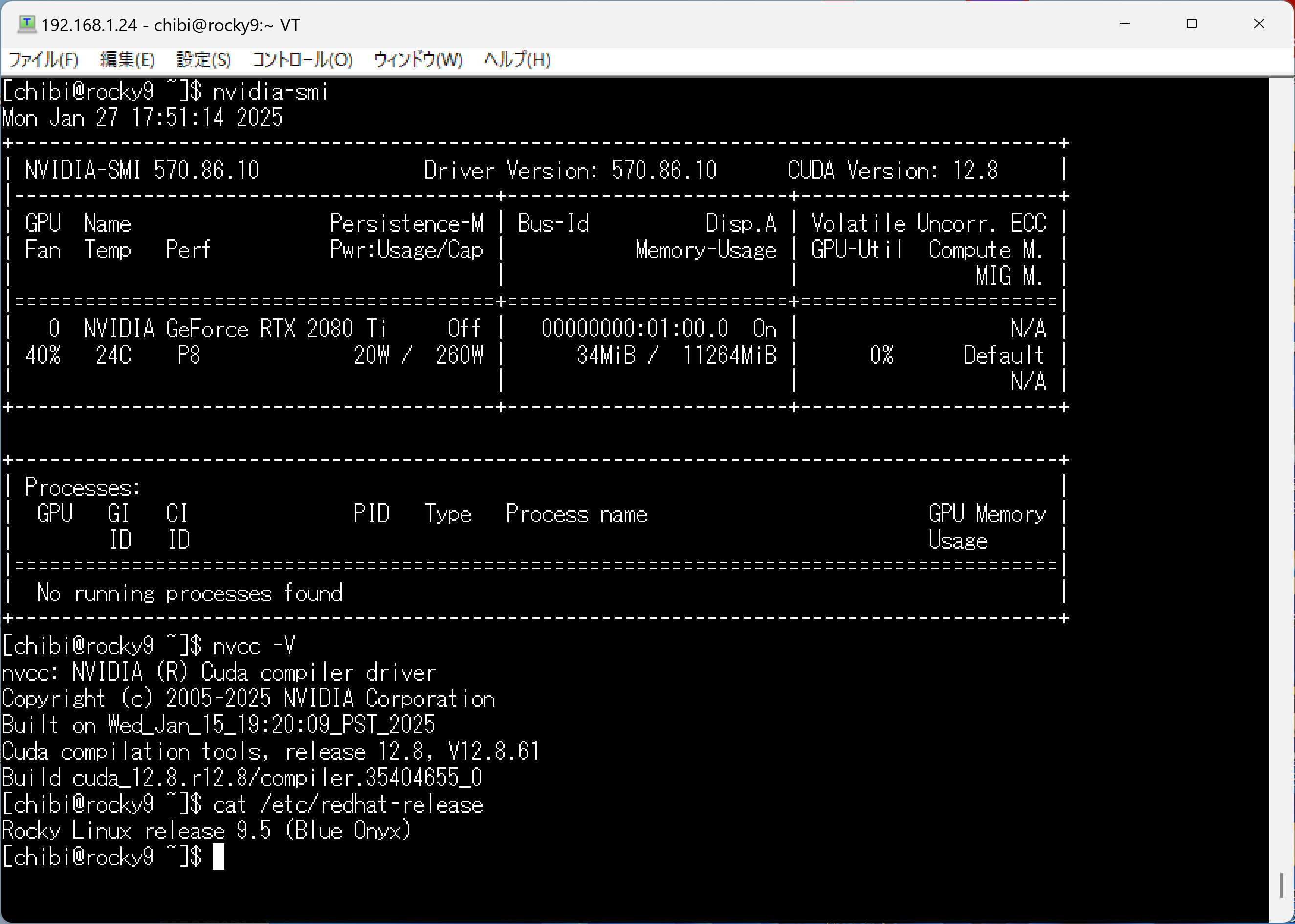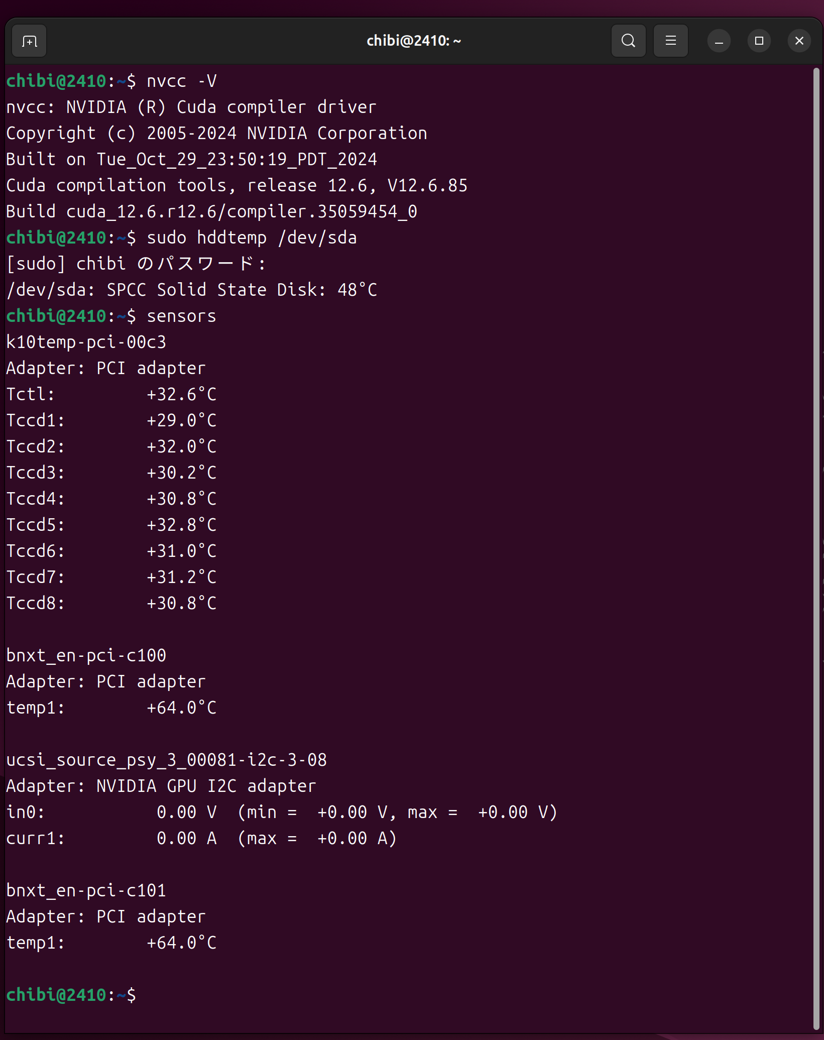 - 第5世代 AMD EPYC 9655 96-Core Processor 192Threads 384GB RTX2080Ti EDILOCA EN605 256GBで構成された Ubuntu22.04.5 LTSへ CUDA-toolkit 12.9.1をInstall してnvidia-smi nvcc -V cat /etc/os-release sensors nvme list nvme smart-log /dev/nvme0n1 lscpuを設定してみた