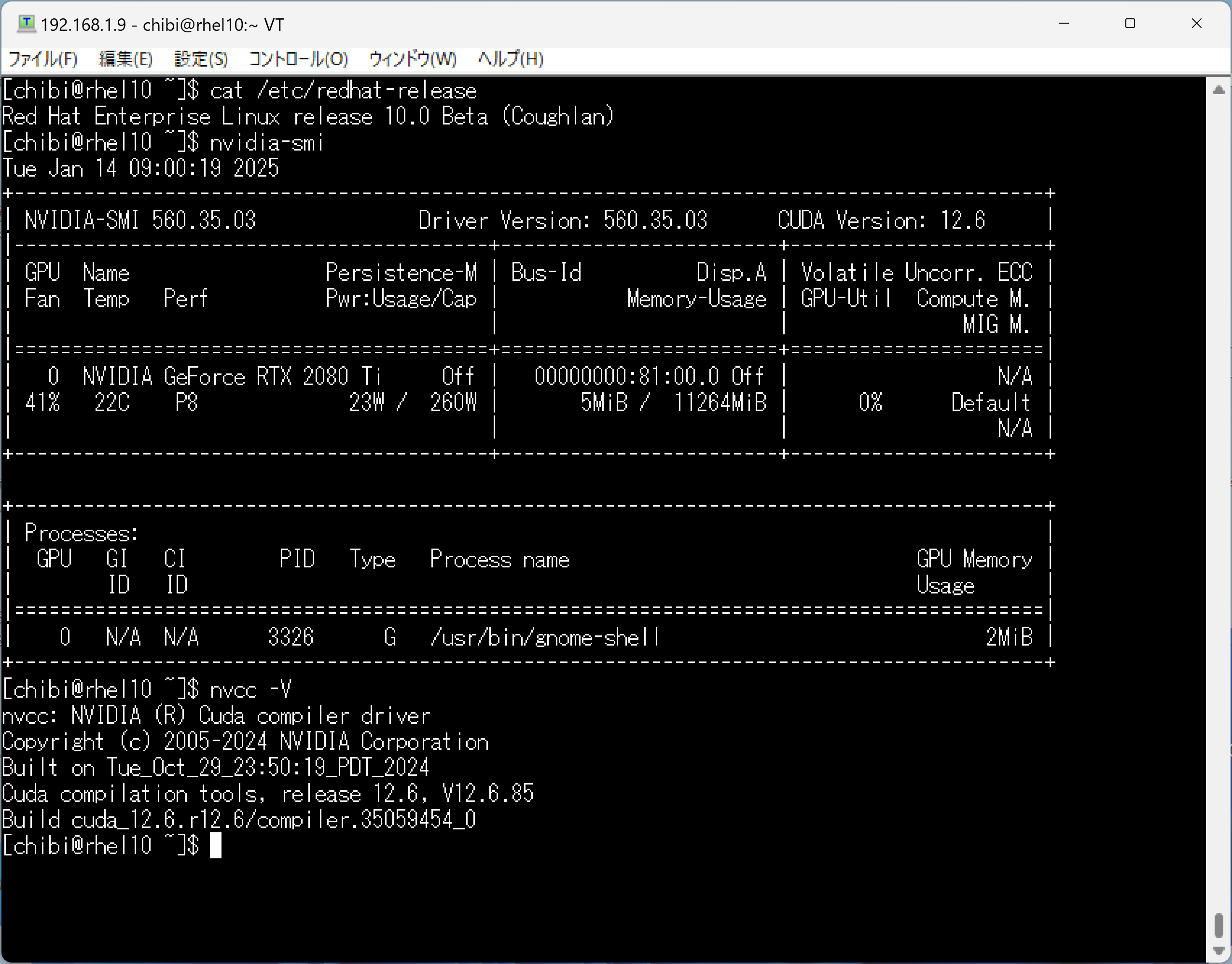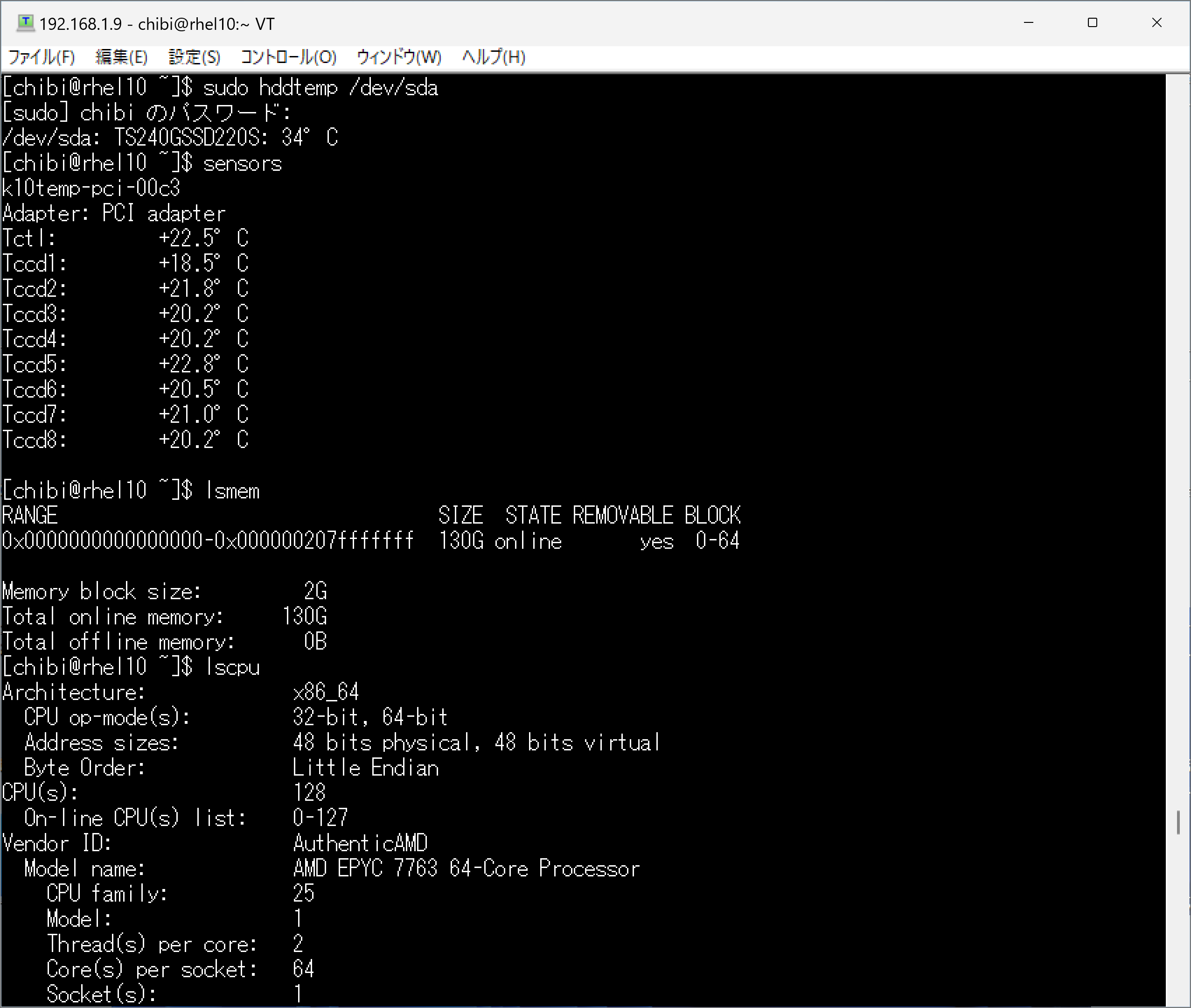 - 第3世代 AMD EPYC 7763 64-Core Processor 128Threads 128GB RTX2080Ti SPCC Solid State 256GBで構成された AlmaLinux release 9.5 へ CUDA-toolkit 12.6.3をInstall してcat /etc/redhat-release nvidia-smi nvcc -V sensors hddtemp lsmem lscpuを設定してみた