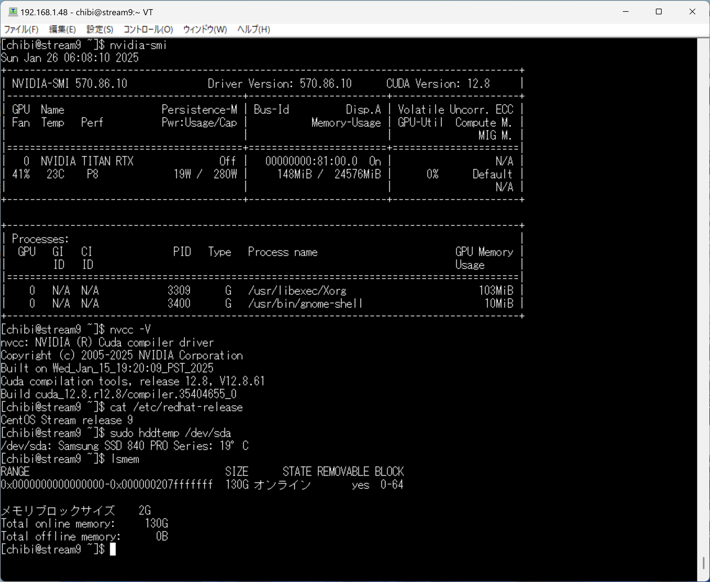 - 第3世代 AMD EPYC 7763 64-Core Processor 128Threads 128GB TITAN RTX ADATA SX8200PNP 256GB で構成された Red Hat Enterprise Linux release 9.5 へ CUDA.12.8.0.をInstall して nvidia-smi nvcc -V cat /etc/redhat-release sensors nvme list nvme smart-log /dev/nvme0n1 lsmem lscpuを設定した