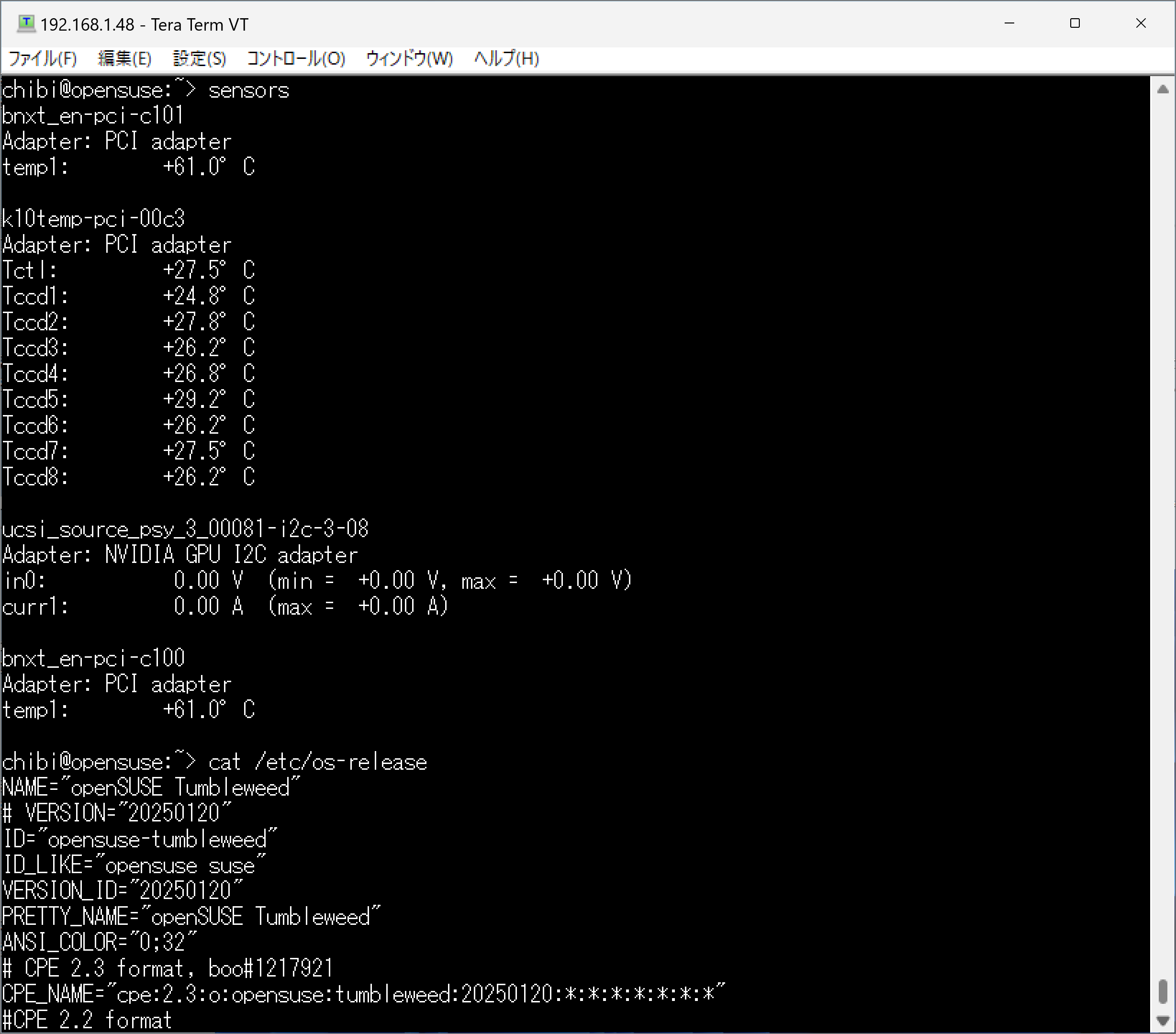 - 第3世代 AMD EPYC 7763 64-Core Processor 128Threds 128GB Fanxiang S101 256GB TITAN RTXで構成された OpenSUSE Tumbleweed へ CUDA-toolkit 12.8.0をInstall して nvidia-smi nvcc -V hddtemp sensors cat /etc/os-release lsmem lscpuを設定してみた