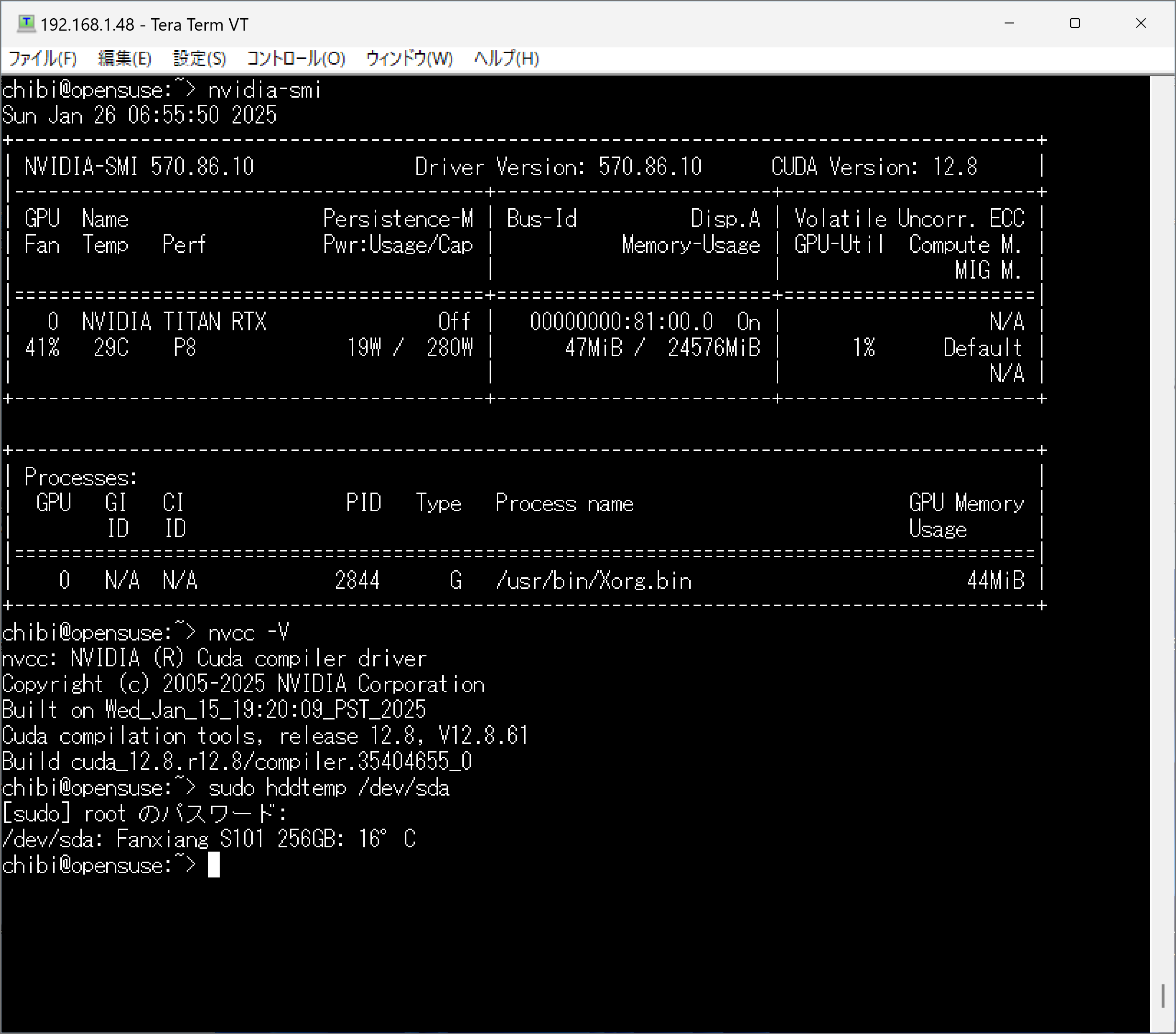 第3世代 AMD EPYC 7763 64-Core Processor 128Threds 128GB Fanxiang S101 256GB TITAN RTXで構成された OpenSUSE Tumbleweed へ CUDA-toolkit 12.8.0をInstall して nvidia-smi nvcc -V hddtemp sensors cat /etc/os-release lsmem lscpuを設定してみた