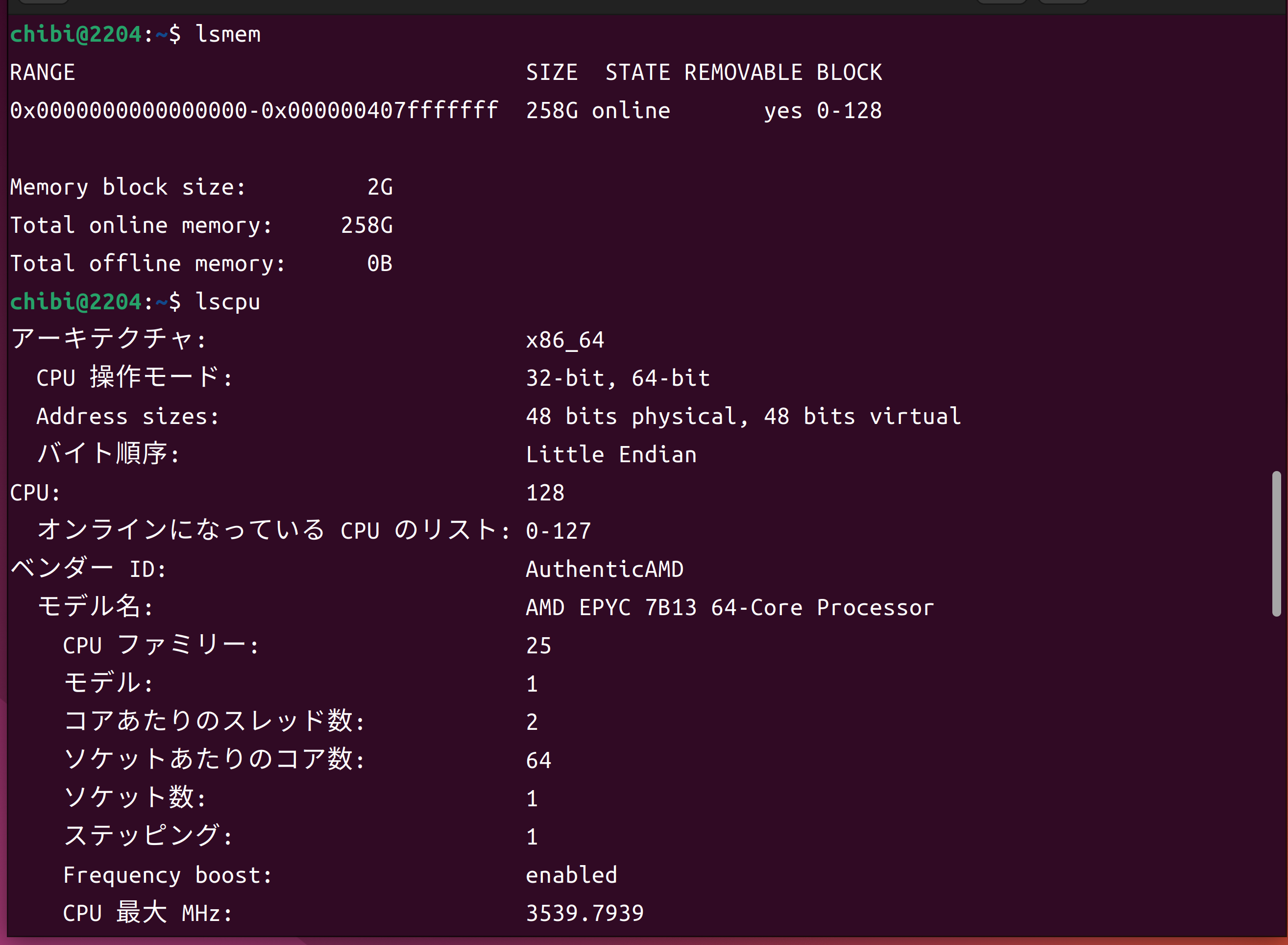 - 第3世代 AMD EPYC 7B13 64-Core Processor 128Threads 256GB TITAN RTX EDILOCA EN605 256GBで構成された Ubuntu 22.04.5 LTS へ CUDA.12.8.0をInstall して nvidia-smi nvcc -V cat /etc/os-release lsmem sensors nvme list nvme smart-log /dev/nmve0n1 lscpuを設定した