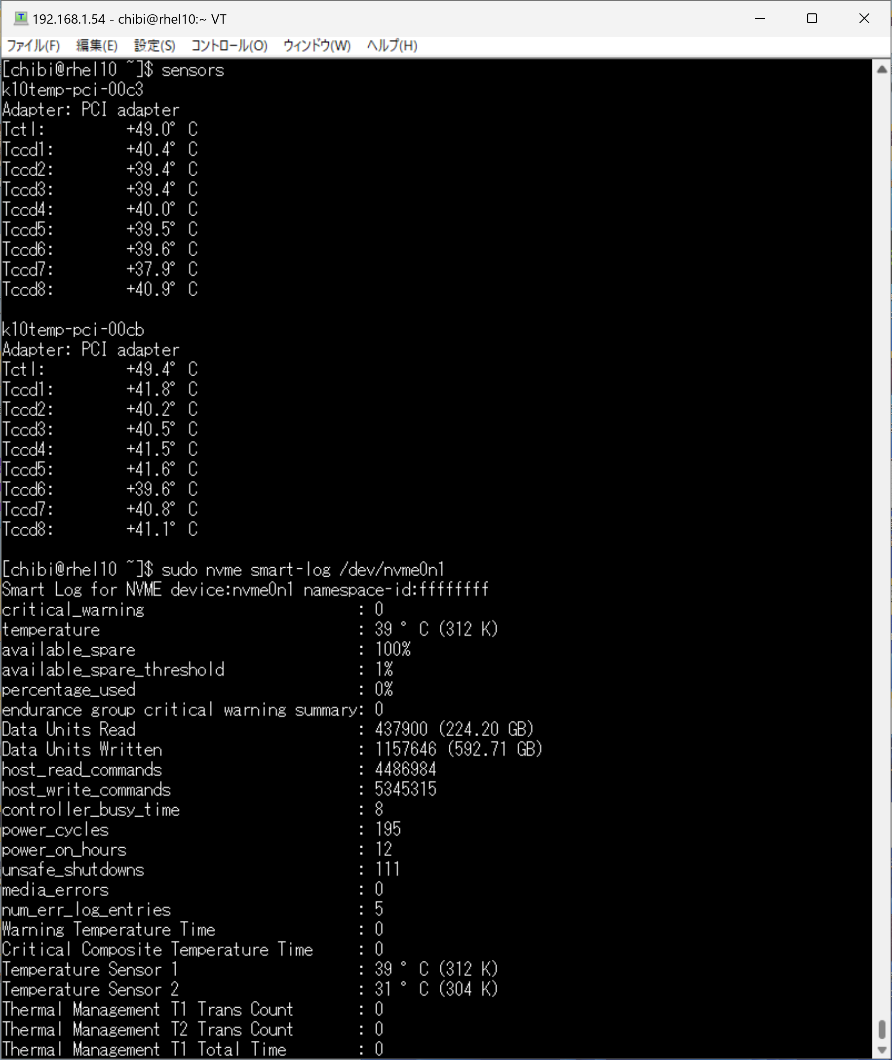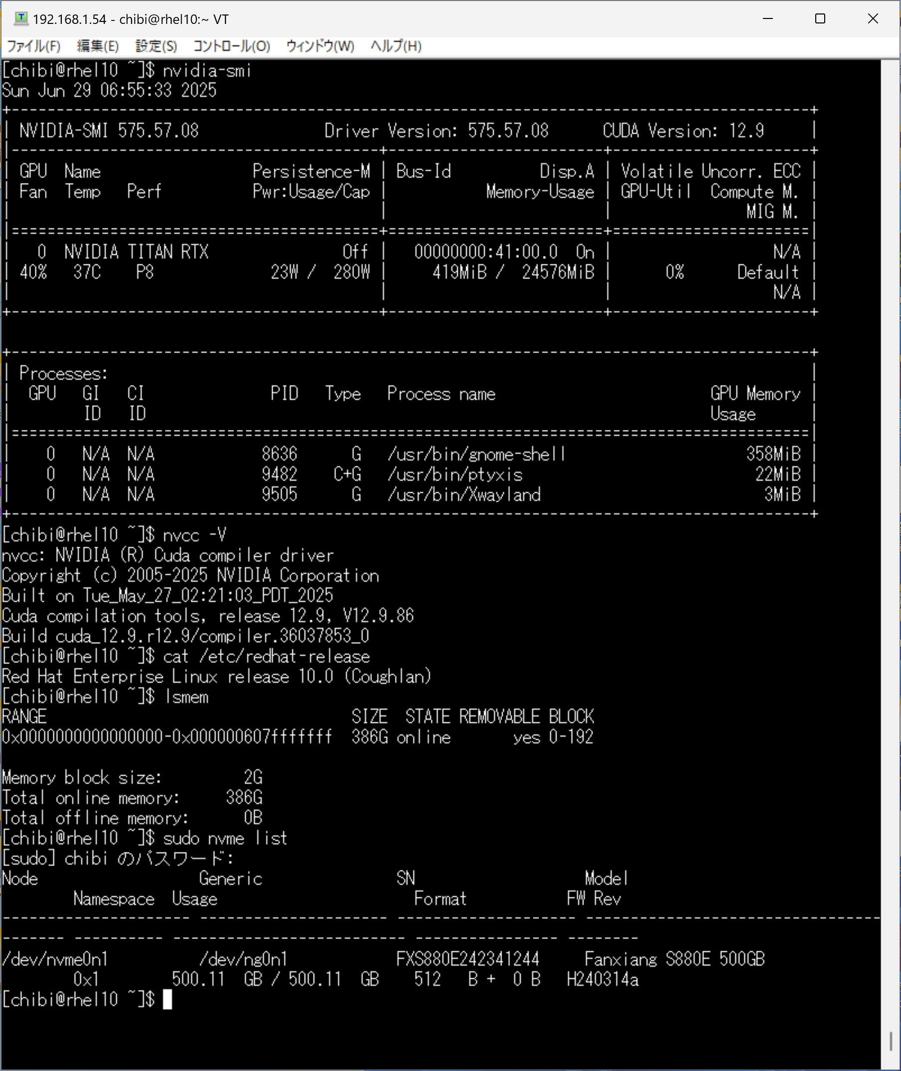 - 第4世代 AMD EPYC 9754 x2CPU 256-Core Processor 512Threads 384GB TITAN RTX Fanxiang S880E 500GBで構成されたRed Hat Enterprise Linux release 10.0 へ CUDA-toolkit 12.9.1をInstall してnvidia-smi nvcc -V cat /etc/redhat-release lsmem nvme list sensors nvme smart-log /dev/nvme0n1 lscpuを設定してみた