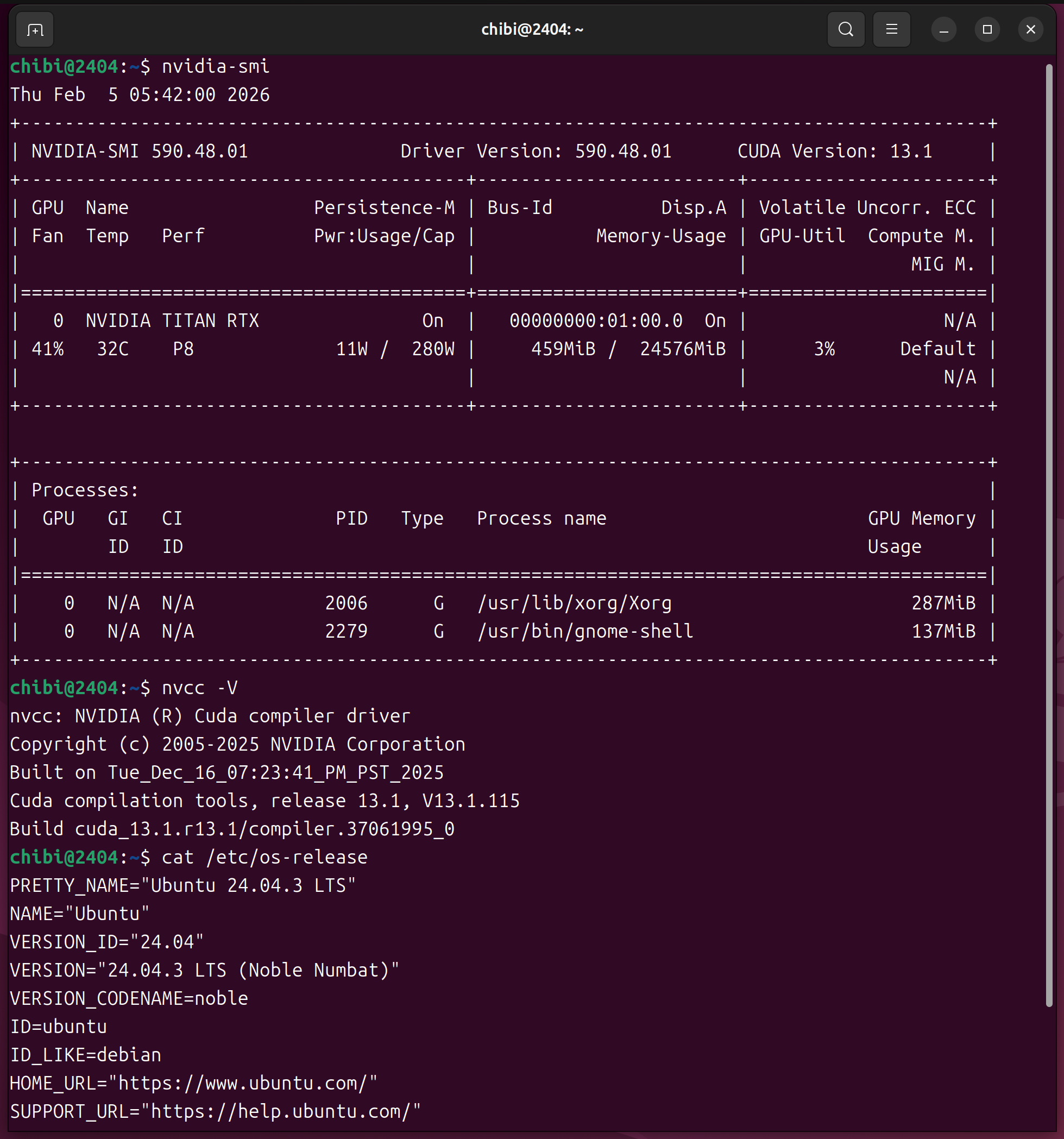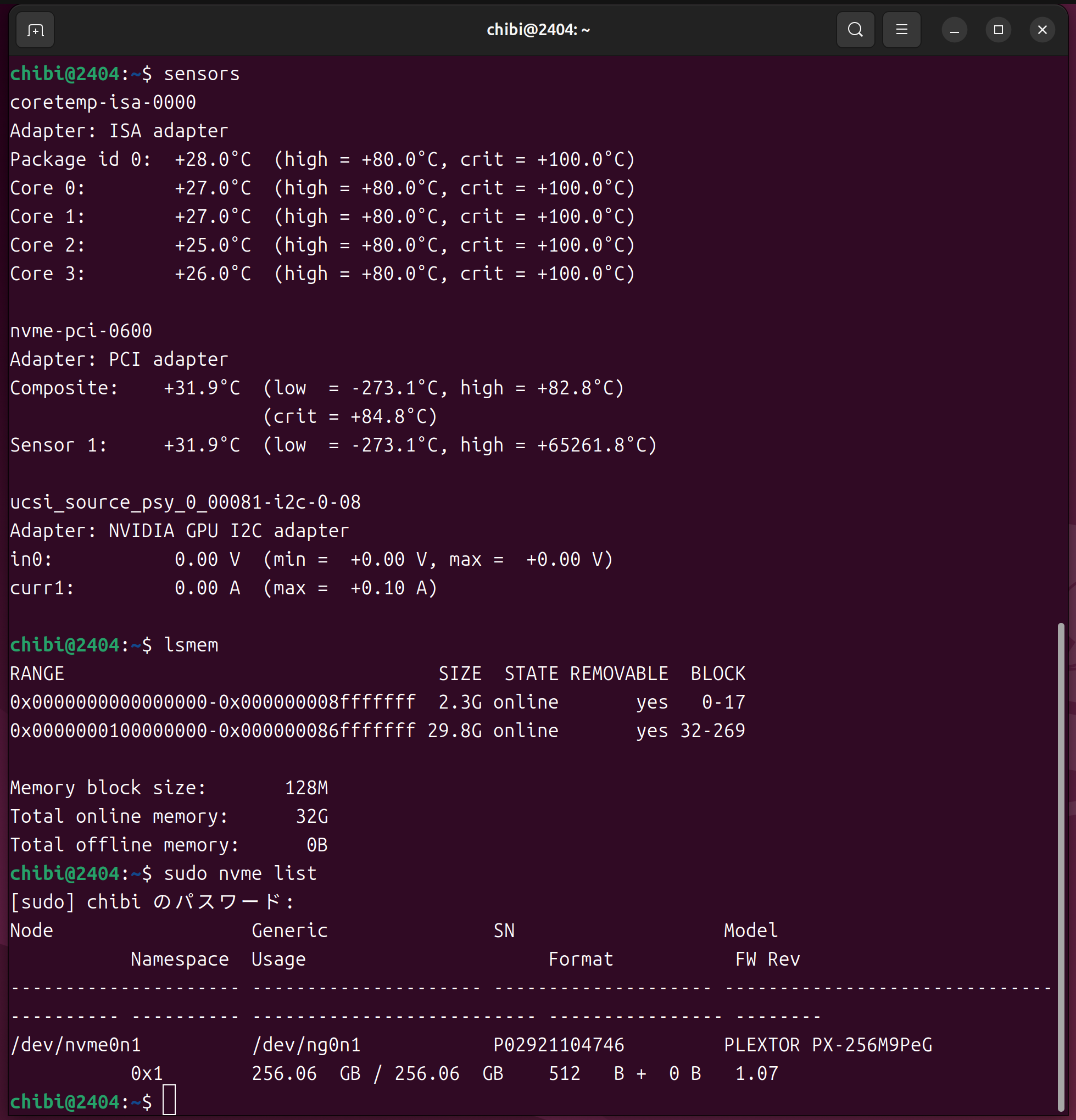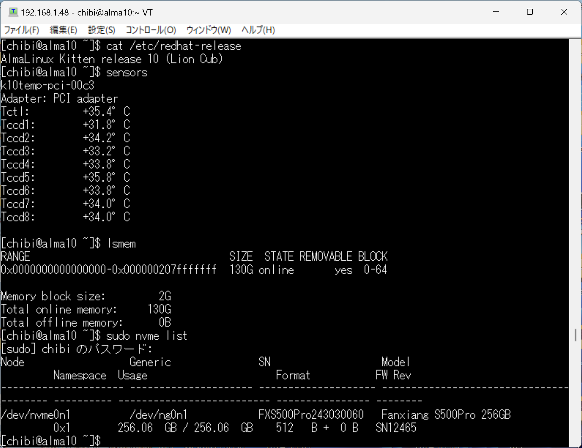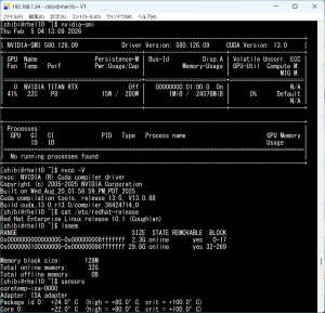 - Intel(R) Core(TM) i7-6700K CPU @ 4.00GHz 4core 8threds 16GB TITAN RTX PLEXTOR PX-256M9PeG で構成されたRed Hat Enterprise Linux release 10.1へ CUDA-toolkit 13.0をInstall して nvidia-smi nvcc -V cat /etc/redhat-release lsmem sensors nvme list nvme-smart-log /dev/nvme0n1 lscpuを設定した