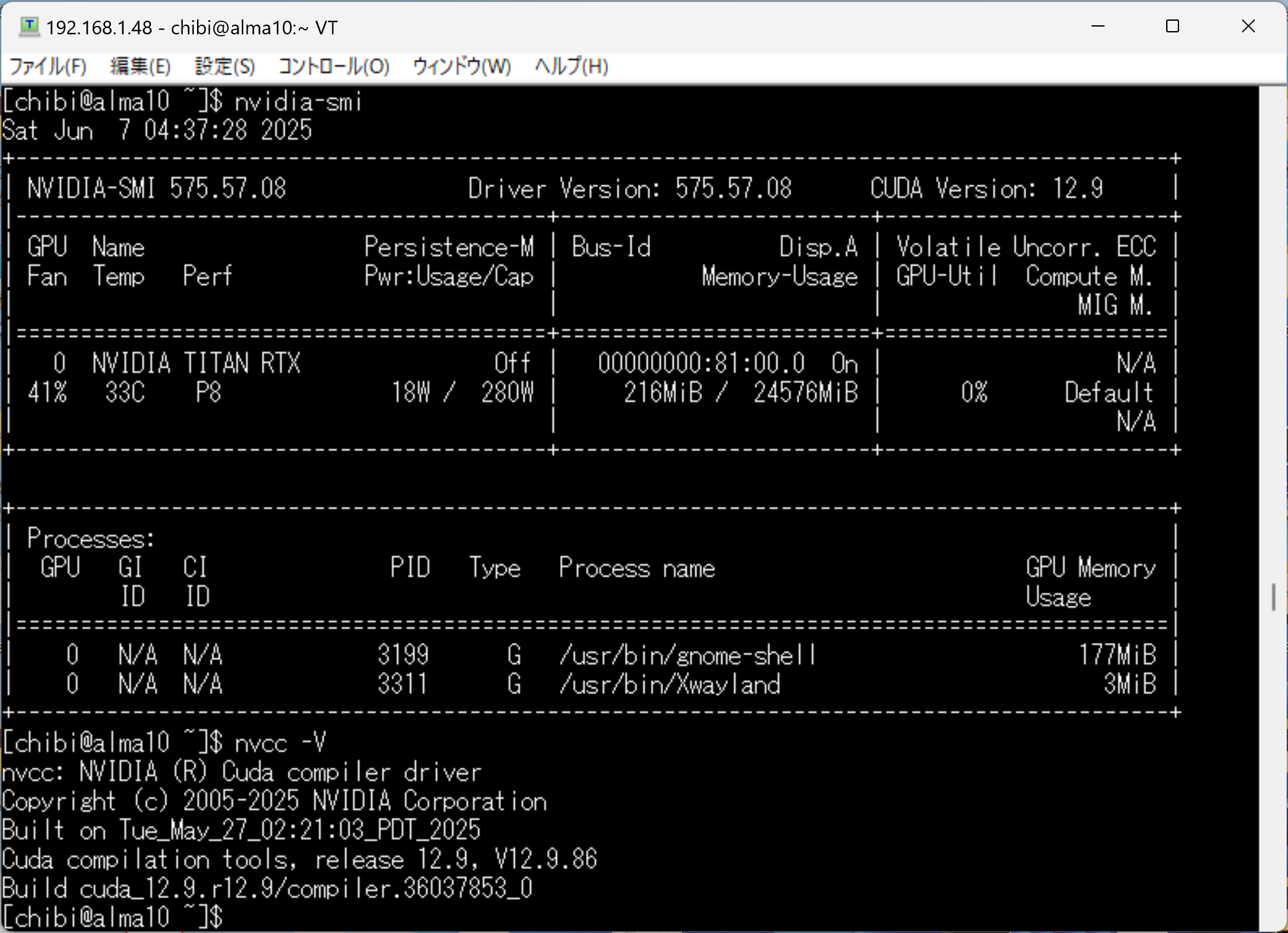- 第2世代 AMD EPYC 7742 64-Core Processor 128Threads 256GB RTX2080Ti PLEXTOR PX-256M9PeG 256GBで構成された Red Hat Enterprise Linux release 9.6へ CUDA-toolkit 12.9.0をInstall してnvidia-smi nvcc -V cat /etc/redhat–release lsmem nvme list nvme smart-log /dev/nvme0n1 sensors lscpuを設定してみた