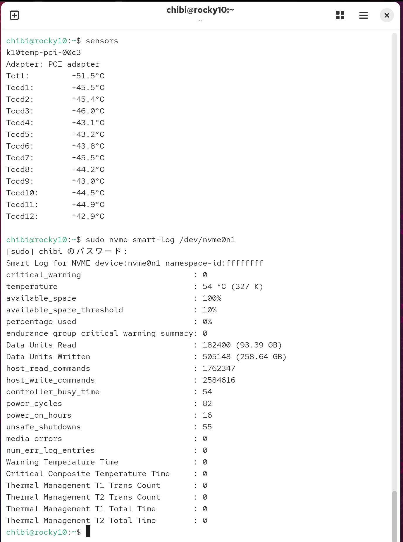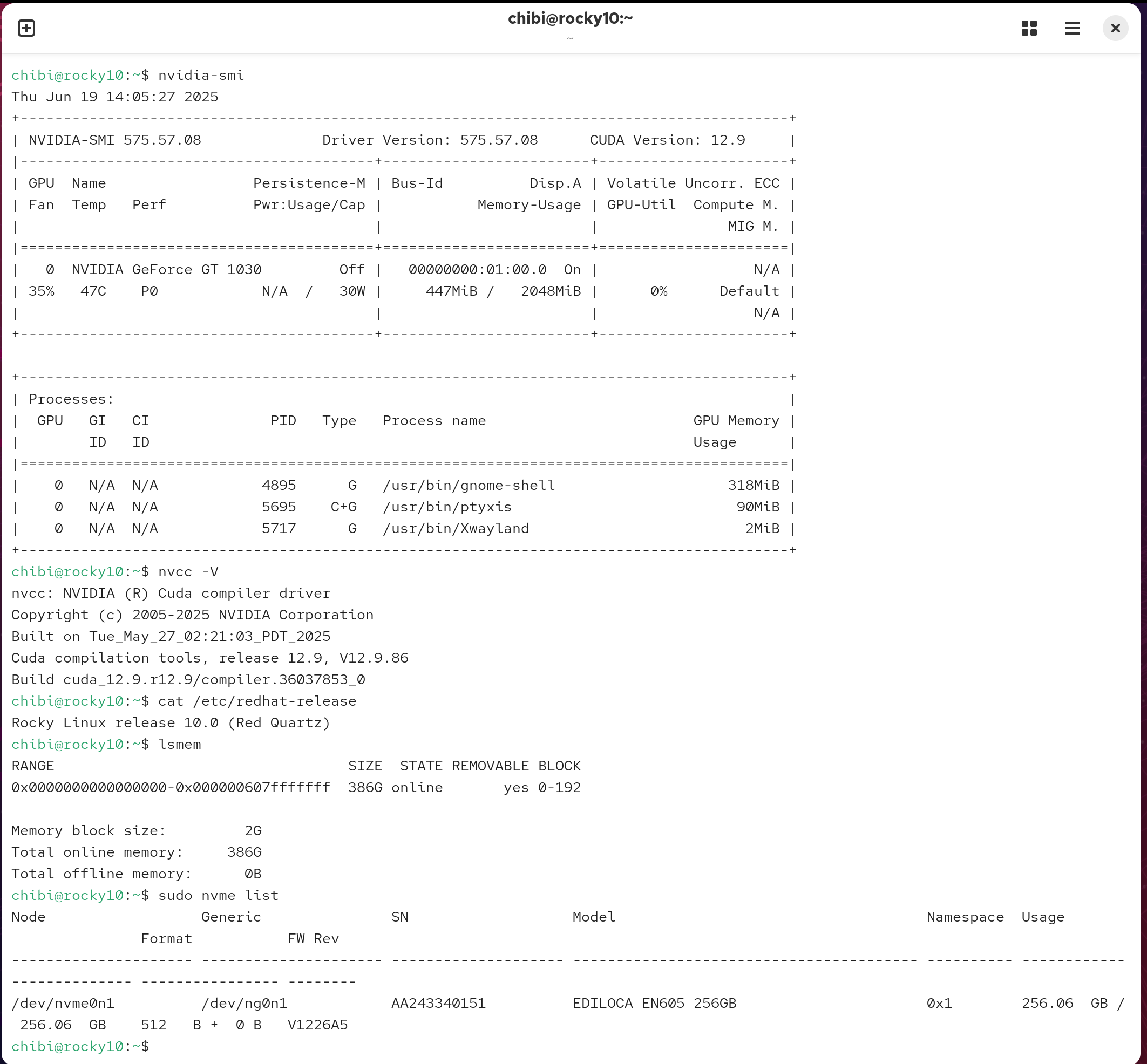 - 第4世代 AMD EPYC 9654P 96-Core Processor 192Threads 384GB GT1030 EDILOCA EN605 256GB で構成された Rocky Linux release 10.0 へ CUDA-toolkit 12.9.1をInstall して nvidia-smi nvcc -V cat /etc/redhat-release lsmem nvme list sensors nvme-smart-log /dev/nvme0n1 lscpuを設定してみた