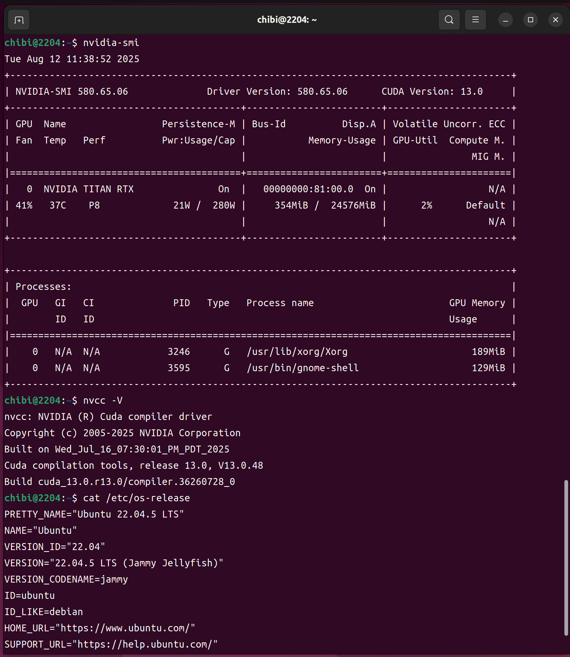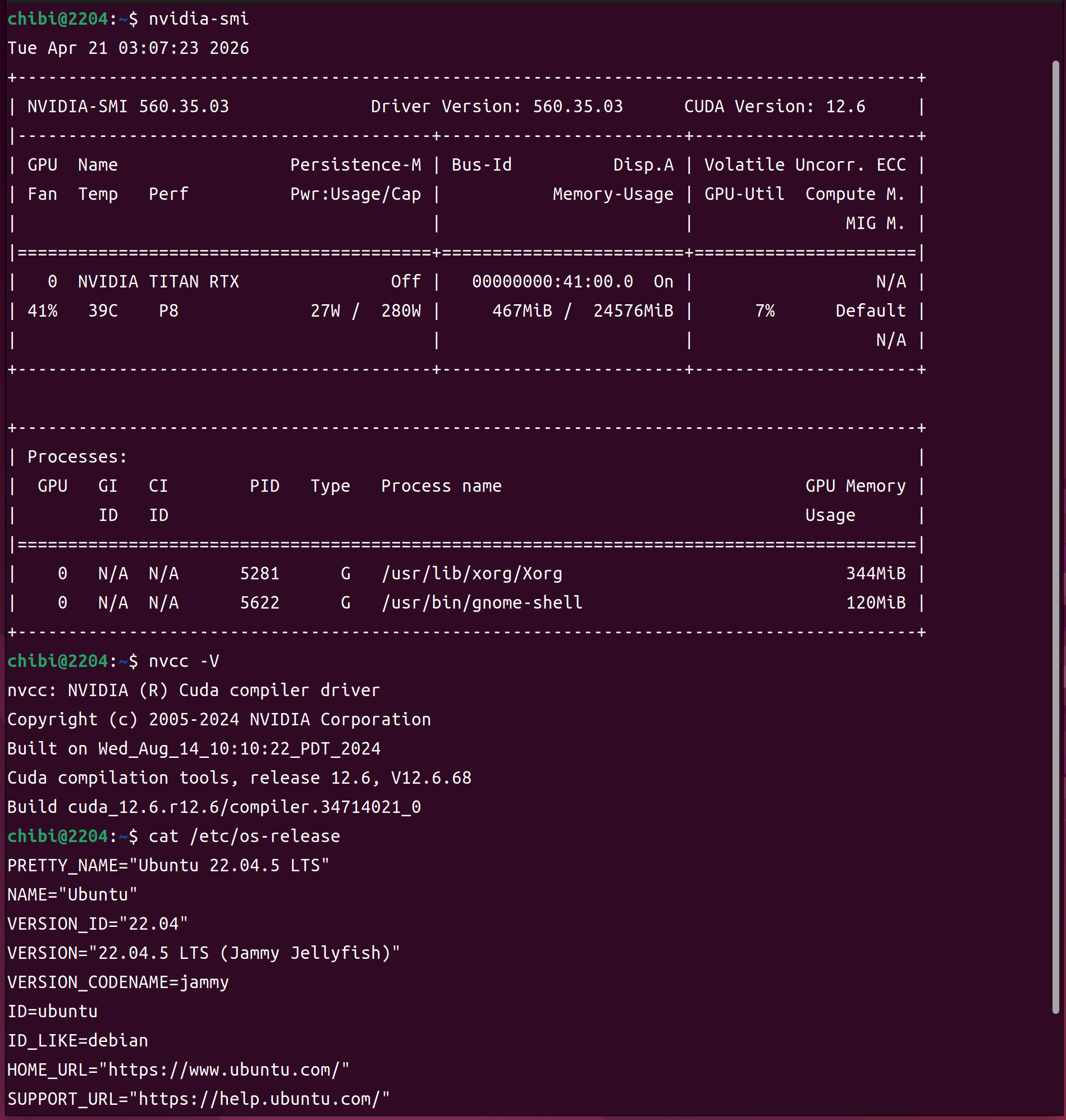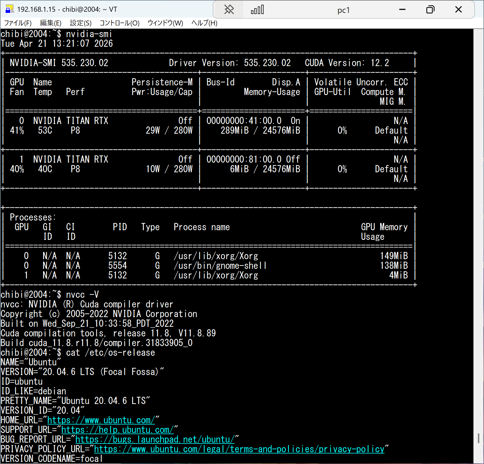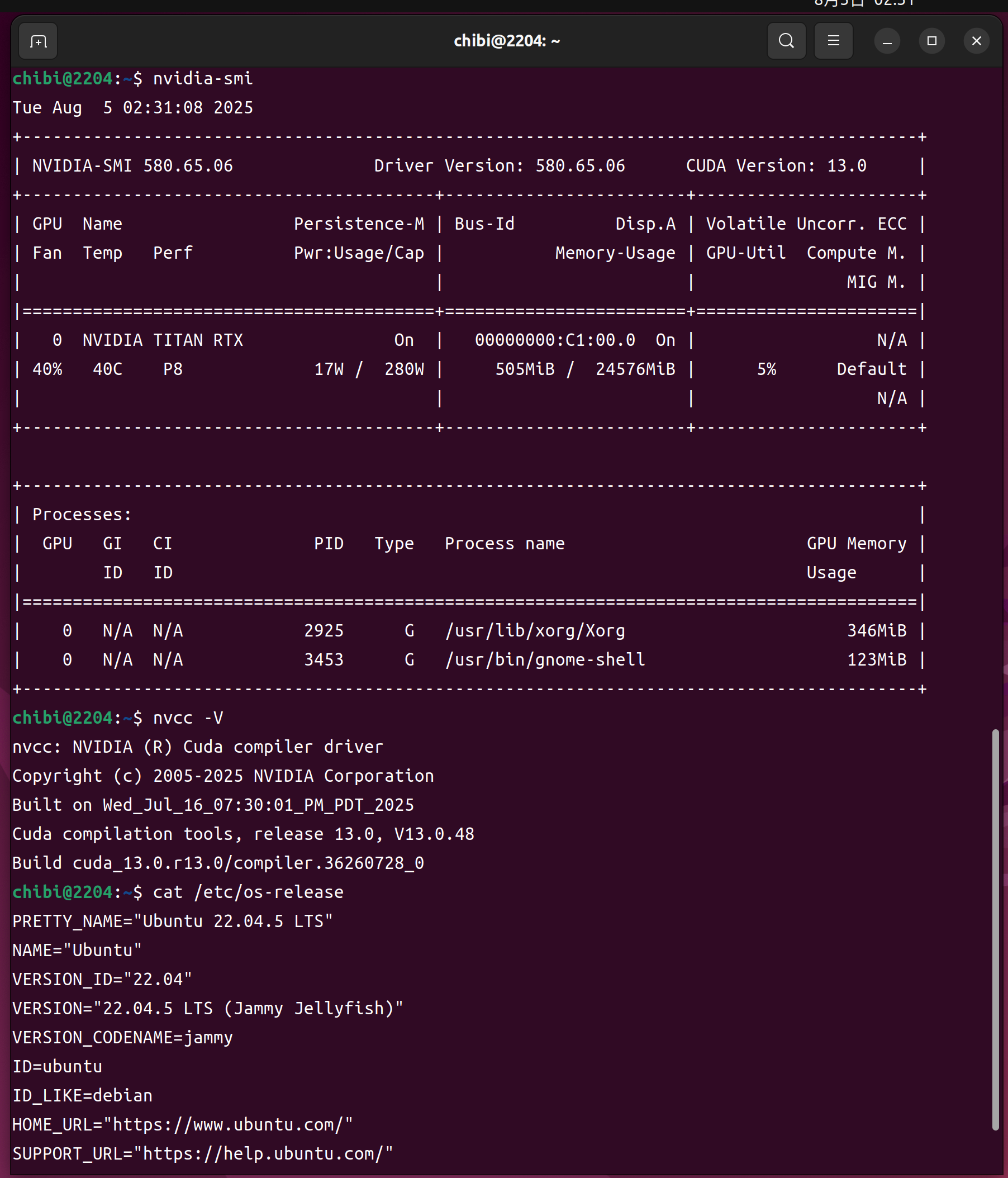 - Intel(R) Core(TM) i7-6700K CPU @ 4.00GHz 4core 8threds 32GB RTX2080Ti PLEXTOR PX-256M9PeGで構成されたUbuntu24.04.3 LTS へ CUDA-toolkit 12.5をInstall してnvidia-smi nvcc -V cat /etc/os-release sensors lsmem nvme list nvme smart-log /dev/nmve0n1 lscpuを設定 に 丸山泰男 より