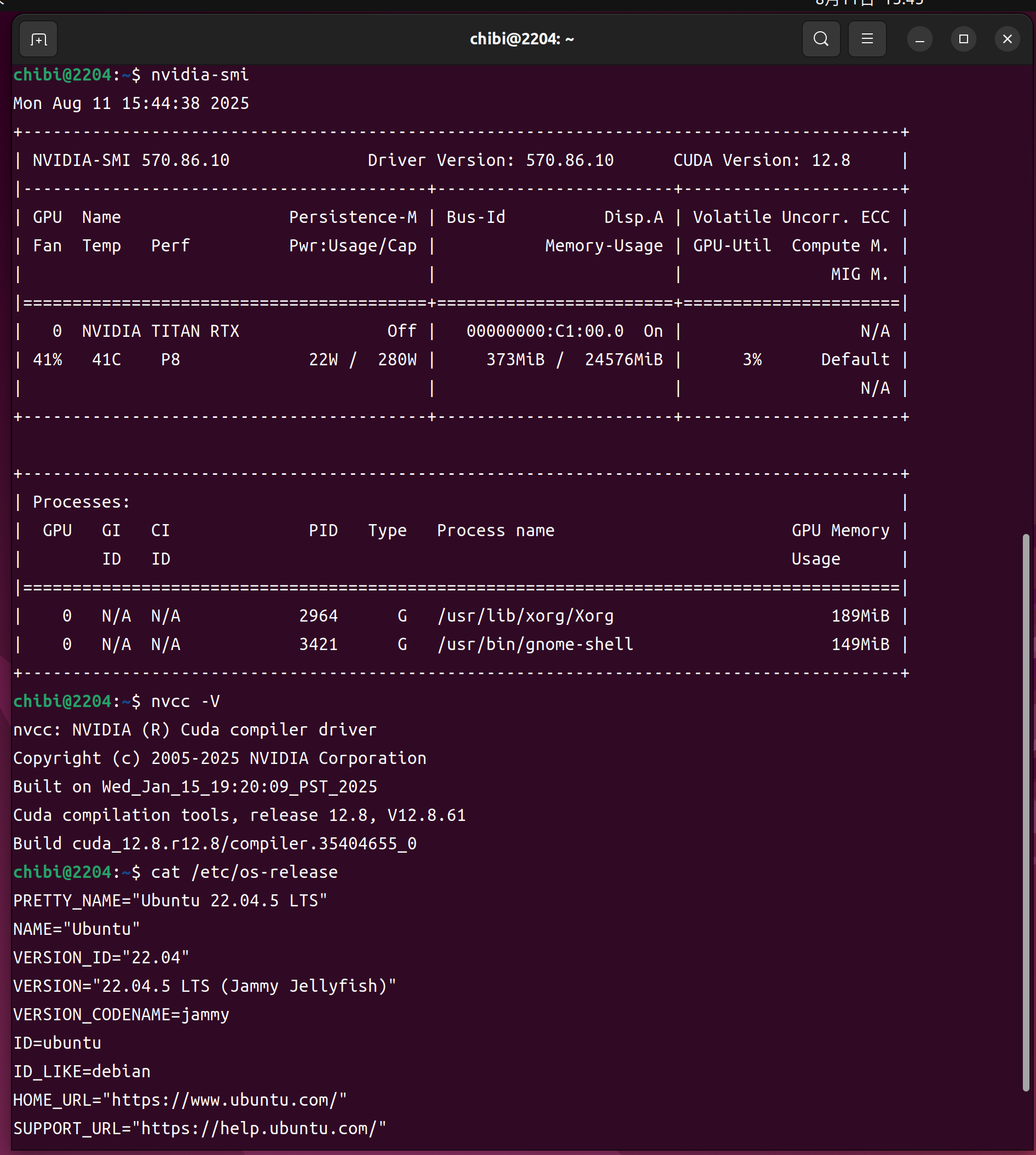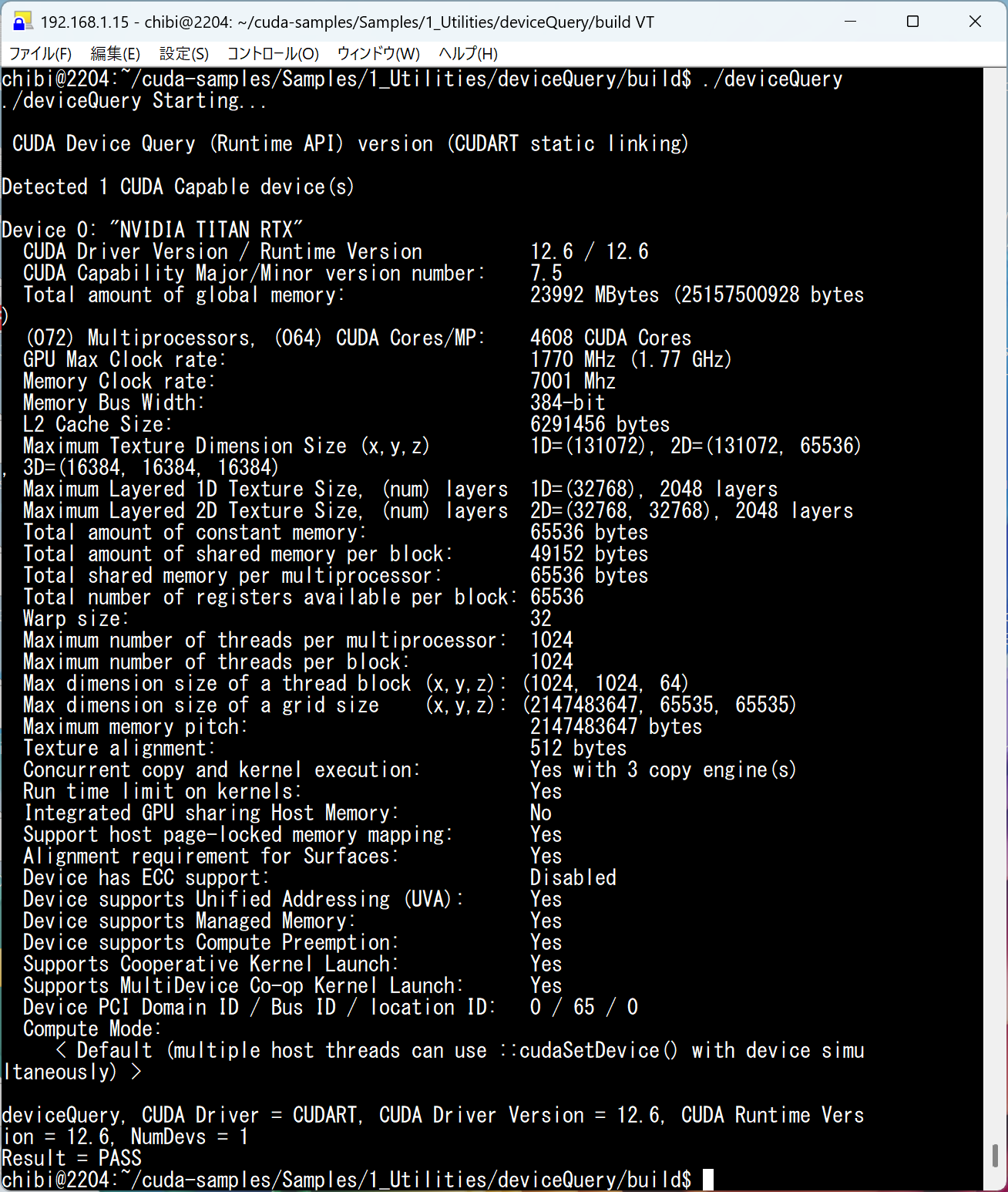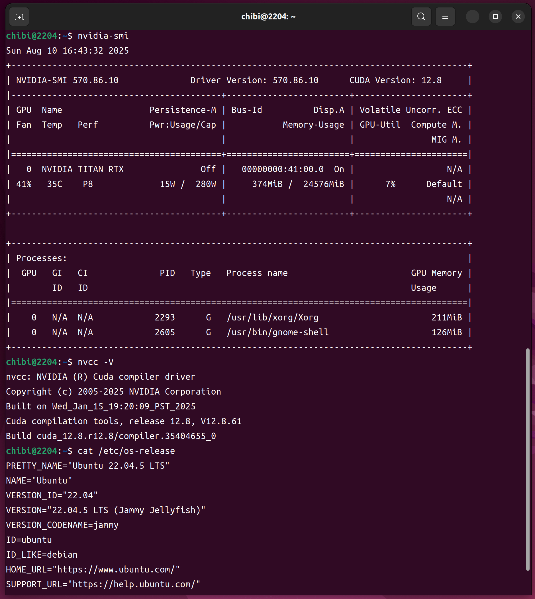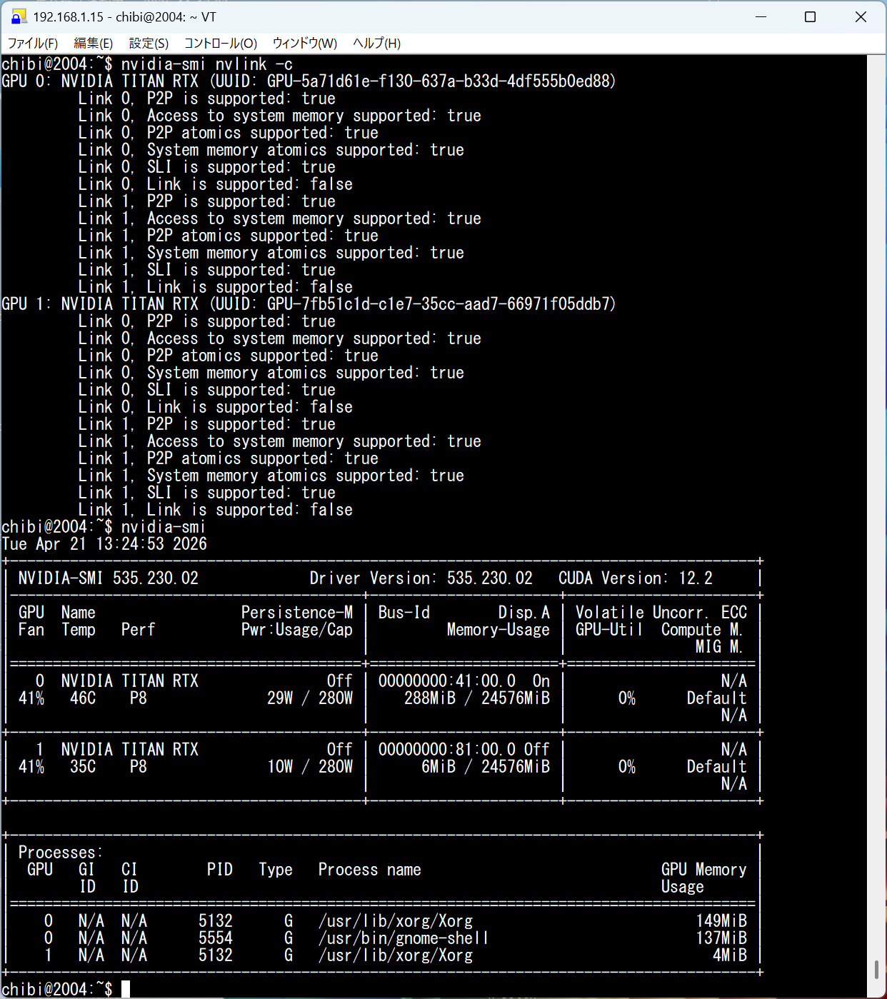 - Intel(R) Core(TM) i7-6700K CPU @ 4.00GHz 4core 8threds 32GB RTX2080Ti PLEXTOR PX-256M9PeGで構成されたUbuntu24.04.3 LTS へ CUDA-toolkit 12.5をInstall してnvidia-smi nvcc -V cat /etc/os-release sensors lsmem nvme list nvme smart-log /dev/nmve0n1 lscpuを設定 に 丸山泰男 より