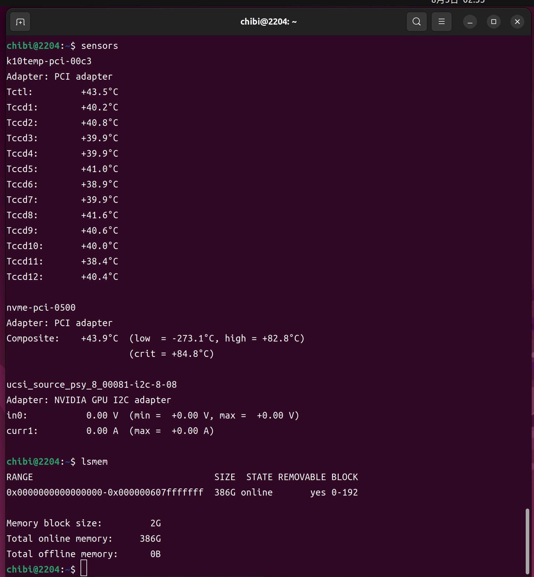 - 第4世代 AMD EPYC 9334 32-Core Processor 64Threads 192GB TITAN RTX Fanxiang S500Pro 256GB で構成された Ubuntu 22.04.5 LTS へ CUDA-toolkit 12.8.0をInstall して nvidia-smi nvcc -V cat /etc/os-release sensors lsmem nvme list nvme-smart-log /dev/nvme0n1 lscpuを設定してみた
