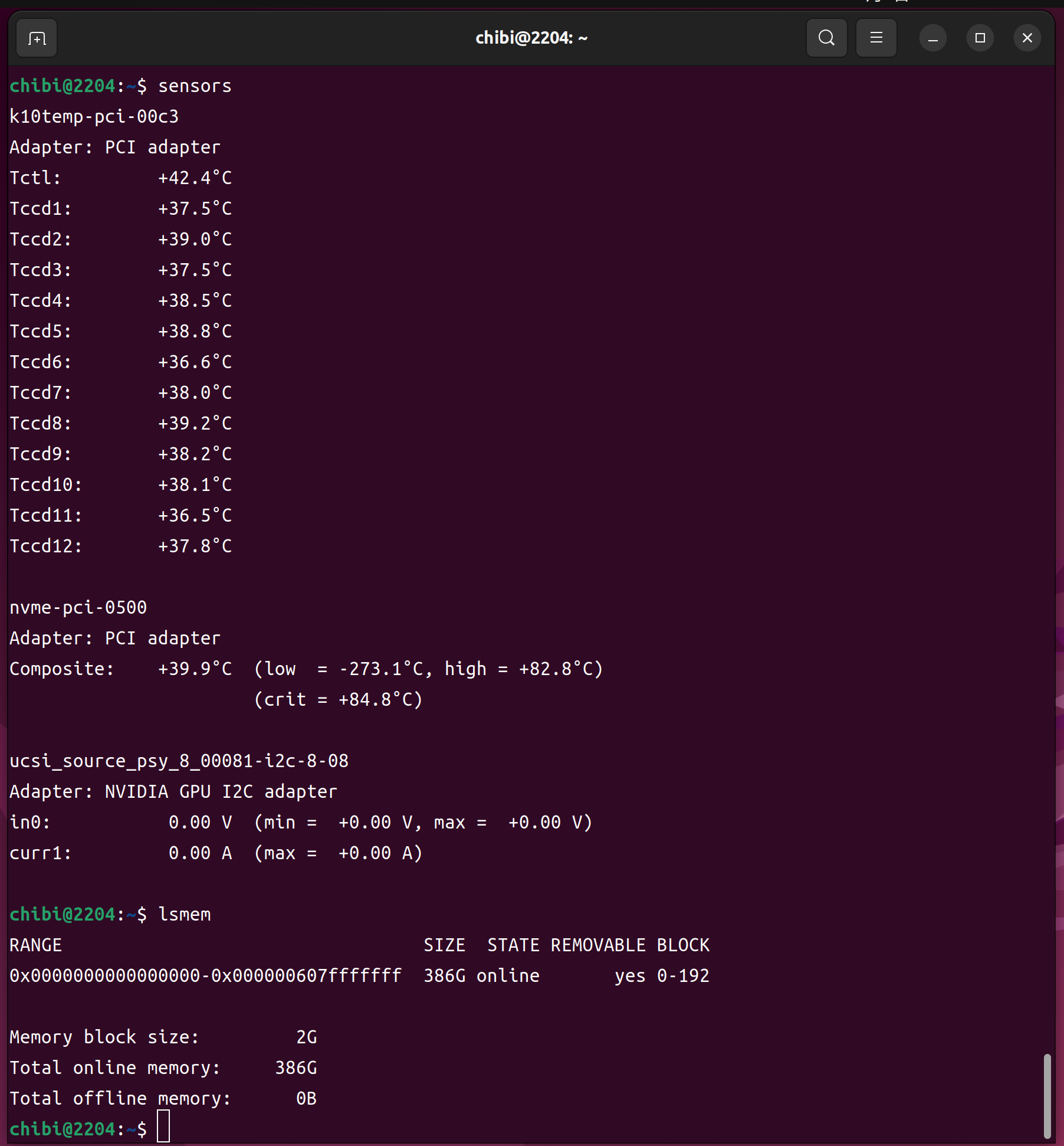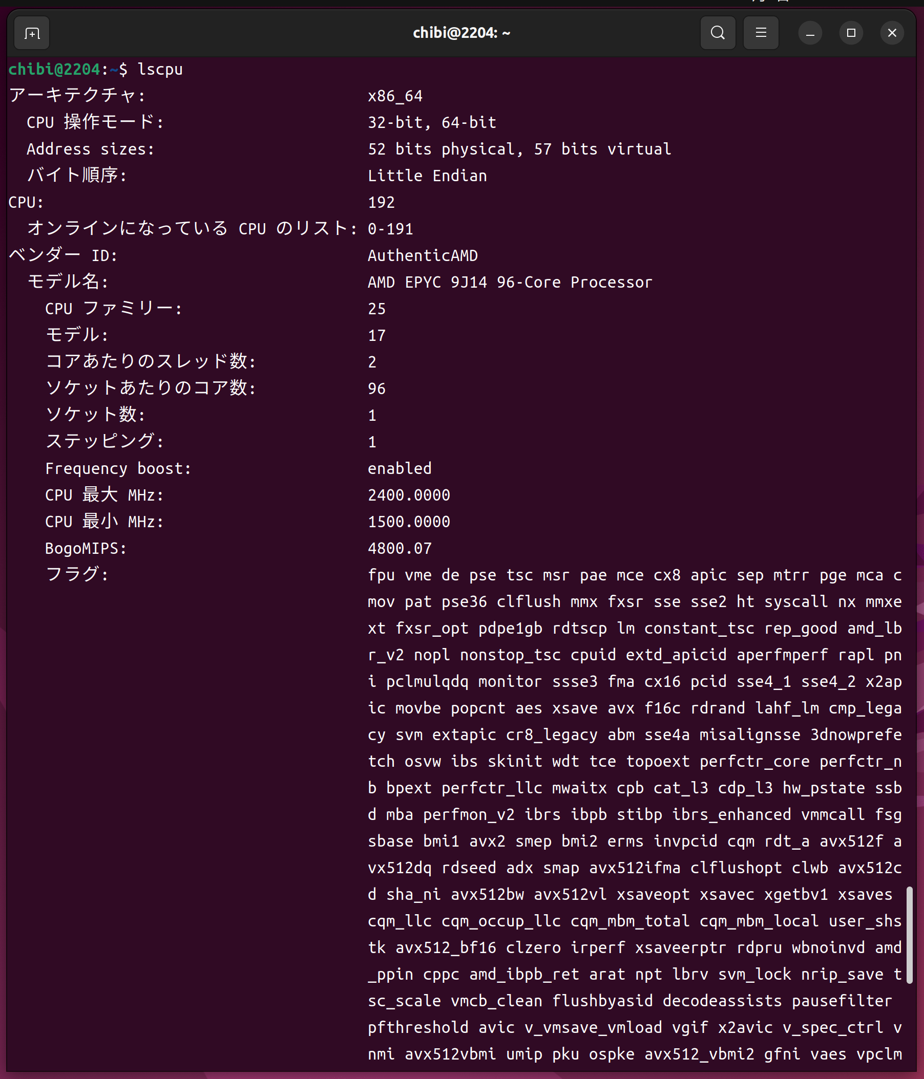 - 第4世代 AMD EPYC 9J14 96-Core Processor 192Threads 384GB TITAN RTX EDILOCA EN605 256GB で構成された Ubuntu 22.04.5 LTS へ CUDA-toolkit 13.0をInstall して nvidia-smi nvcc -V cat /etc/os-release sensors lsmem nvme list nvme-smart-log /dev/nvme0n1 lscpuを設定してみた