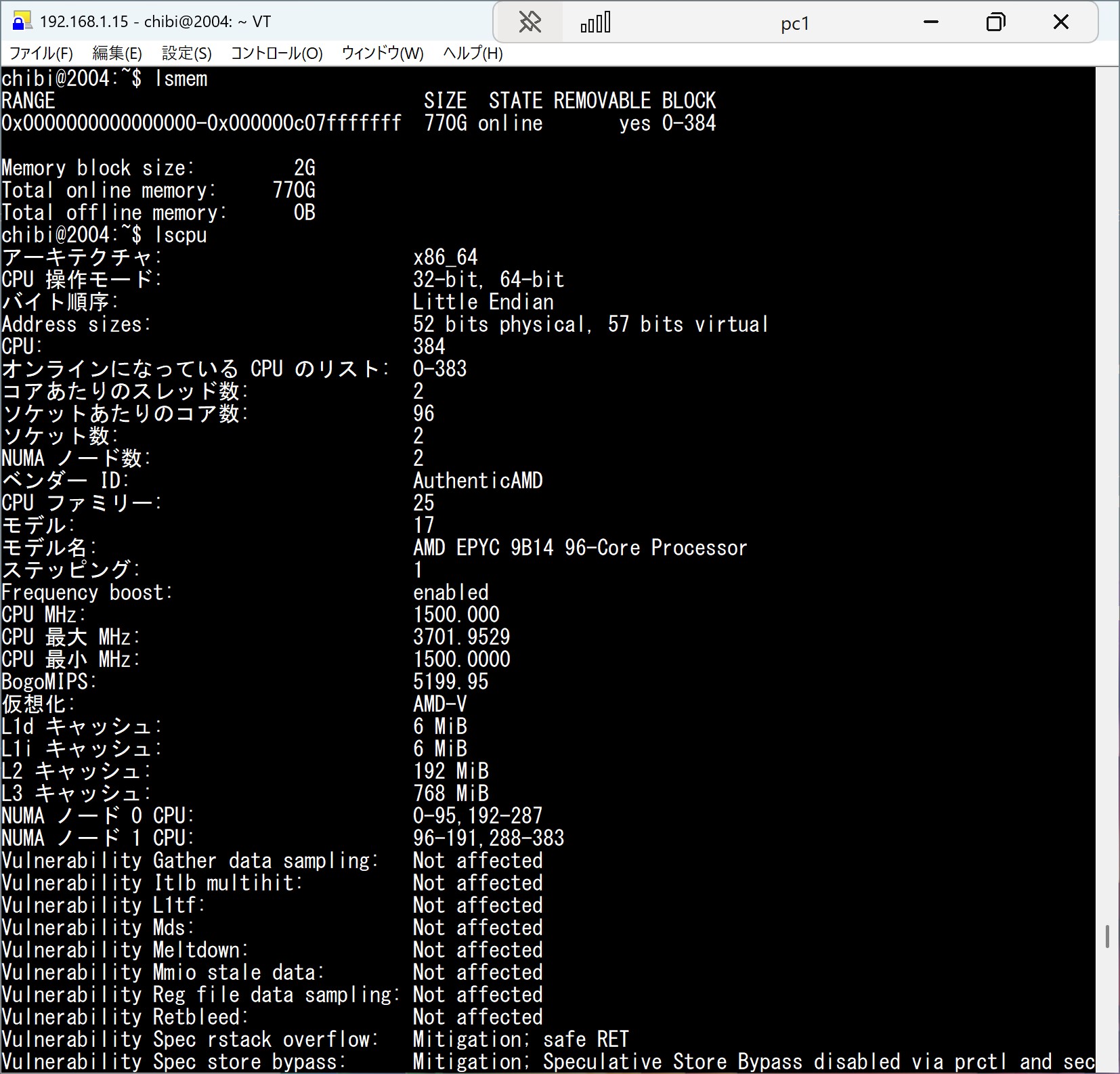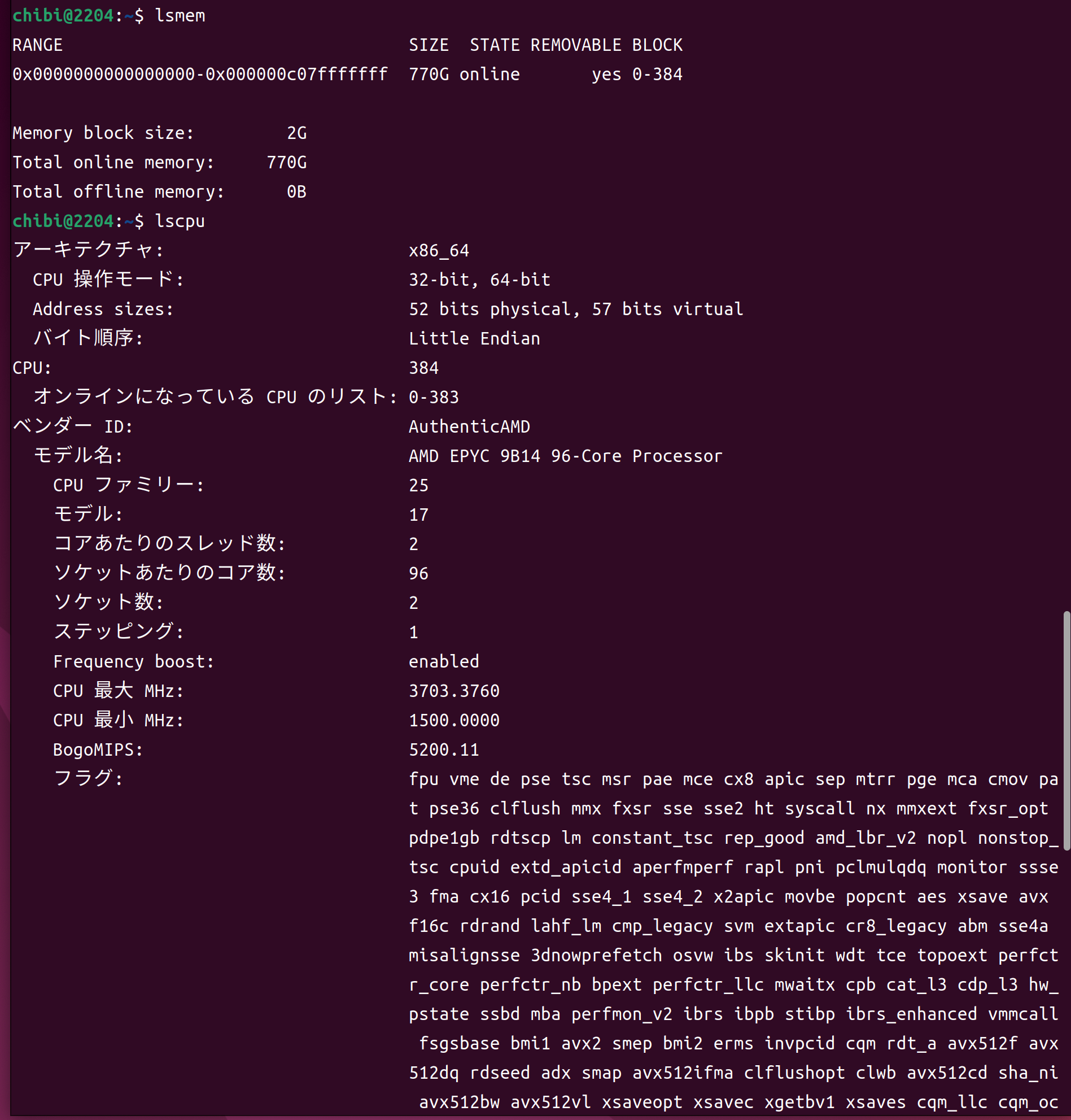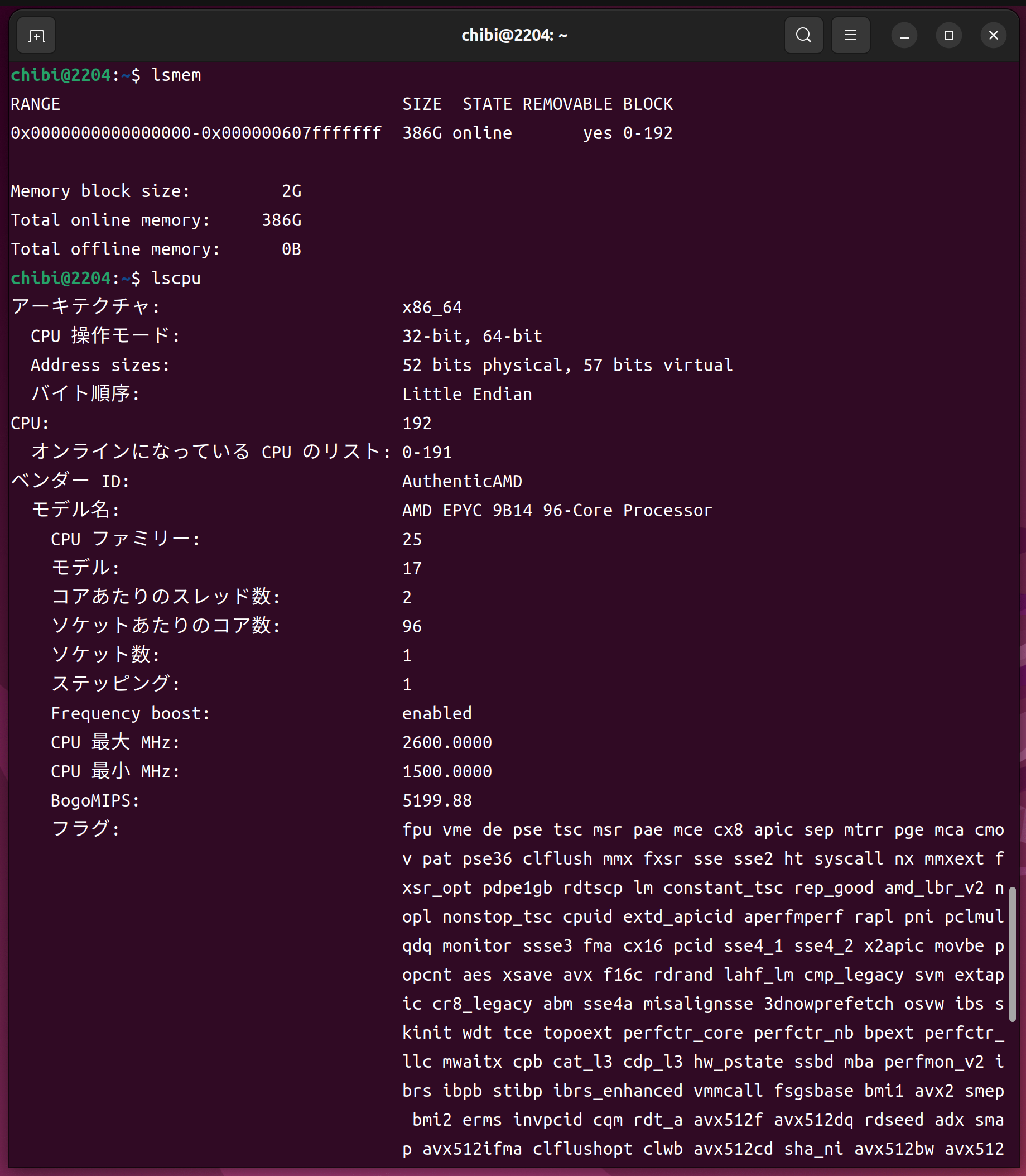 - 第4世代 AMD EPYC 9B14 96-Core Processor 192Threads 384GB TITAN RTX Fanxiang S500Pro 256GB で構成された Ubuntu22.04.5 LTS へ CUDA-toolkit 13.0 をInstall して nvidia-smi nvcc -V cat /etc/os-release sensors nvme list nvme-smart-log /dev/nvme0n1 lsmem lscpuを設定してみた