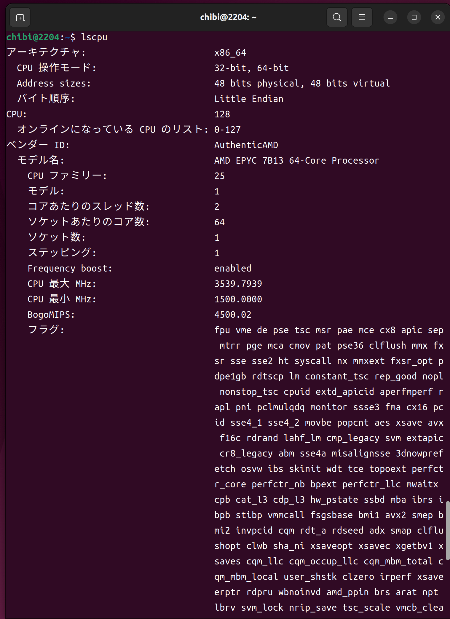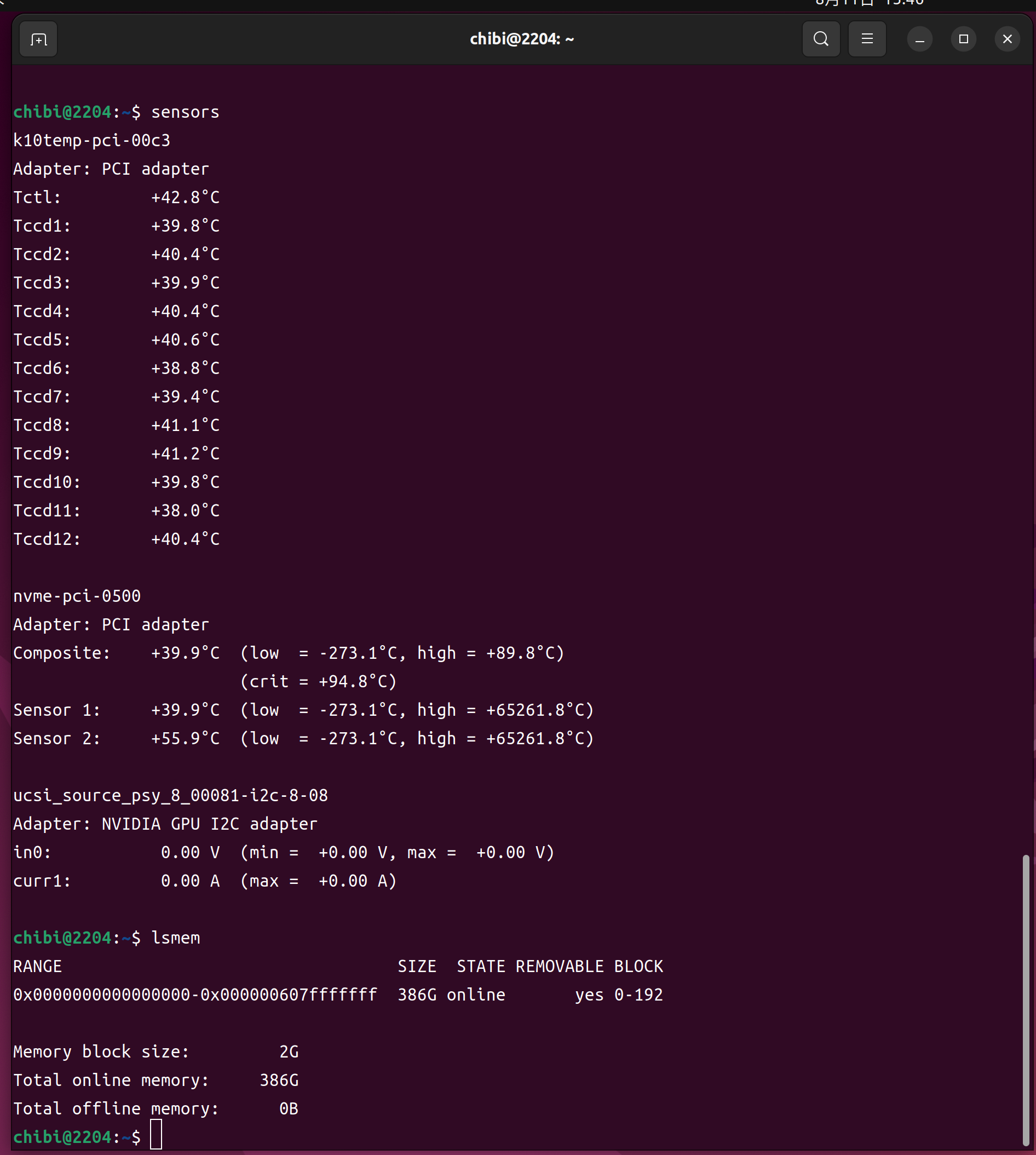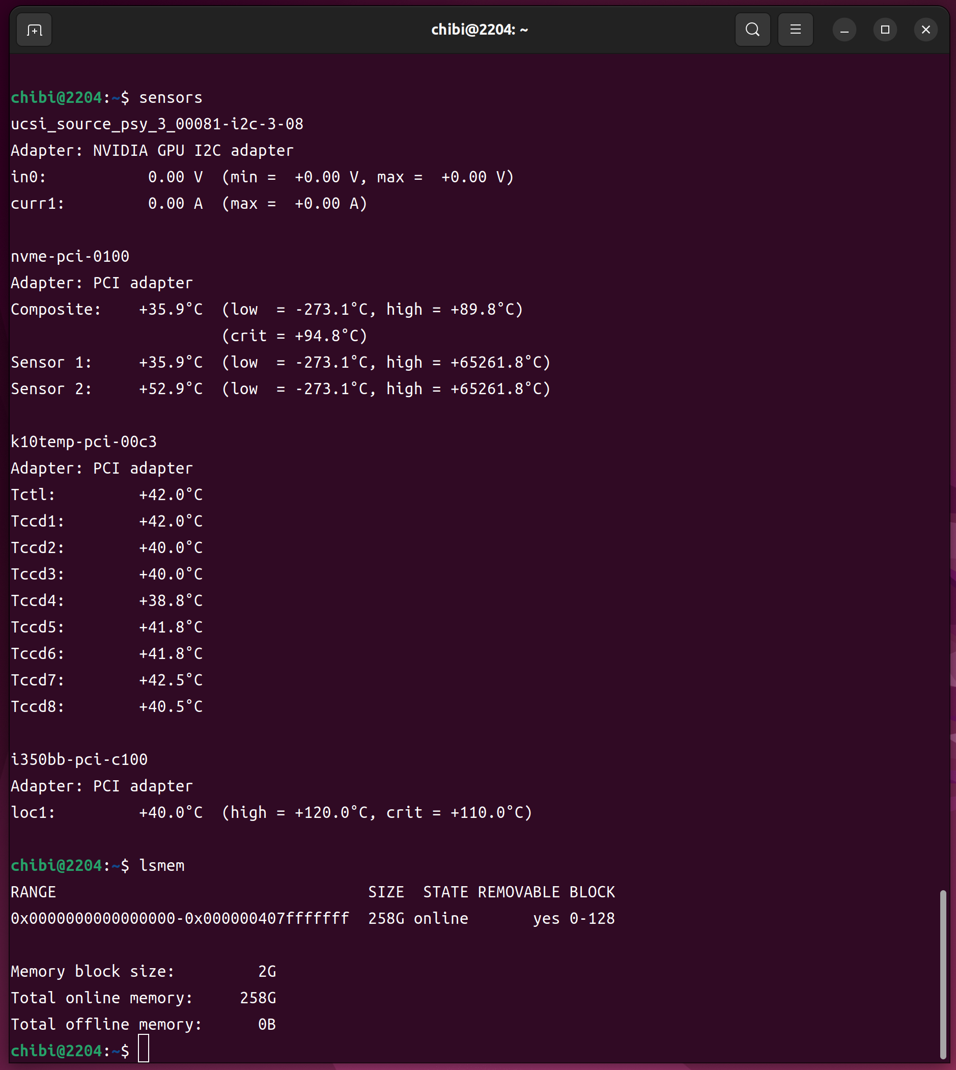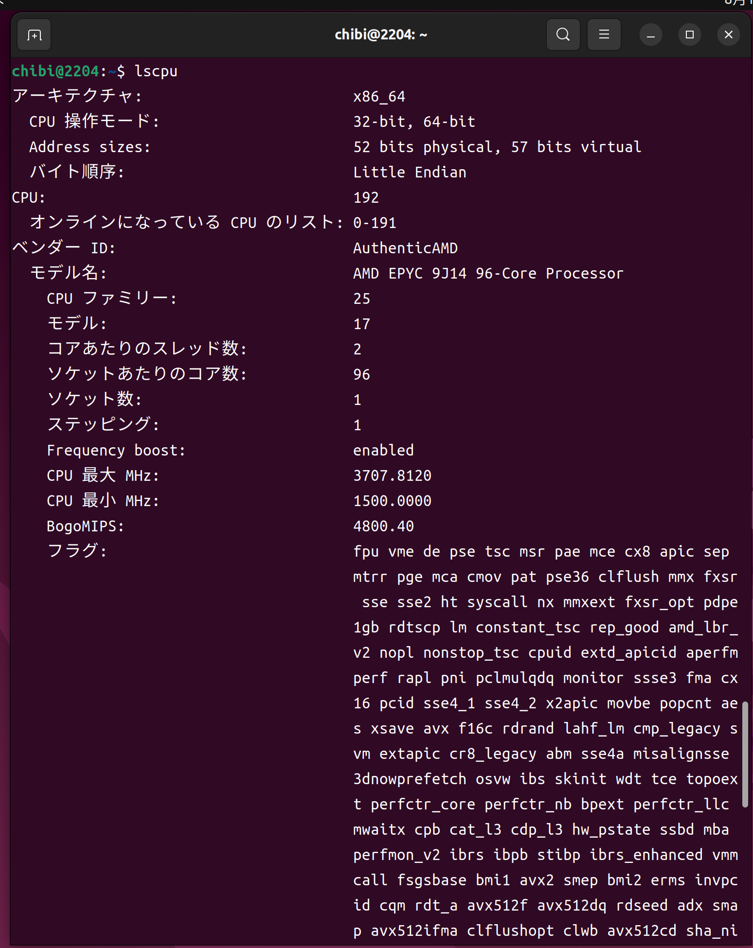 - 第4世代 AMD EPYC 9B14 96-Core Processor 192Threads 384GB TITAN RTX Fanxiang S500Pro 256GB で構成された Ubuntu22.04.5 LTS へ CUDA-toolkit 13.0 をInstall して nvidia-smi nvcc -V cat /etc/os-release sensors nvme list nvme-smart-log /dev/nvme0n1 lsmem lscpuを設定してみた
