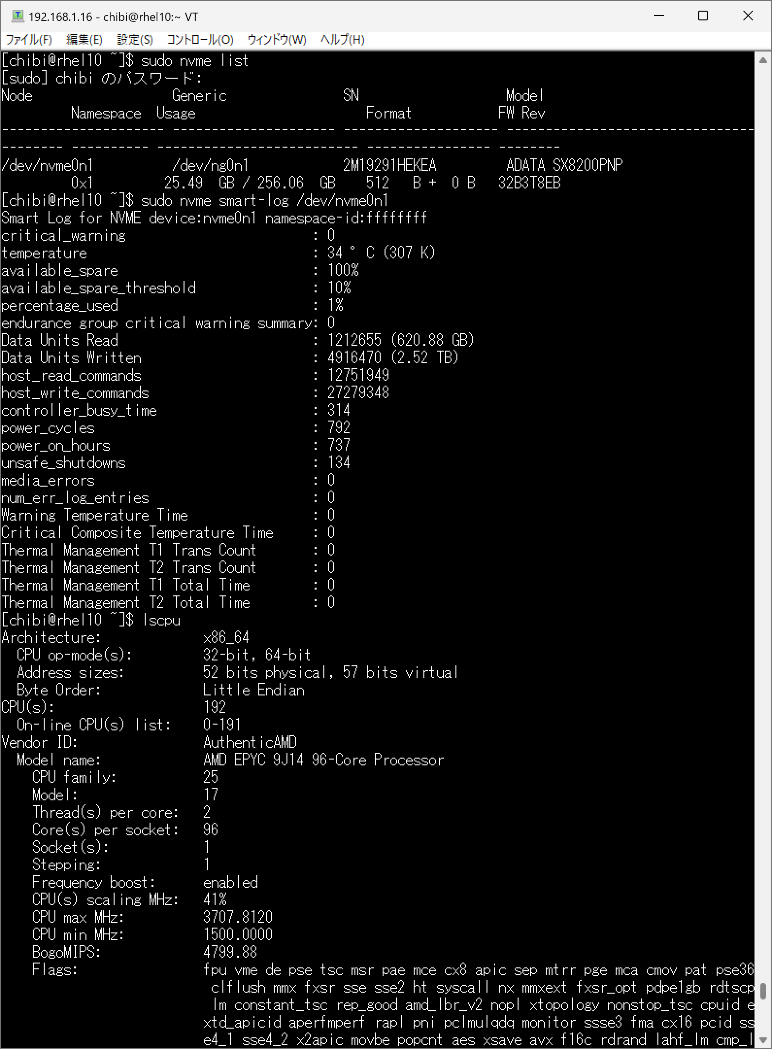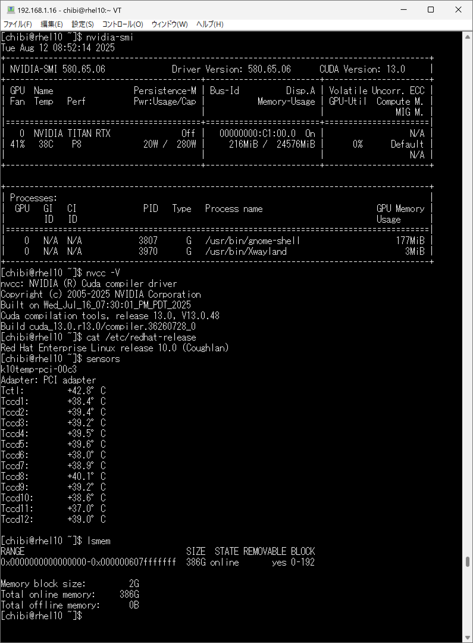 - 第4世代 AMD EPYC 9J14 96-Core Processor 192Threads 384GB TITAN RTX ADATA SX8200PNP 256GB で構成された Red Hat Enterprise Linux release 10.0 へ CUDA-toolkit 13.0をInstall して nvidia-smi nvcc -V cat /etc/redhat-release sensors lsmem nvme list nvme-smart-log /dev/nvme0n1 lscpuを設定してみた
