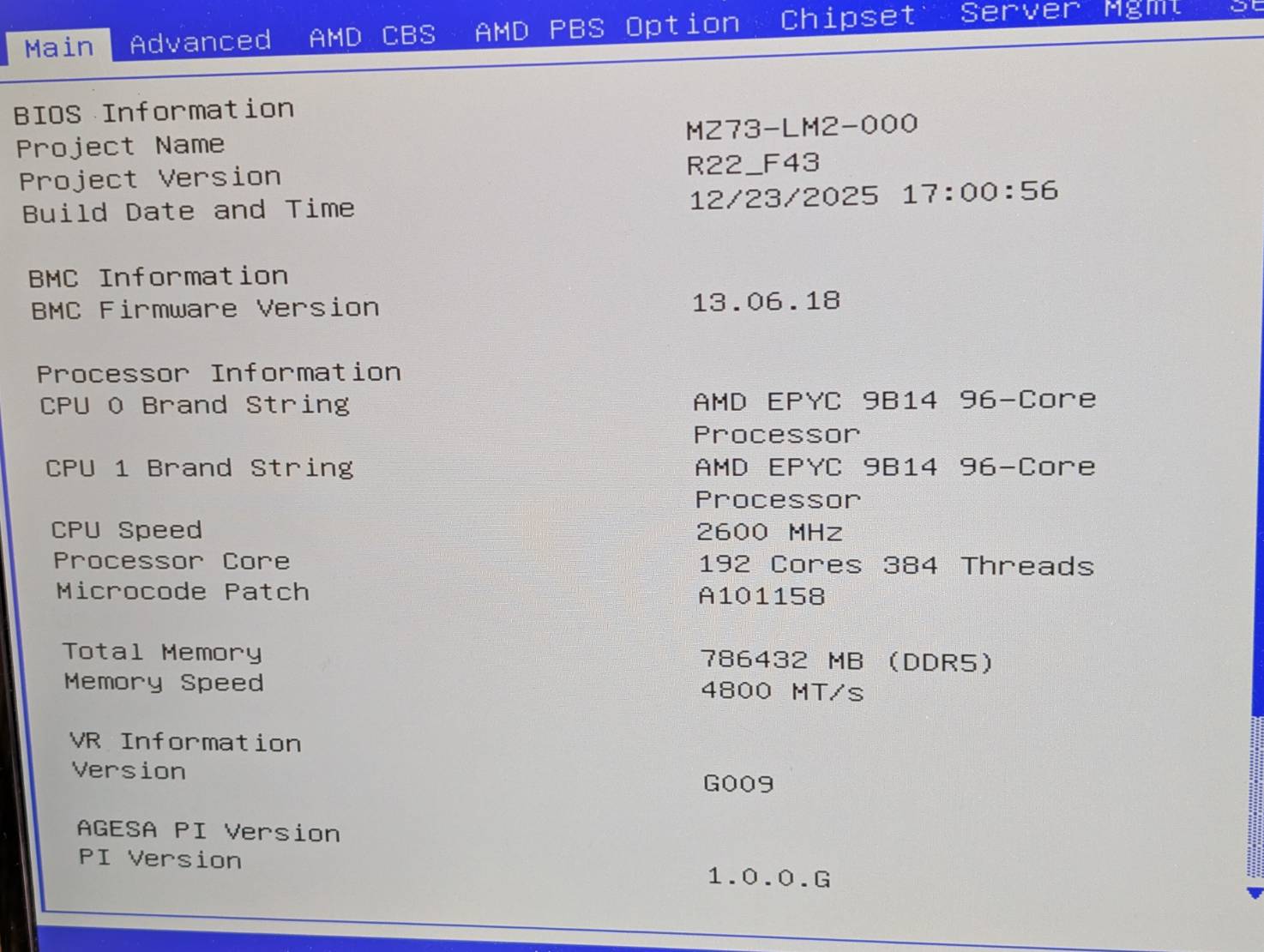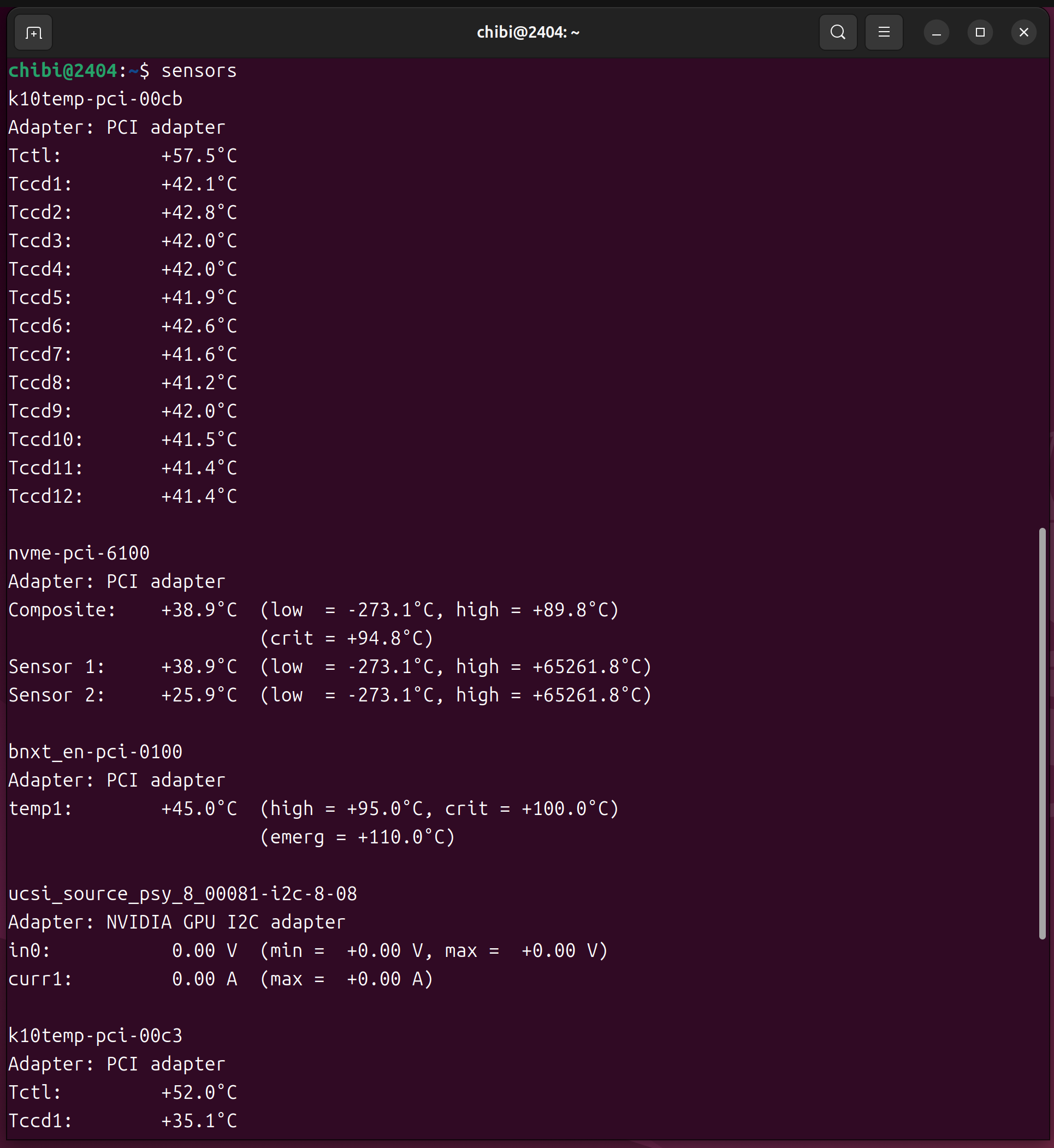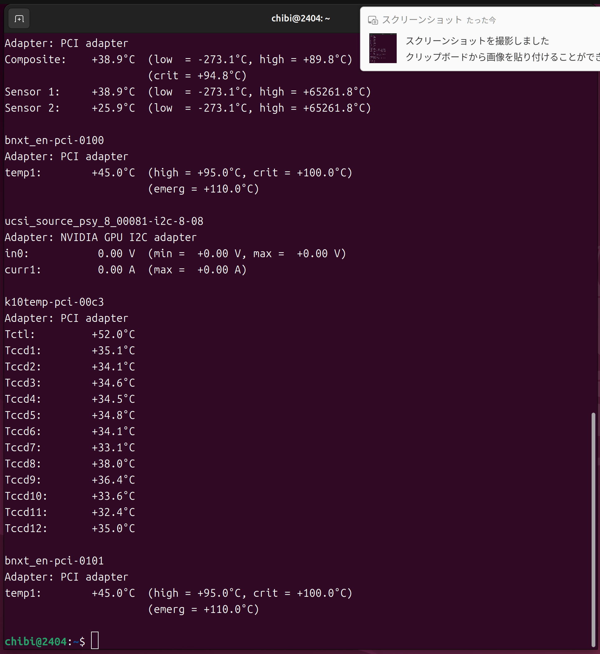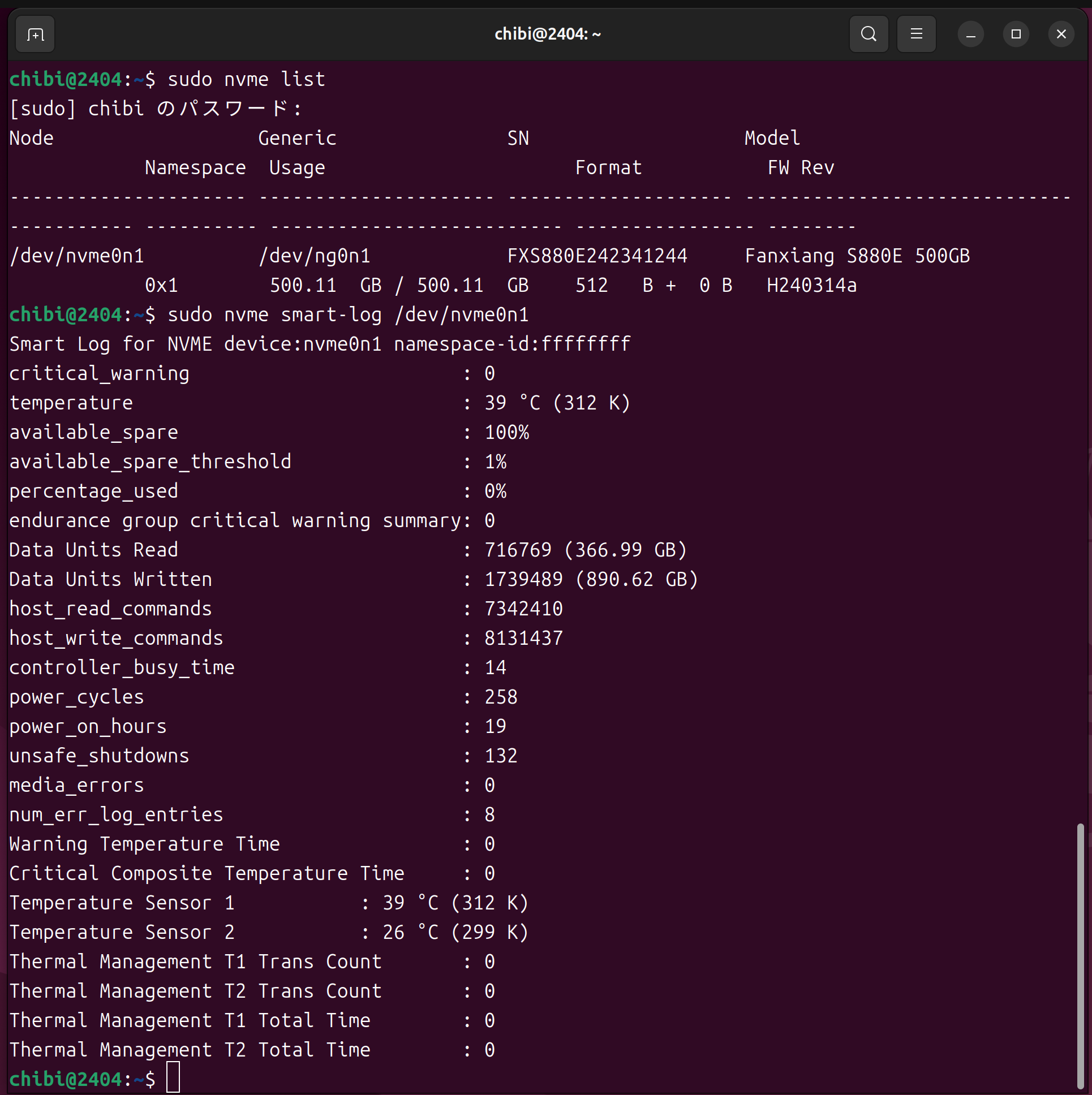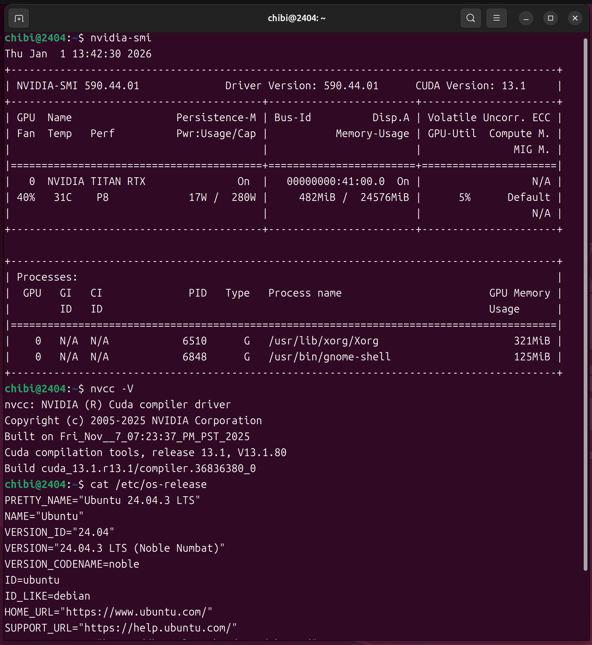 - 第4世代 AMD EPYC 9B14 96-Core Processor x2 384Threads 768GB TITAN RTX Fanxiang S880E 500GBで構成された Ubuntu24.04.3 LTS へ CUDA-toolkit 13.1 をInstall して nvidia-smi nvcc -V cat /etc/os-release sensors nvme list nvme-smart-log /dev/nvme0n1 lsmem lscpuを設定した