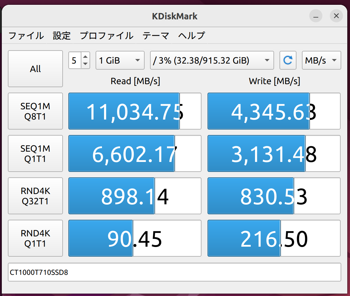 - 第4世代 AMD EPYC 9B14 96-Core Processor x2 384Threads 768GB GeForce RTX 2080Ti CT1000T710SSD8 1TB (PCIe5.0)で構成された Ubuntu22.04.5 LTS でkdiskmarkを動作させてみた Read 12,022.94 M/s