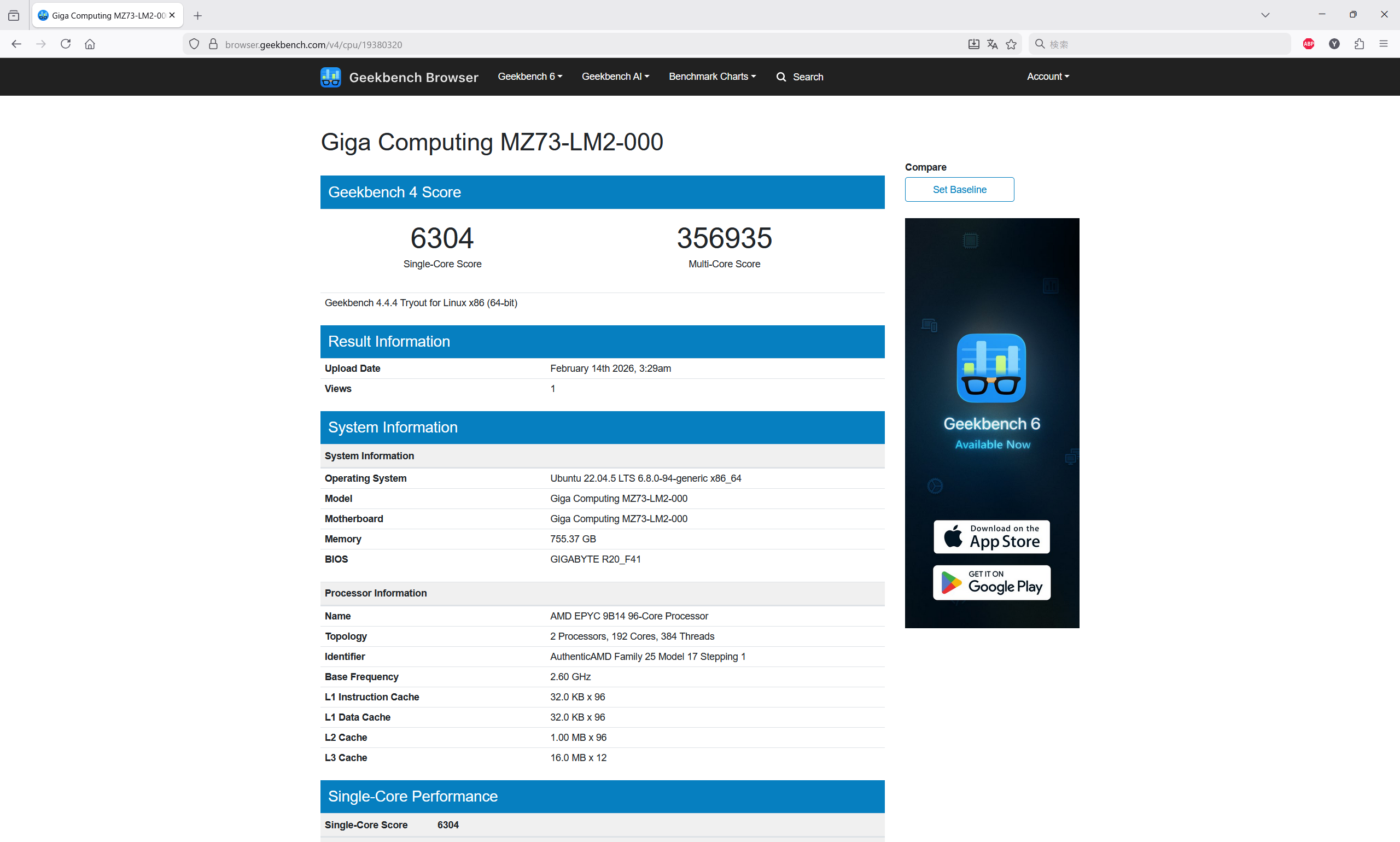 - 第4世代 AMD EPYC 9B14 96-Core Processor x2 384Threads 768GB NVIDIA TITAN RTX CT1000T710SSD8 1TB (PCIe5.0)で構成された Ubuntu22.04.5 LTS にてGeekbench-4.4.4-Linuxを久しぶりに動作させてみたMulti-Core Score 365,501