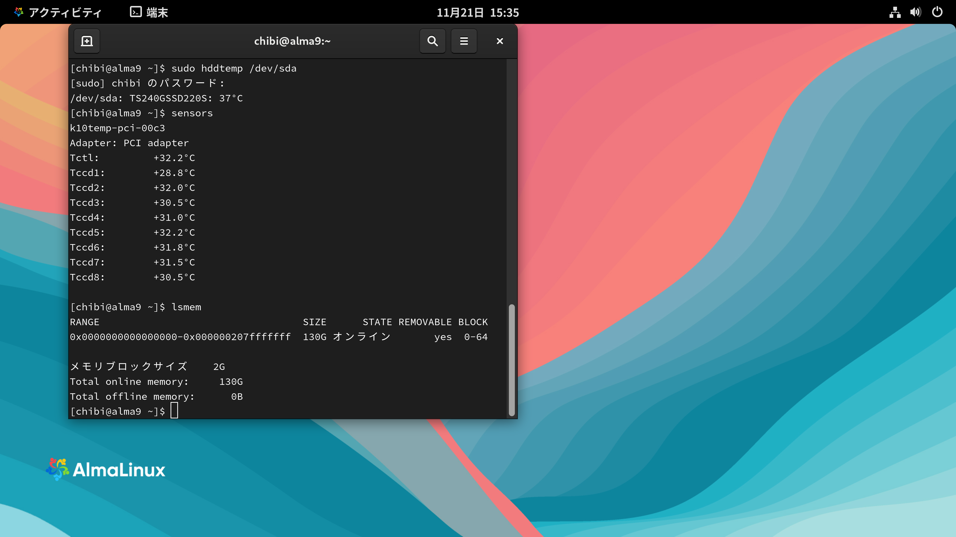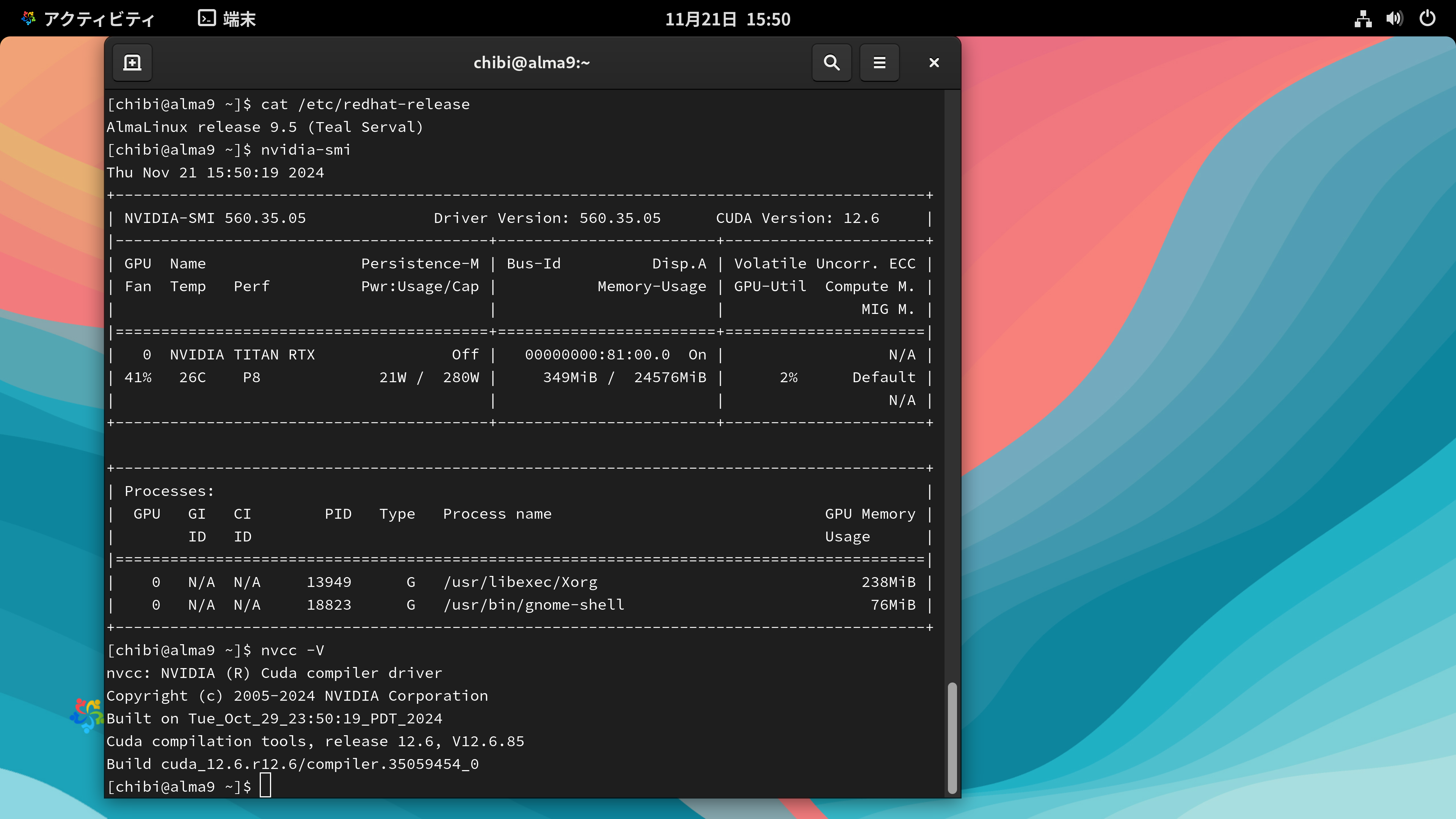 - 第5世代 AMD EPYC 9655 96-Core Processor 192Threads 384GB TITAN RTX Fanxiang S500Pro 256GBで構成された AlmaLinux Kitten release 10 へ CUDA-toolkit 12.9.0をInstall してnvidia-smi nvcc -V cat /etc/redhat-release sensors nvme list nvme-smart-log /dev/nvme0n1 lsmem lscpuを設定してみた