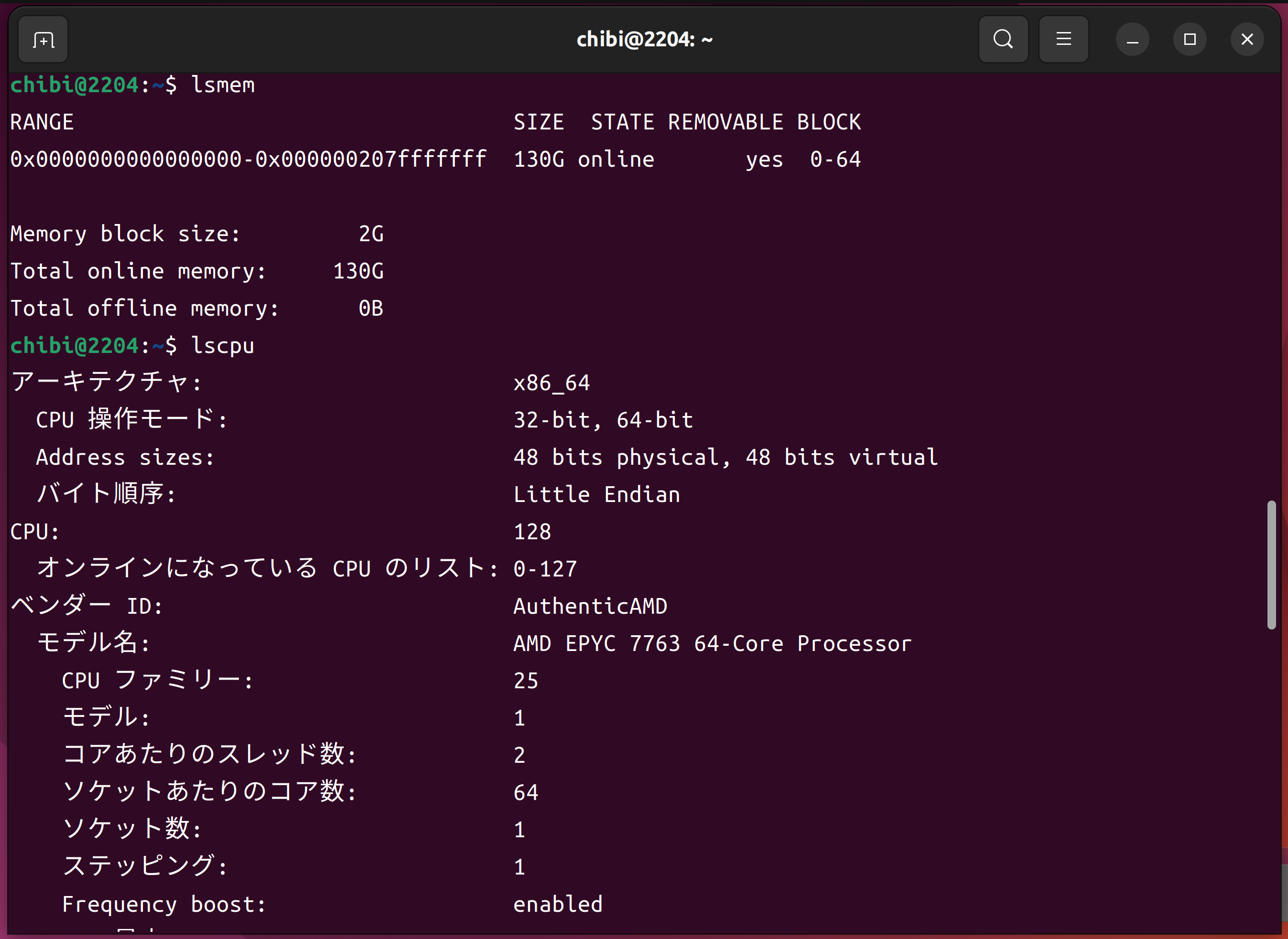 - 第2世代 AMD EPYC 7742 64-Core Processor 128Threads 256GB RTX2080Ti ADATA SX8200PNP 256GBで構成された Ubuntu 22.04.5 LTS へ CUDA-toolkit 12.6.3をInstall してnvidia-smi nvcc -V cat /etc/os-release sensors nvme list nvme smart-log /dev/nvme0n1 lsmem lscpuを設定してみた