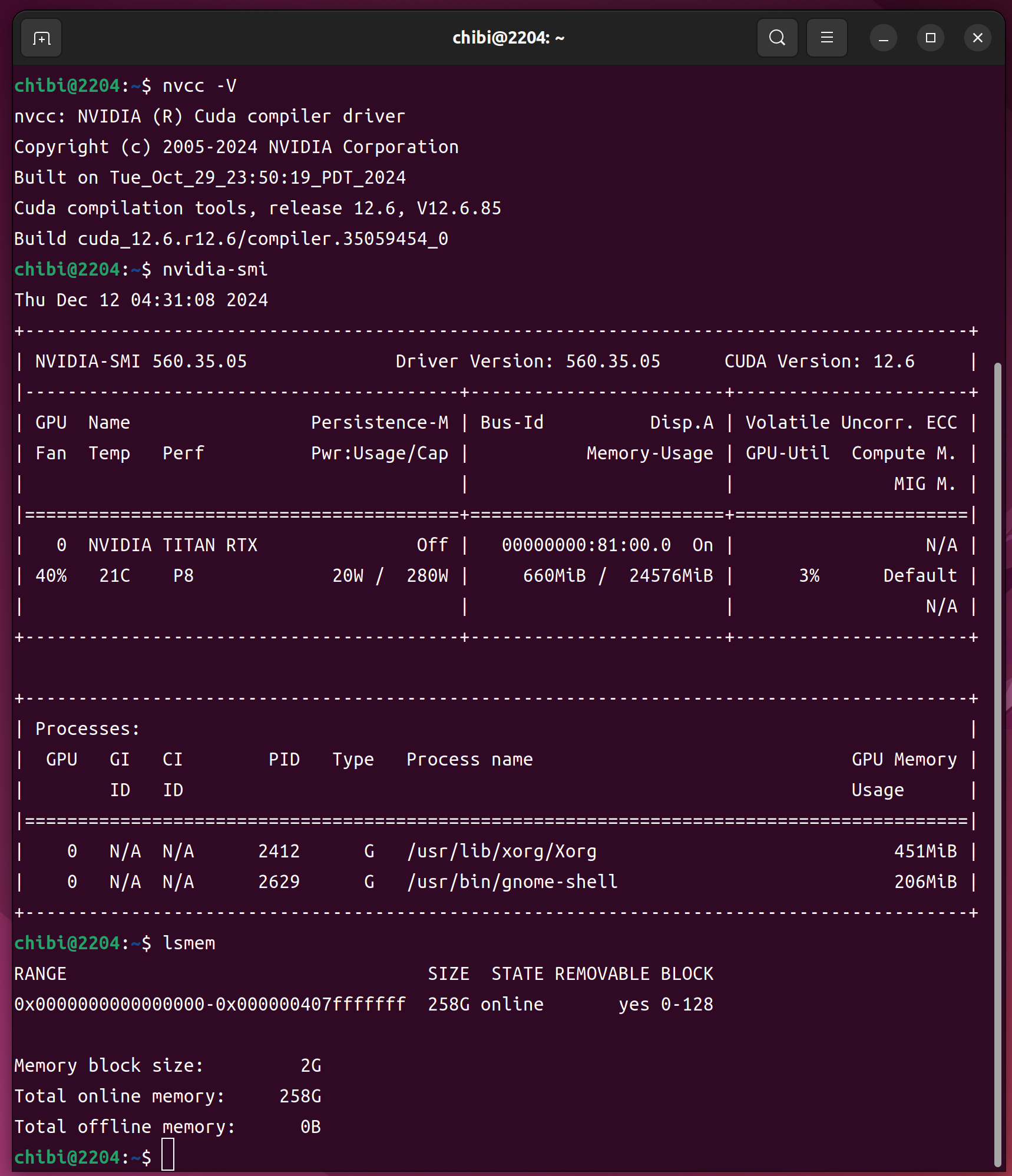 - 第5世代 AMD EPYC 9655 96-Core Processor 192Threads 384GB TITAN RTX Fanxiang S500Pro 256GBで構成された AlmaLinux Kitten release 10 へ CUDA-toolkit 12.9.0をInstall してnvidia-smi nvcc -V cat /etc/redhat-release sensors nvme list nvme-smart-log /dev/nvme0n1 lsmem lscpuを設定してみた
