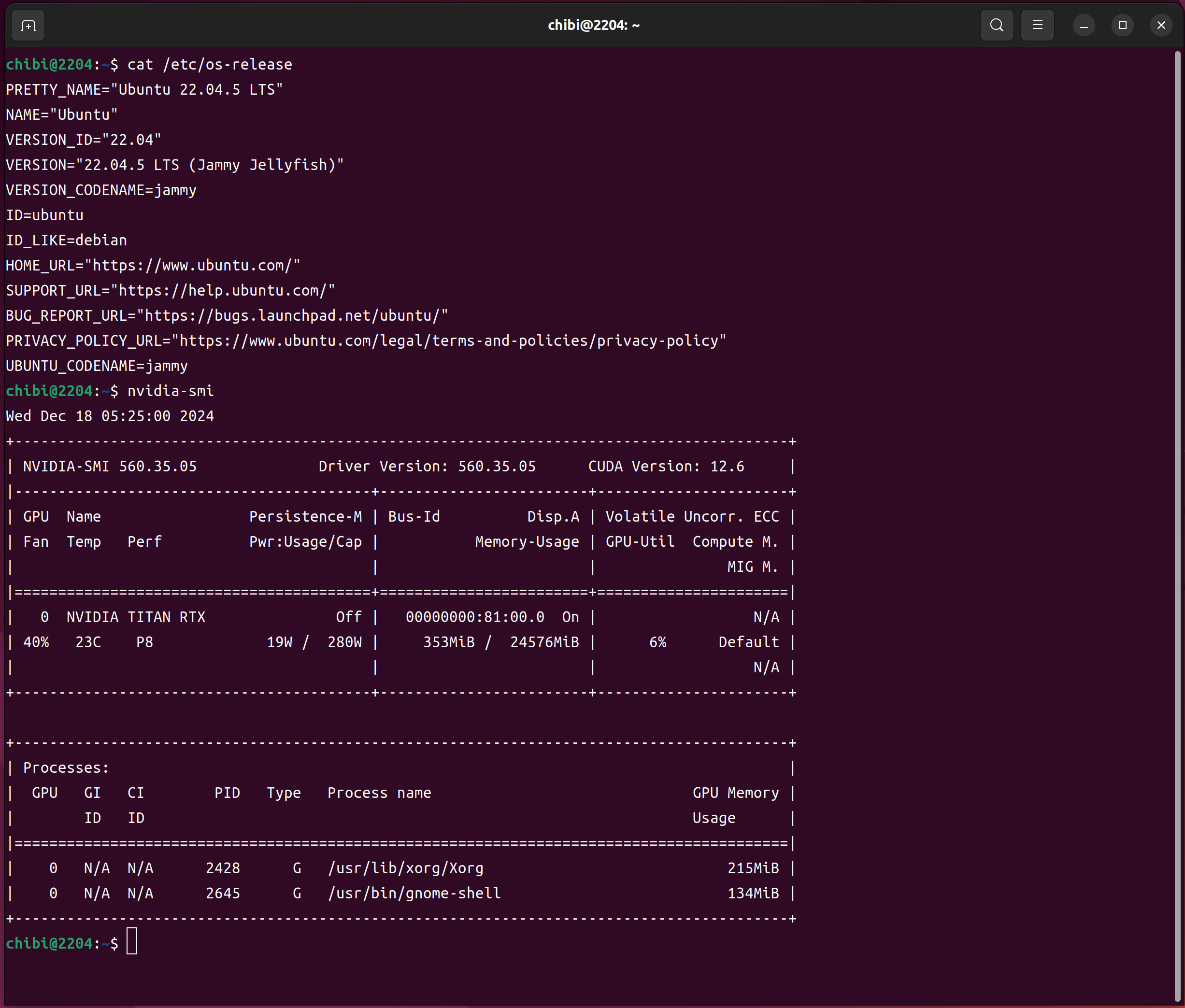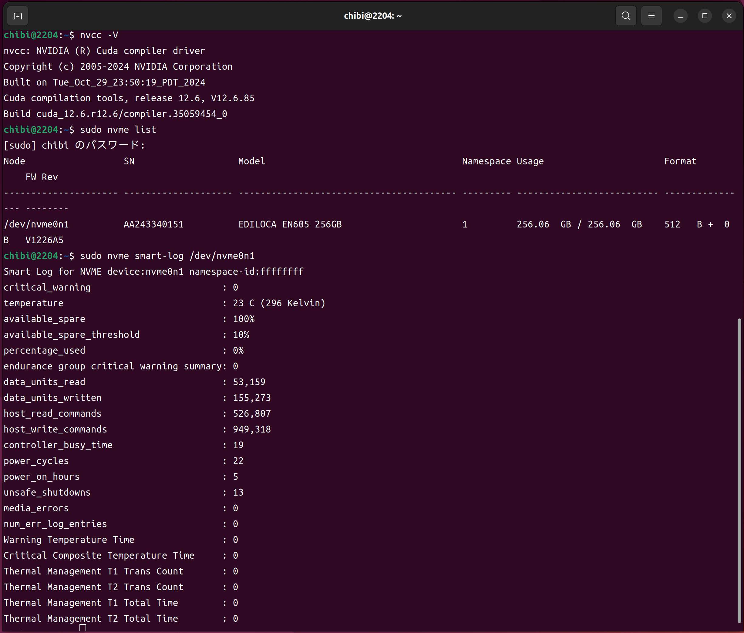 - 第5世代 AMD EPYC 9655 96-Core Processor 182Threads 384GB TITAN RTX Fanxiang S880E 500GBで構成された Ubuntu 22.04.5 LTS へ CUDA-toolkit 12.9.0をInstall してcat /etc/os-release nvidia-smi nvcc -V sensors lsmem nvme list nvme-smart-log /dev/nvme0n1 lscpuを設定してみた