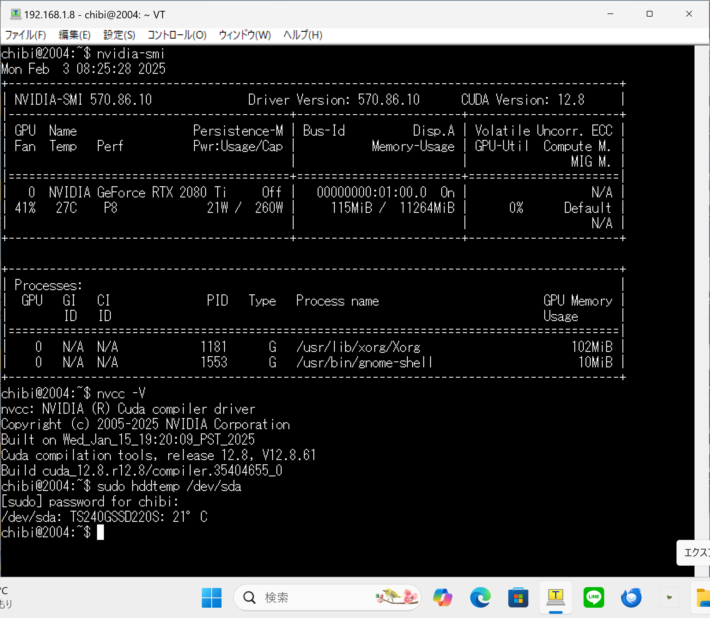- 第2世代 AMD EPYC 7742 64-Core Processor 128Threads 256GB RTX2080Ti EDILOCA EN605 256GBで構成された Ubuntu 22.04.5 LTS へ CUDA-toolkit 12.9.1をInstall してnvidia-smi nvcc -V cat /etc/os-release sensors lsmem nvme list nvme smart-log /dev/nvme0n1 lscpuを設定してみた