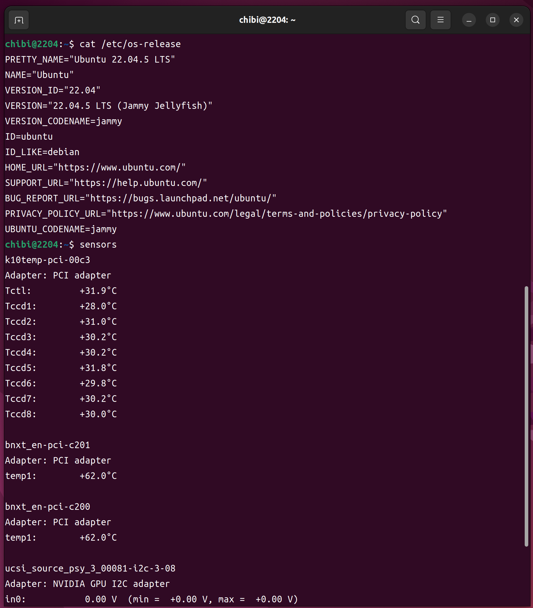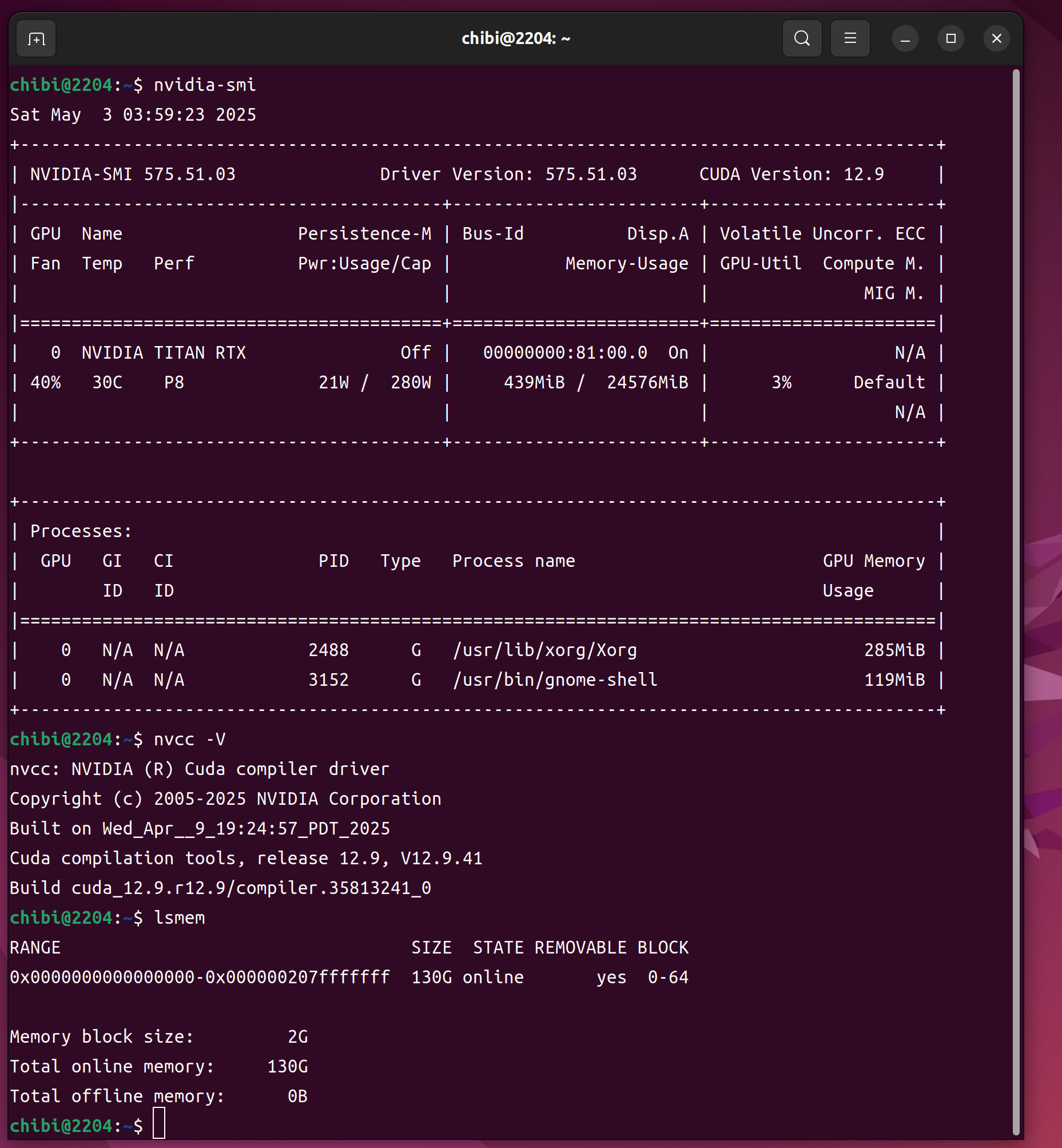 - 第3世代 AMD EPYC 7763 64-Core Processor 128Threads 128GB TITAN RTX EDILOCA EN605 256GB で構成された Ubuntu 22.04.5 LTS へ CUDA.12.9.0.をInstall して nvidia-smi nvcc -V cat /etc/os-release sensors nvme list nvme smart-log /dev/nvme0n1 lsmem lscpuを設定した