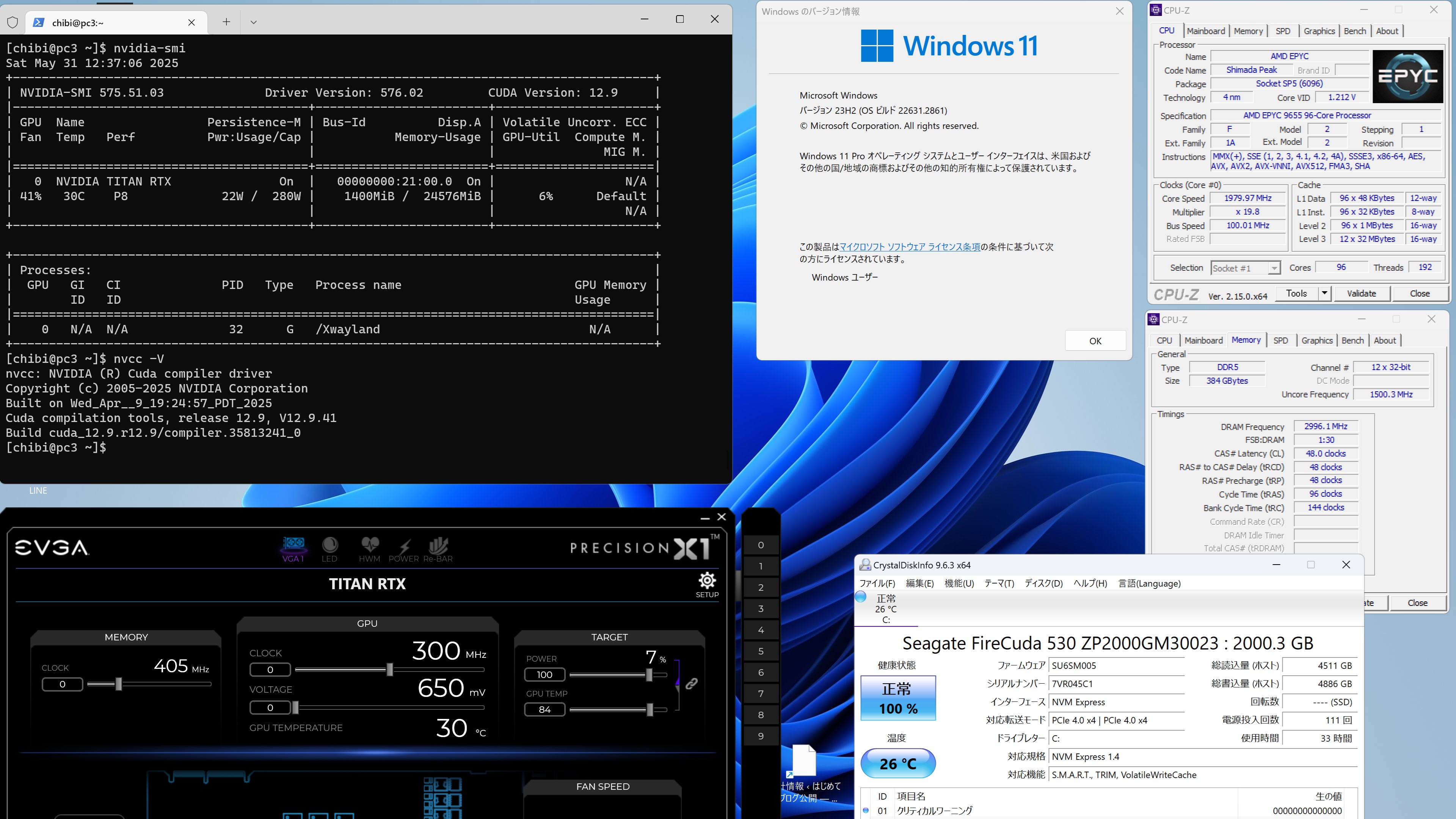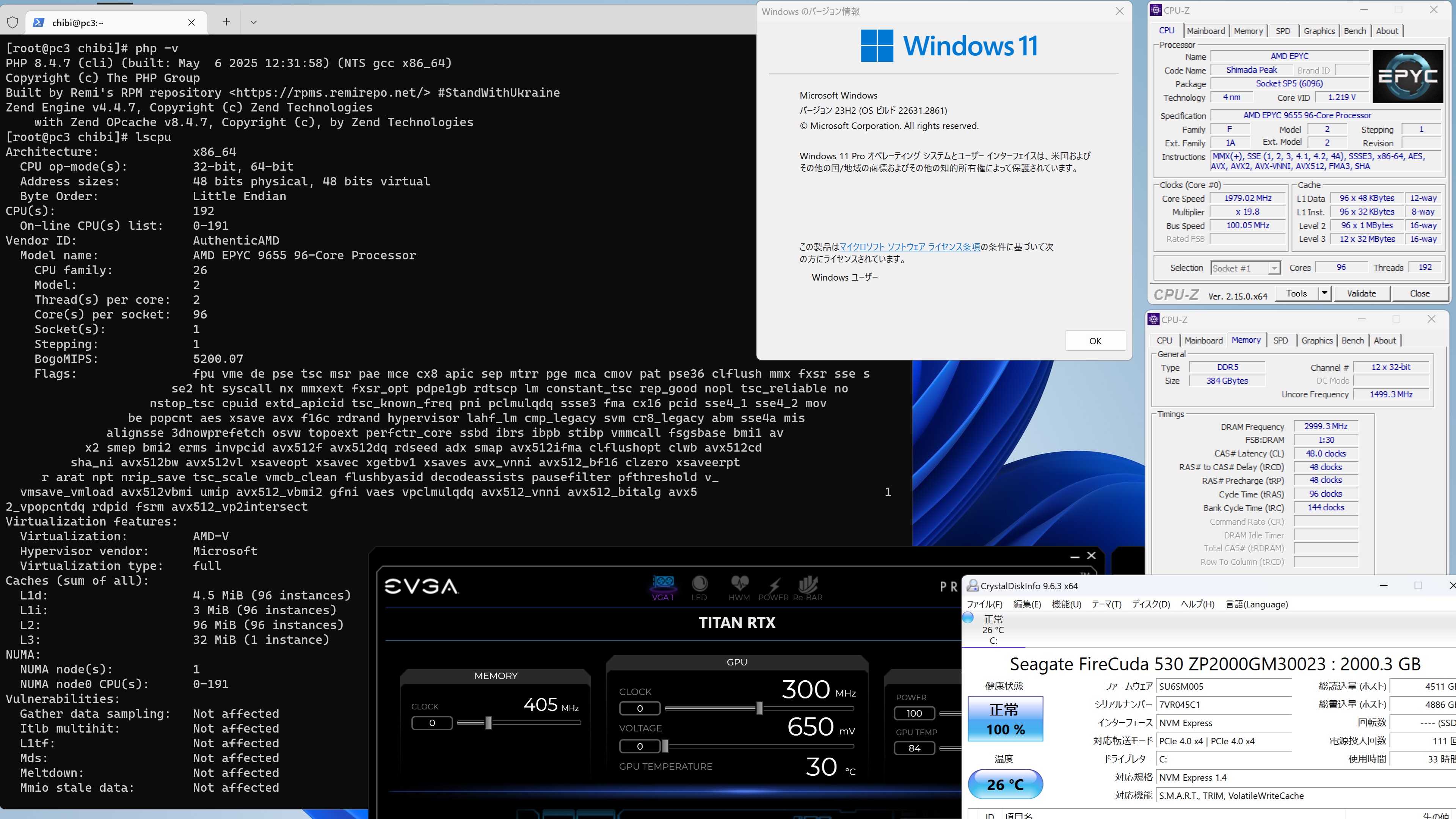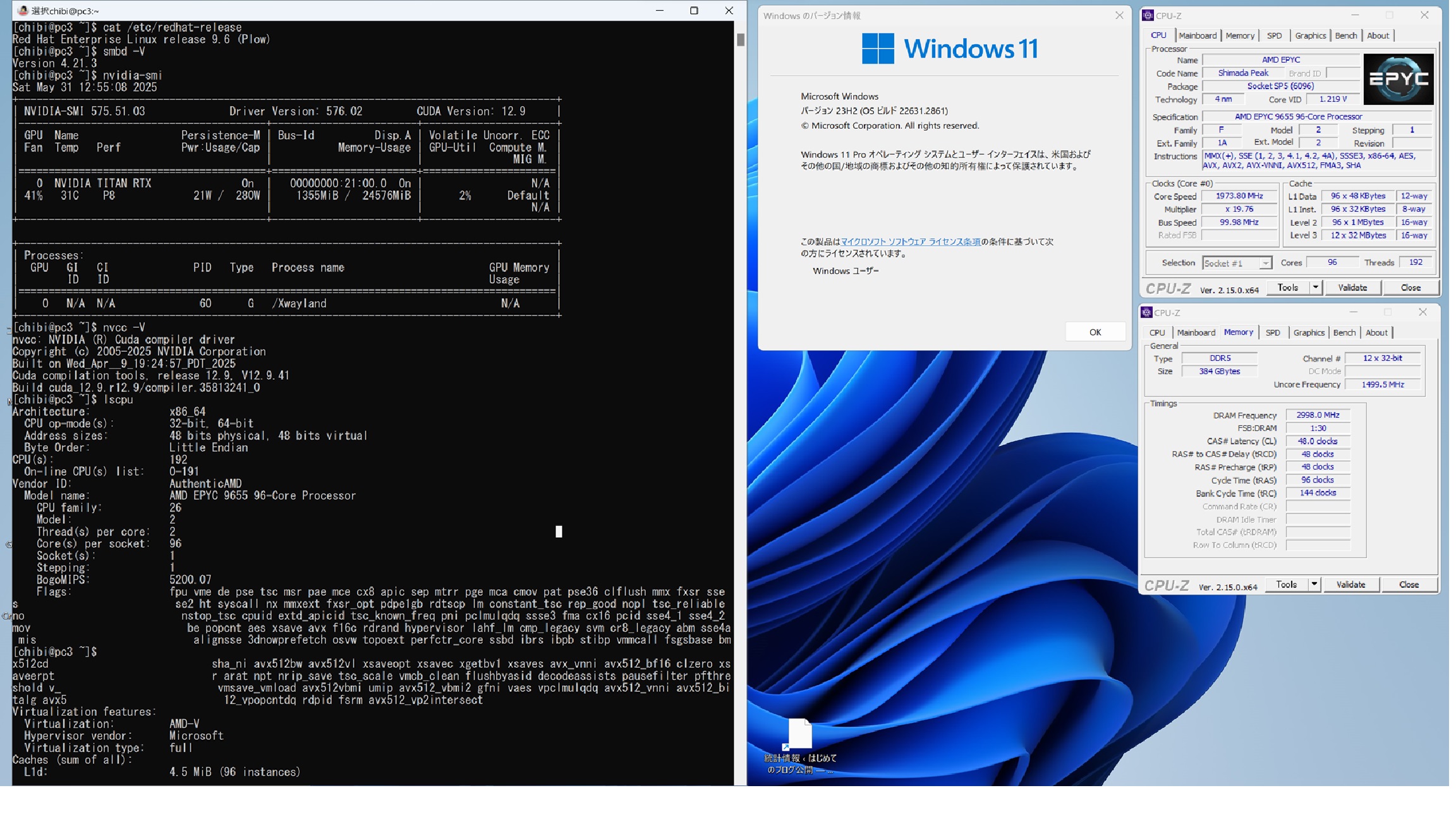 第5世代 AMD EPYC 9655 96-Core Processor 192Thereds 384GB TAITAN RTX Seagate FireCuda 530 ZP2000GM30023 2TGB Windows11 Pro WSL2 Red Hat Enterprise Linux 9.6 にCUDA12.9をInstallしてPHP8.4.7 lscpu nvidia-smi nvcc -V cat/etc/redhat-releaseを設定してみた