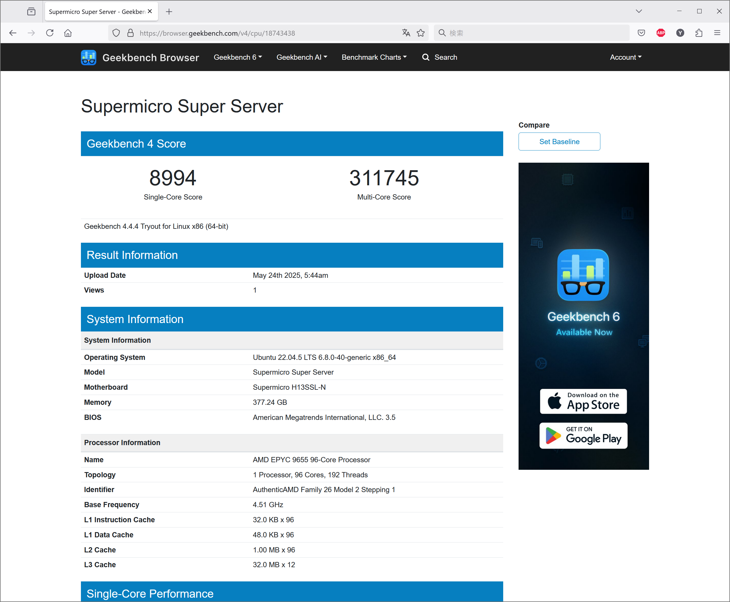 第4世代 AMD EPYC 9655 96-Core Processor Single-Core Score 6470