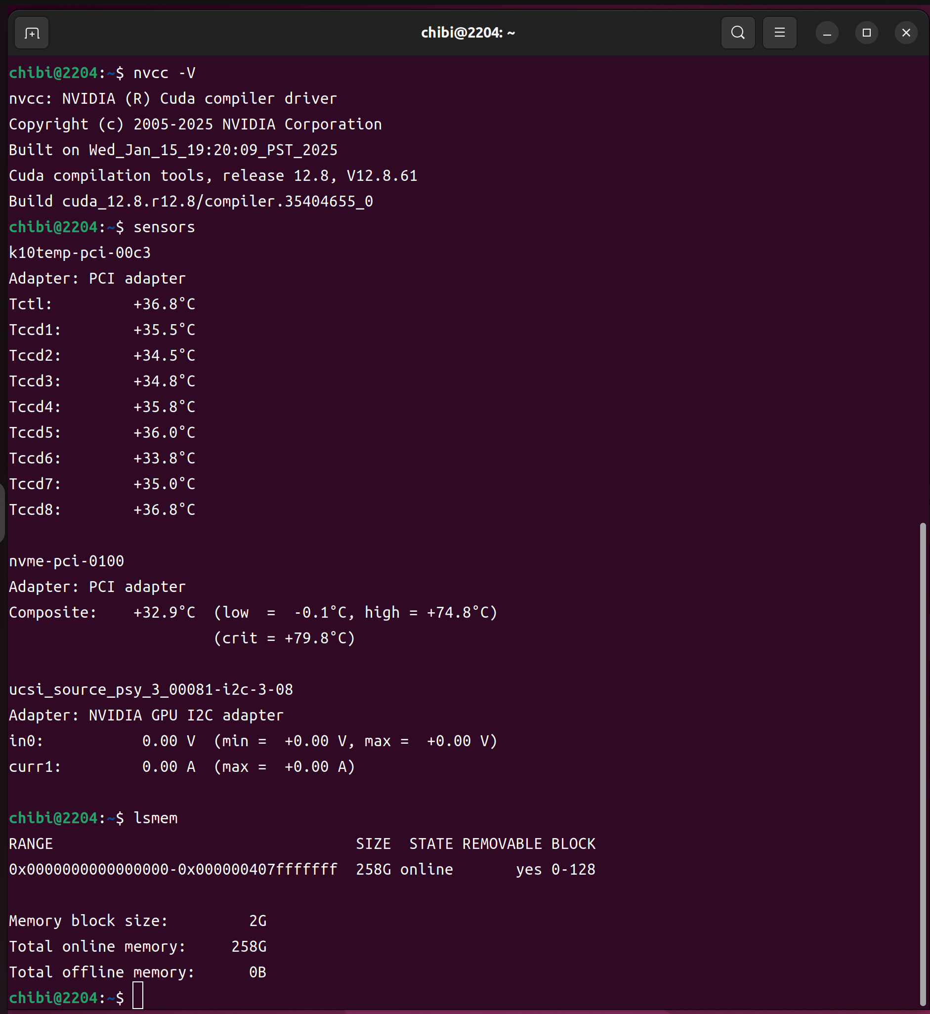 - 第2世代 AMD EPYC 7742 64-Core Processor 128Threads 256GB RTX2080Ti ADATA SX8200PNP 256GBで構成された Ubuntu22.04.5 LTS へ CUDA-toolkit 12.8.0をInstall してcat /etc/os-release nvidia-smi nvcc -V sensors lsmem nvme list nvme smart-log /dev/nvme0n1 lscpuを設定してみた