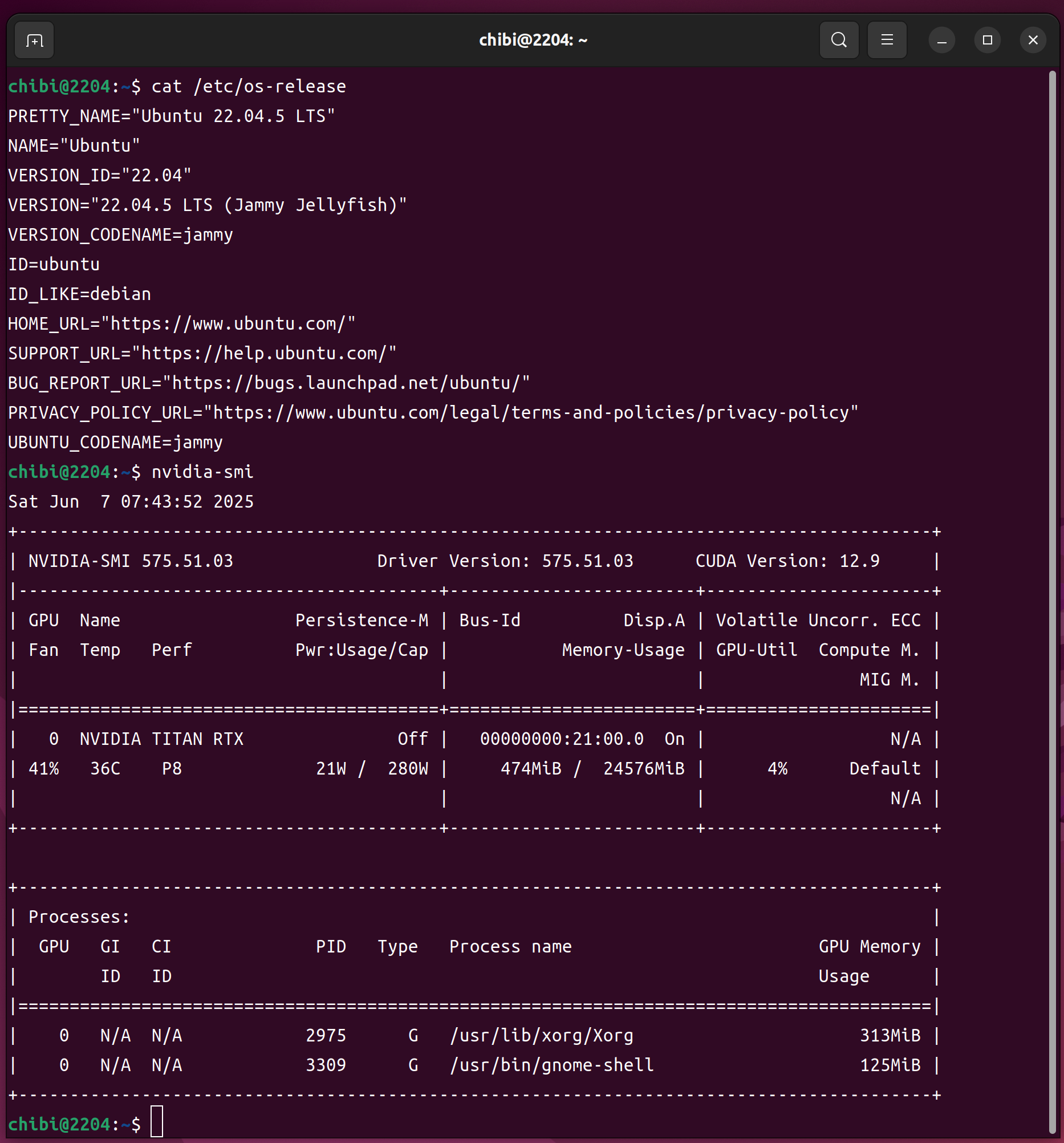 - 第5世代 AMD EPYC 9655 96-Core Processor 182Threads 384GB TITAN RTX Fanxiang S880E 500GBで構成された Ubuntu 22.04.5 LTS へ CUDA-toolkit 12.9.0をInstall してcat /etc/os-release nvidia-smi nvcc -V sensors lsmem nvme list nvme-smart-log /dev/nvme0n1 lscpuを設定してみた