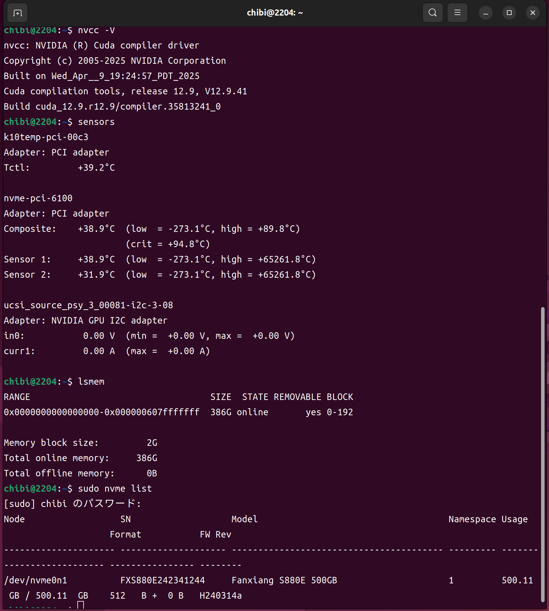nvcc -V sensors lsmem 384GB nvme list