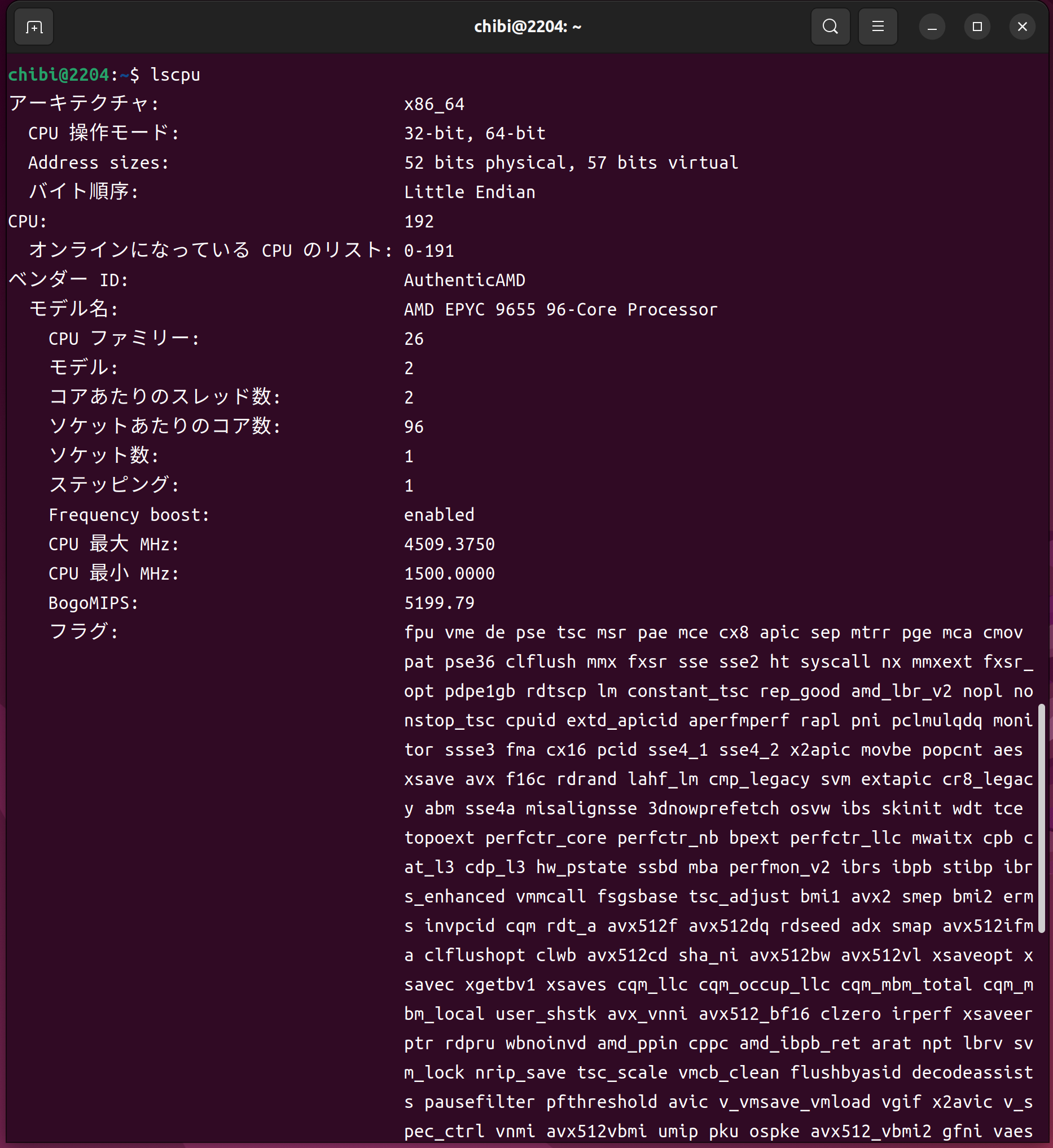 lscpu AMD EPYC 9655 96-Core Processor 182Threads