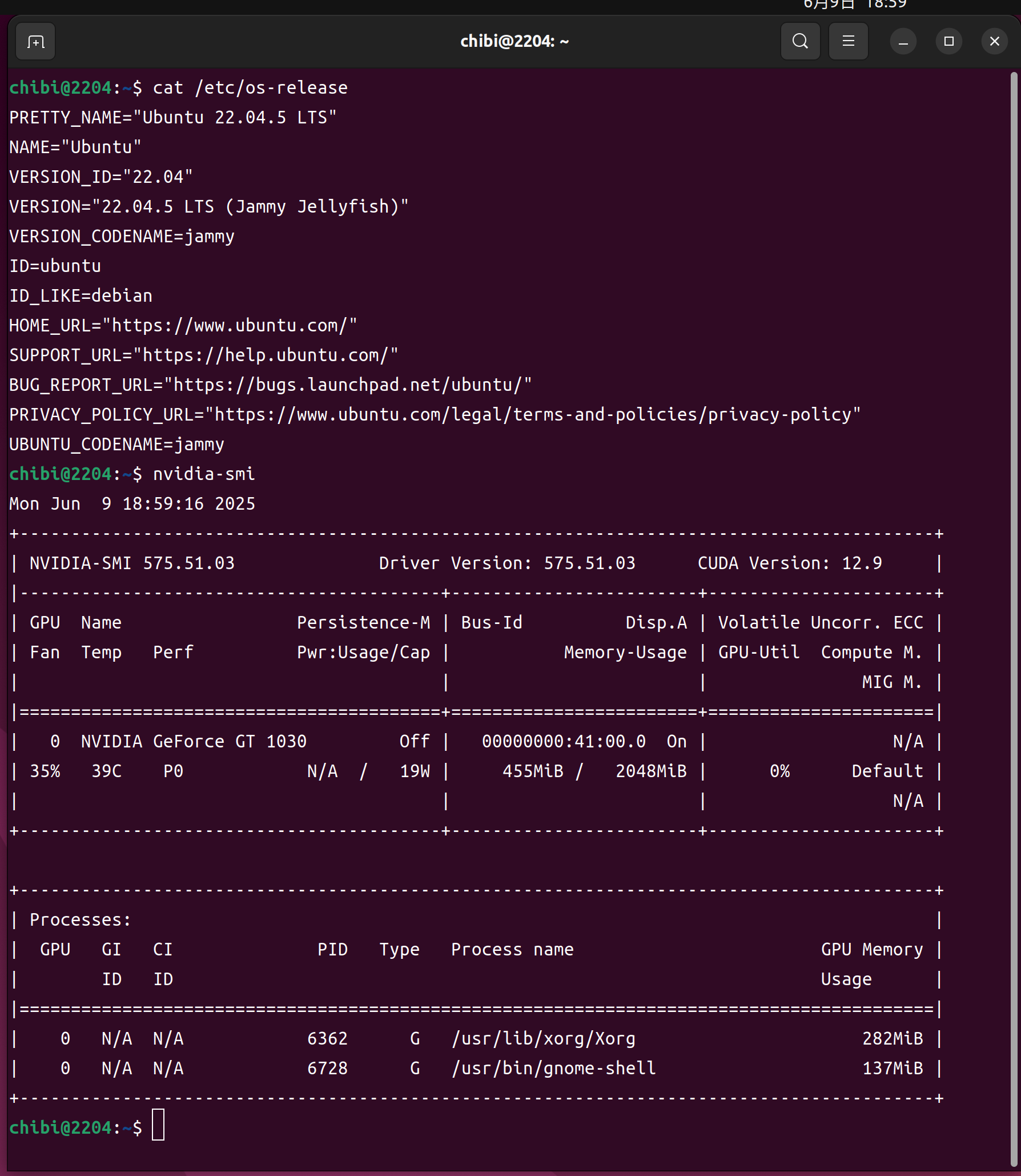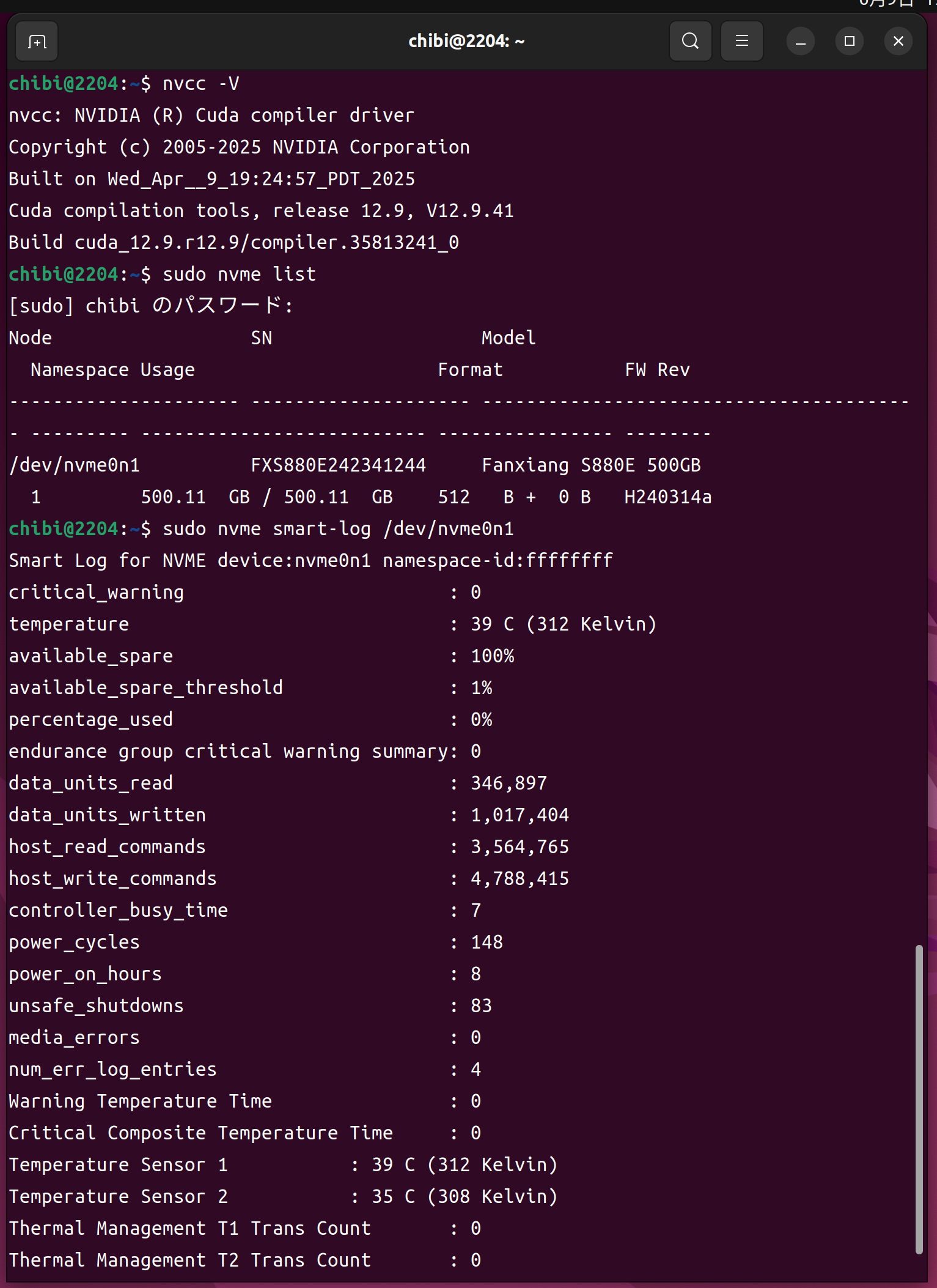 - 第5世代 AMD EPYC 9655 96-Core Processor 192Threads 384GB RTX2080Ti EDILOCA EN605 256GBで構成された Ubuntu22.04.5 LTSへ CUDA-toolkit 12.9.1をInstall してnvidia-smi nvcc -V cat /etc/os-release sensors nvme list nvme smart-log /dev/nvme0n1 lscpuを設定してみた