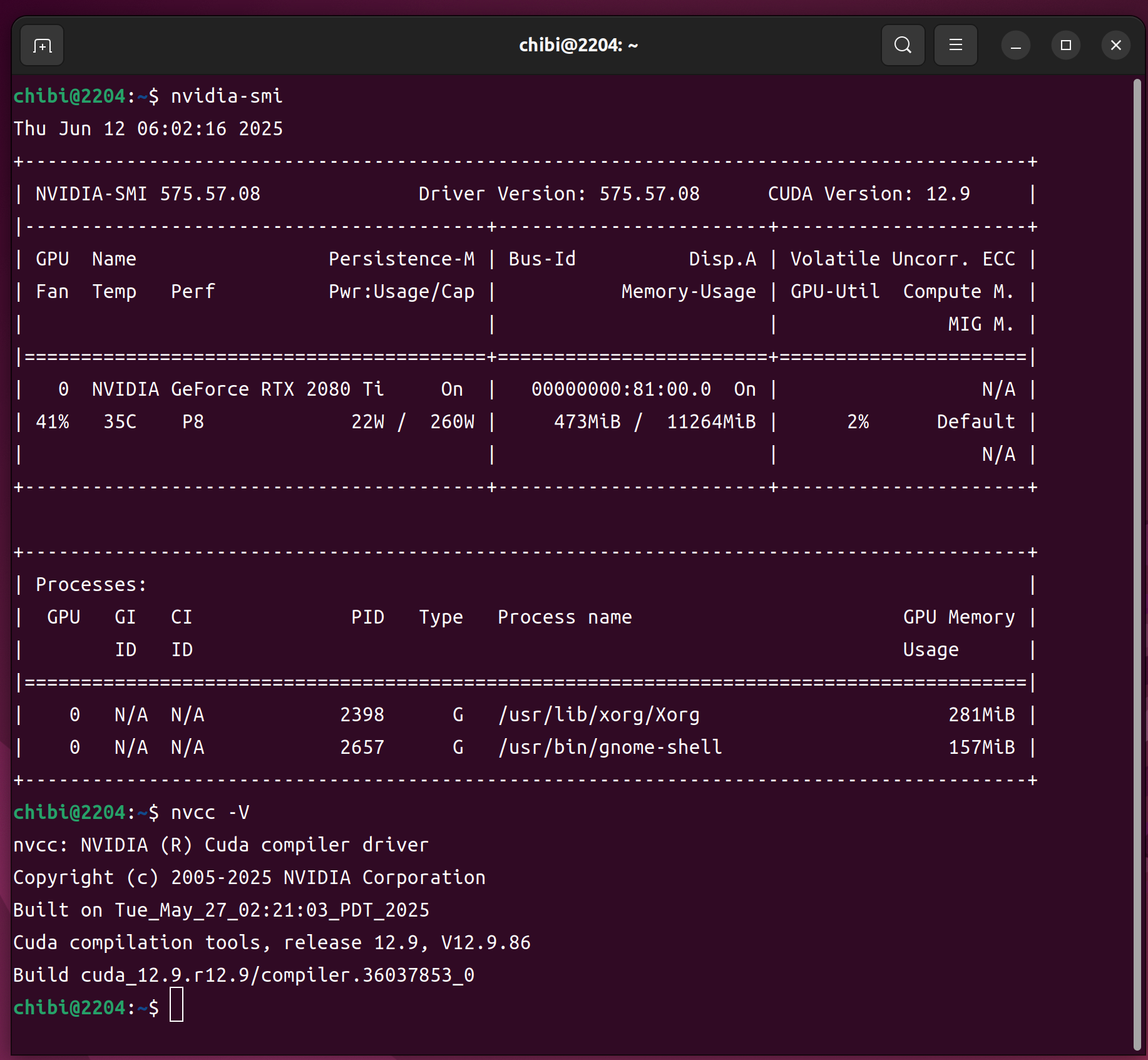 - 第2世代 AMD EPYC 7742 64-Core Processor 128Threads 256GB RTX2080Ti EDILOCA EN605 256GBで構成された Ubuntu22.04.5 LTSへ CUDA-toolkit 12.9.1をInstall してnvidia-smi nvcc -V cat /etc/os-release sensors nvme list nvme smart-log /dev/nvme0n1 lsmem lscpuを設定してみた