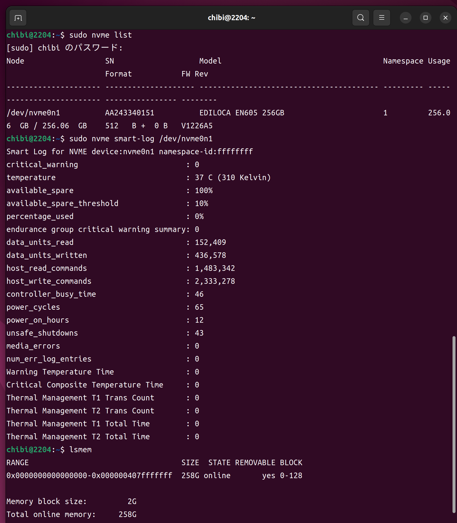 nvme list nvme smart-log /dev/nvme0n1 lsmem 256GB