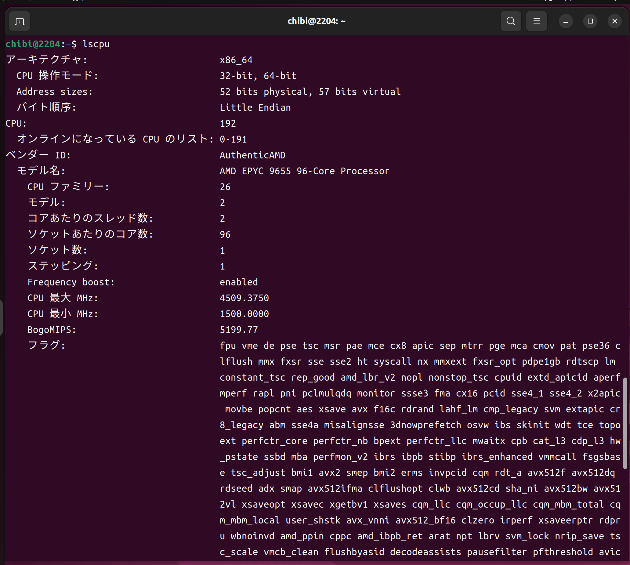 lscpu AMD EPYC 9655 96-Core Processor 182Threads