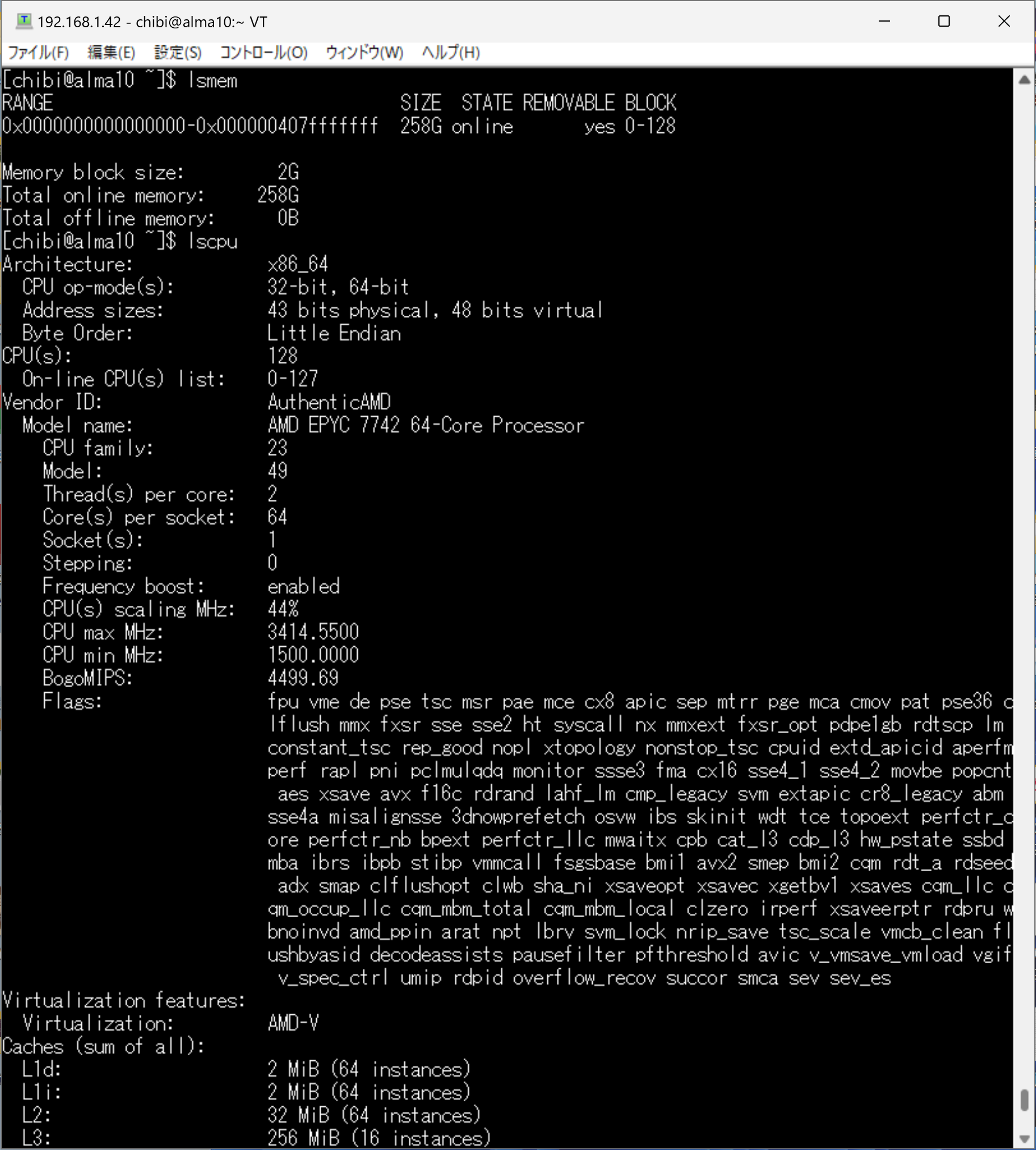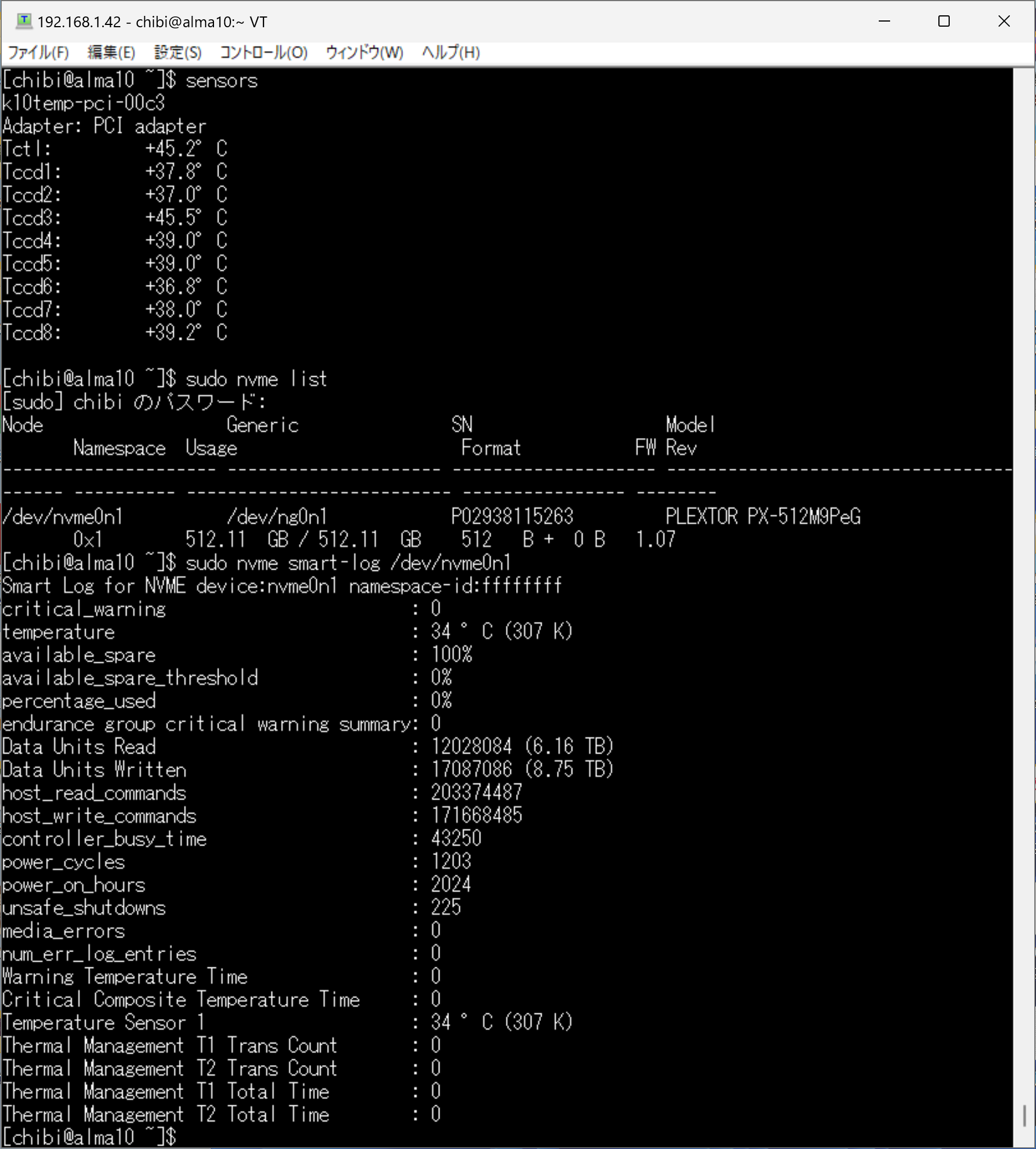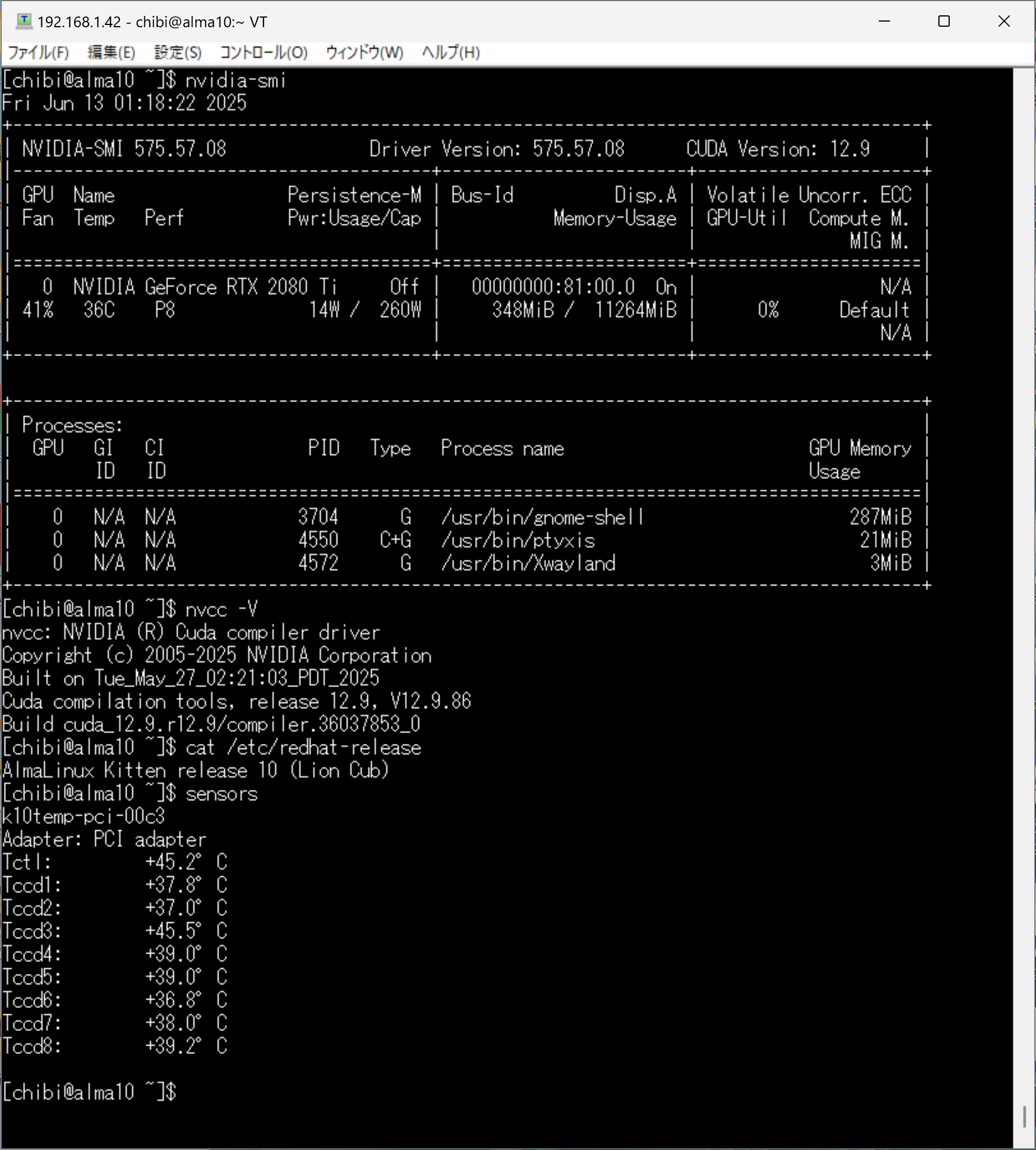 - 第2世代 AMD EPYC 7742 64-Core Processor 128Threads 256GB RTX2080Ti PLEXTOR PX-512M9PeG 512GBで構成された AlmaLinux Kitten release 10 へ CUDA-toolkit 12.9.1をInstall してnvidia-smi nvcc -V cat /etc/redhat–release sensors nvme list nvme smart-log /dev/nvme0n1 lsmem scpuを設定してみた