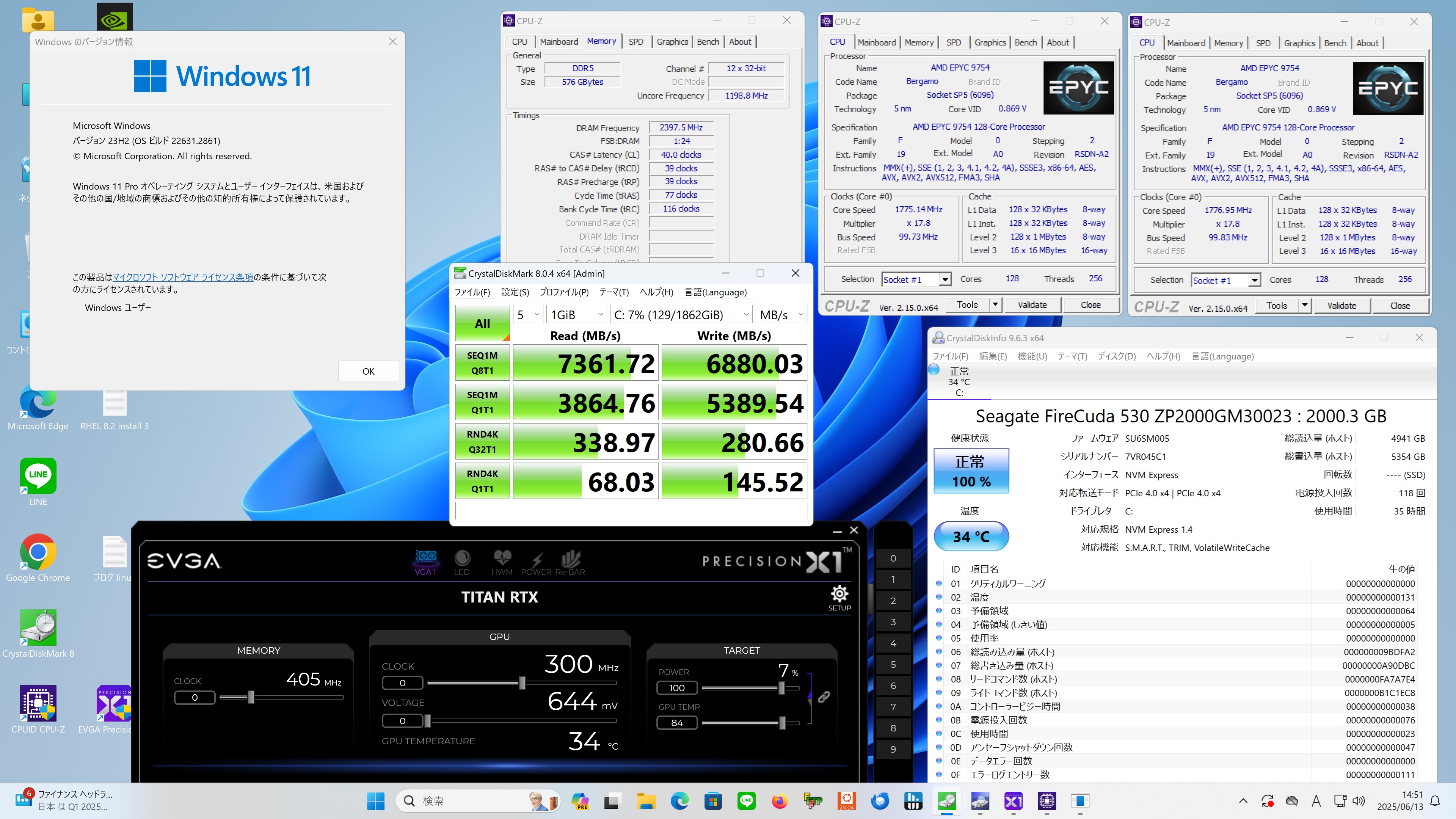 - 第4世代 AMD EPYC 9754 128-Core x2 256-Core Processor 512Threads 576GB TITAN RTX Seagate FireCuda 530 ZP2000GM30023 2TBで構成された Windows 11 ProでDiskMarkを動作させてみた Read 7361.72MB/s Write 6880.03MB/s 公称値に近い値が出た に 丸山泰男 より