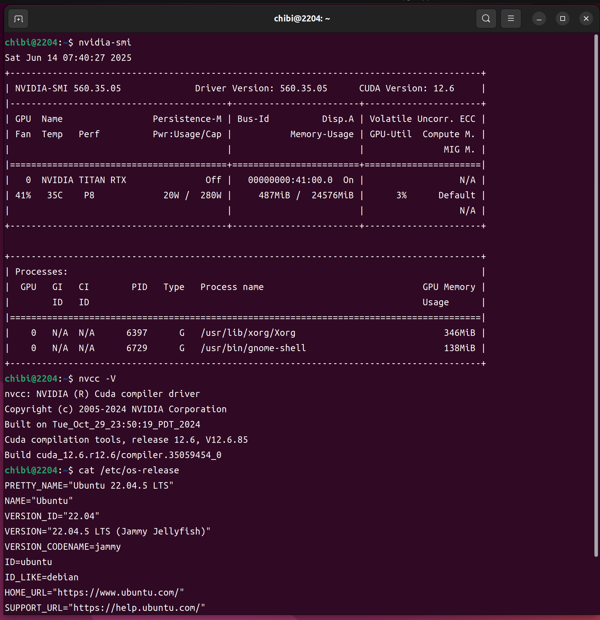 - 第4世代 AMD EPYC 9754 X2 CPU 256-Core Processor 512Threads 576GB TITAN RTX Seagate FireCuda 530 ZP2000GM30023 2TBで構成された Ubuntu 22.04.5 LTS へ CUDA-toolkit 12.6をInstall してcat /etc/os-release nvidia-smi sensors nvcc -V nvme list nvme-smart-log /dev/nvme0n1 lsmem lscpuを設定してみた