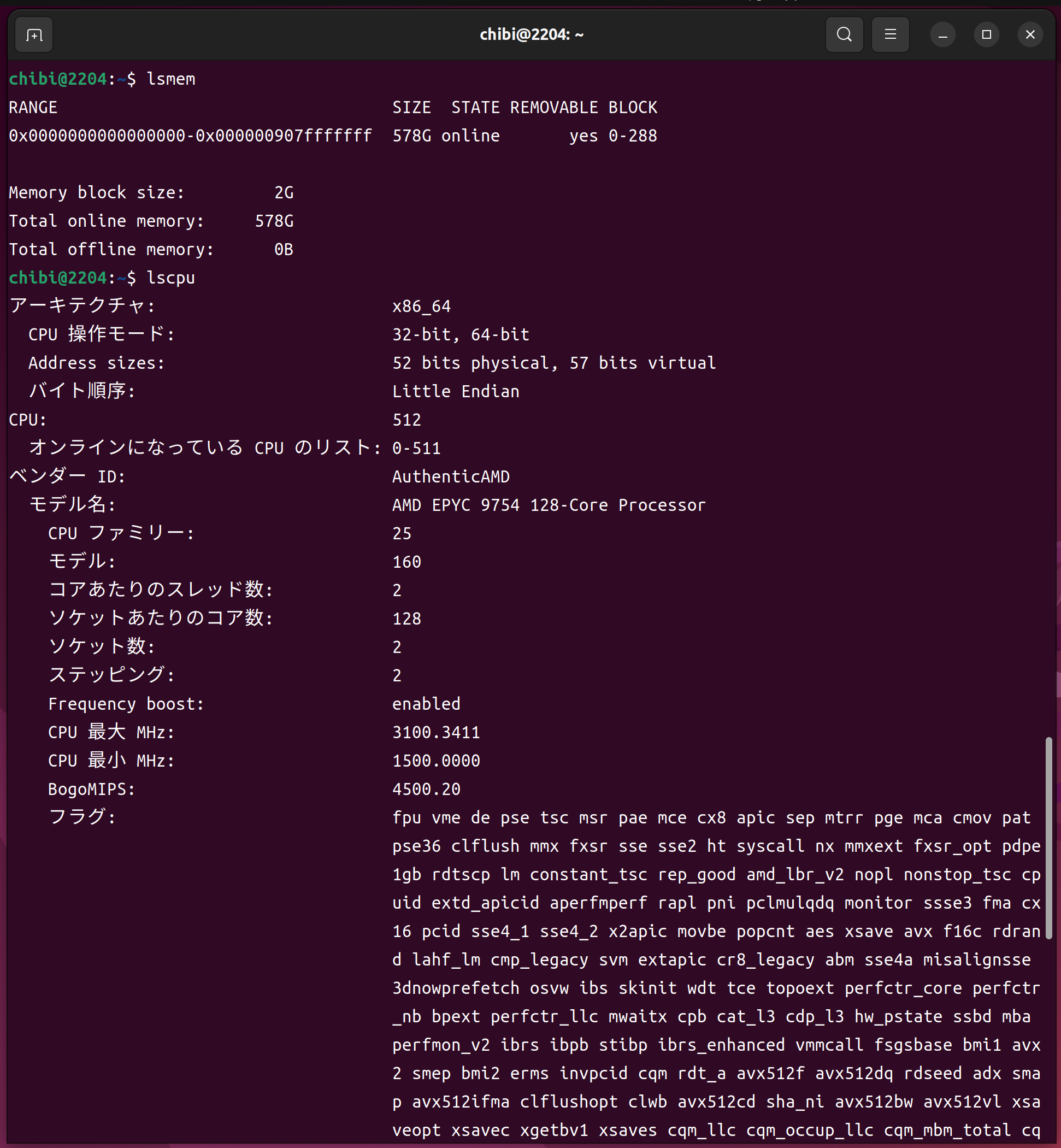 - 第4世代 AMD EPYC 9754 X2 CPU 256-Core Processor 512Threads 576GB TITAN RTX Fanxiang S500Pro 256GB で構成された Ubuntu 22.04.5 LTS へ CUDA-toolkit 12.6.3をInstall して nvidia-smi nvcc -V cat /etc/os-release sensors nvme list nvme-smart-log /dev/nvme0n1 lsmem lscpuを設定してみた