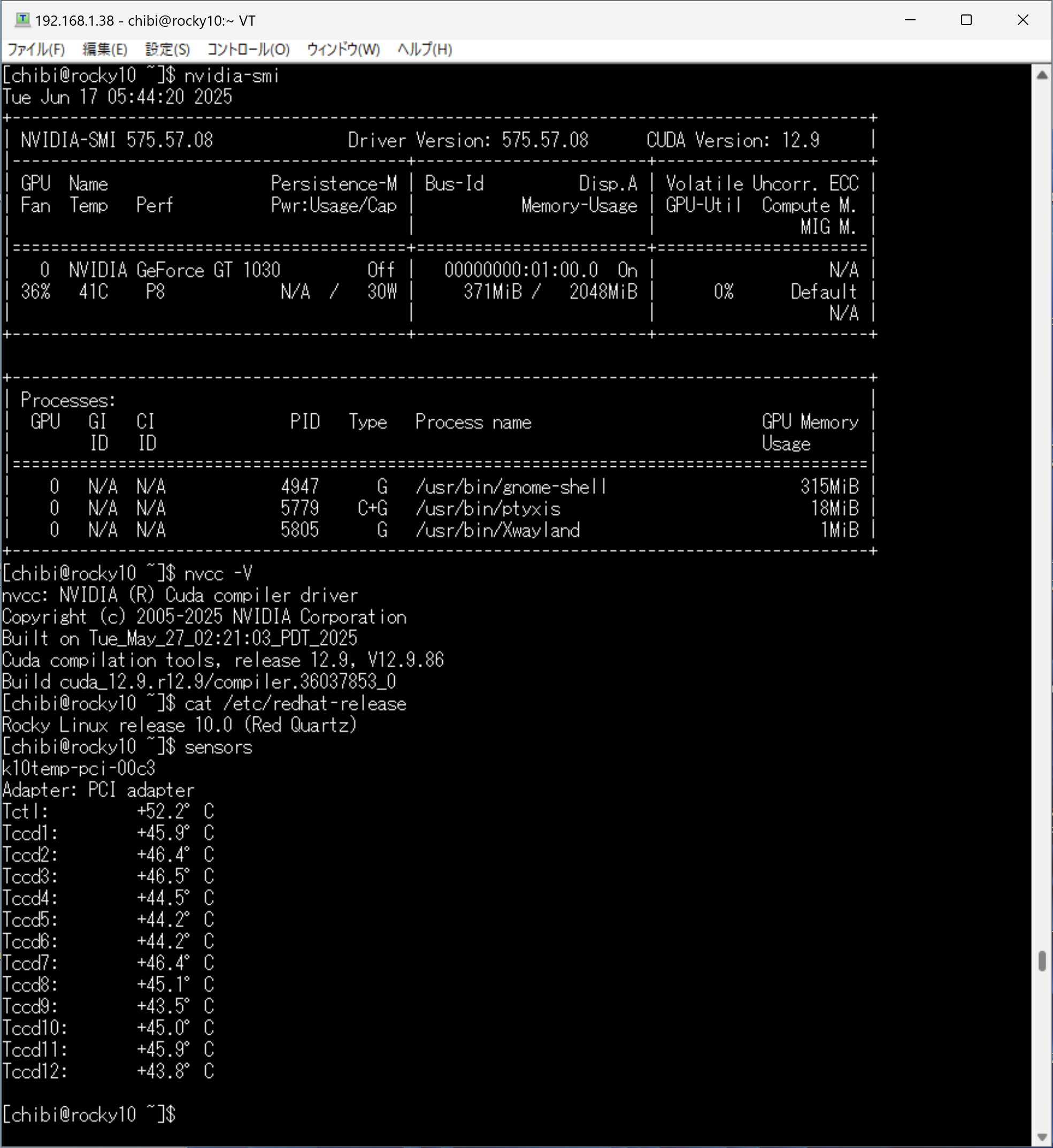 - 第4世代 AMD EPYC 9654P 96-Core Processor 192Threads 384GB GT1030 EDILOCA EN605 256GB で構成された Rocky Linux release 10.0 へ CUDA-toolkit 12.9.1をInstall して nvidia-smi nvcc -V cat /etc/redhat-release sensors nvme list nvme-smart-log /dev/nvme0n1 lsmem lscpuを設定してみた