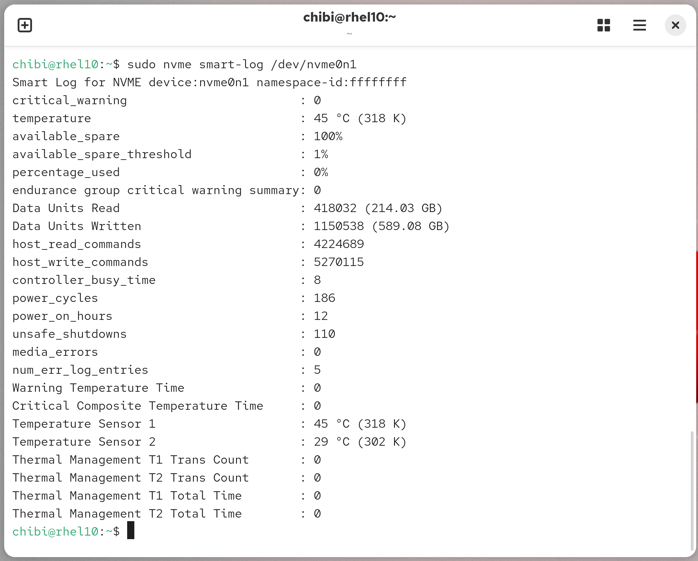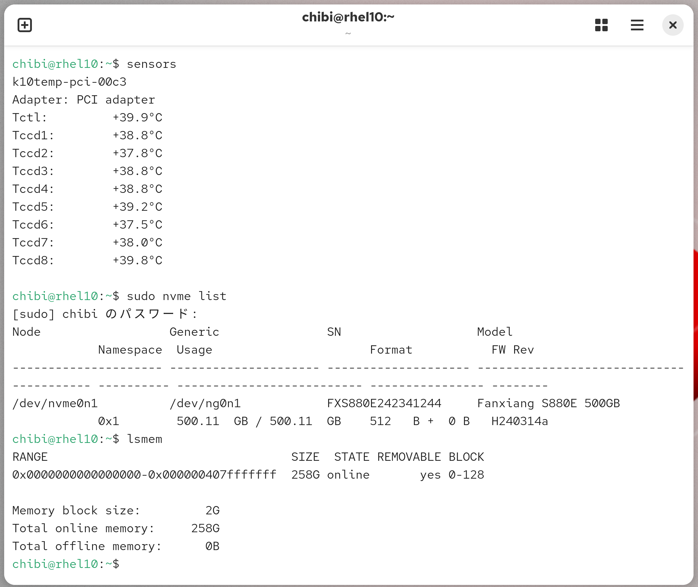 cat /etc/redhat-release sensors nvme list lsmem 256GB