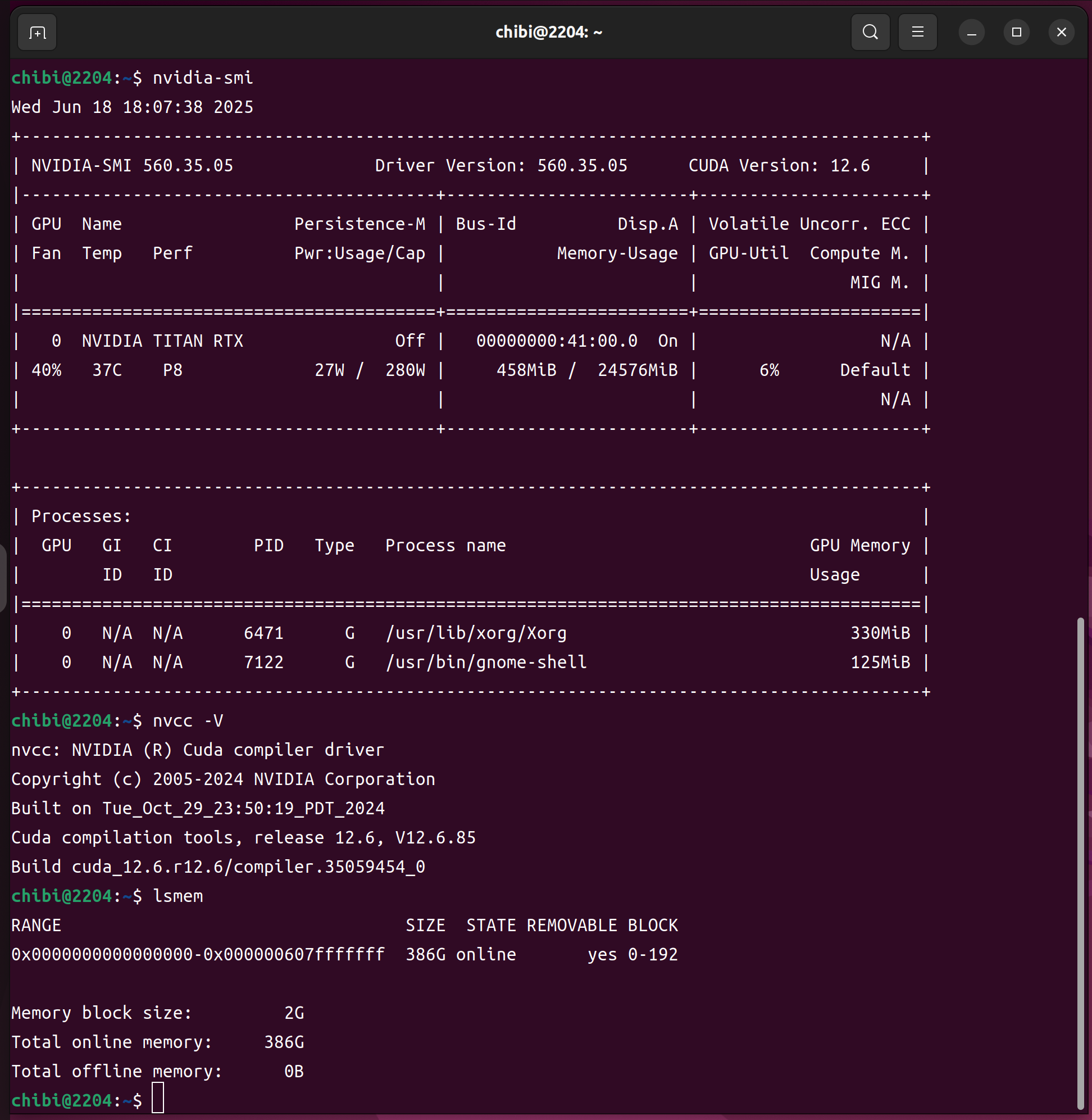 - 第2世代 AMD EPYC 7742 64-Core Processor 128Threads 256GB RTX2080Ti EDILOCA EN605 256GBで構成された Ubuntu 22.04.5 LTS へ CUDA-toolkit 12.9.1をInstall してnvidia-smi nvcc -V cat /etc/os-release sensors lsmem nvme list nvme smart-log /dev/nvme0n1 lscpuを設定してみた