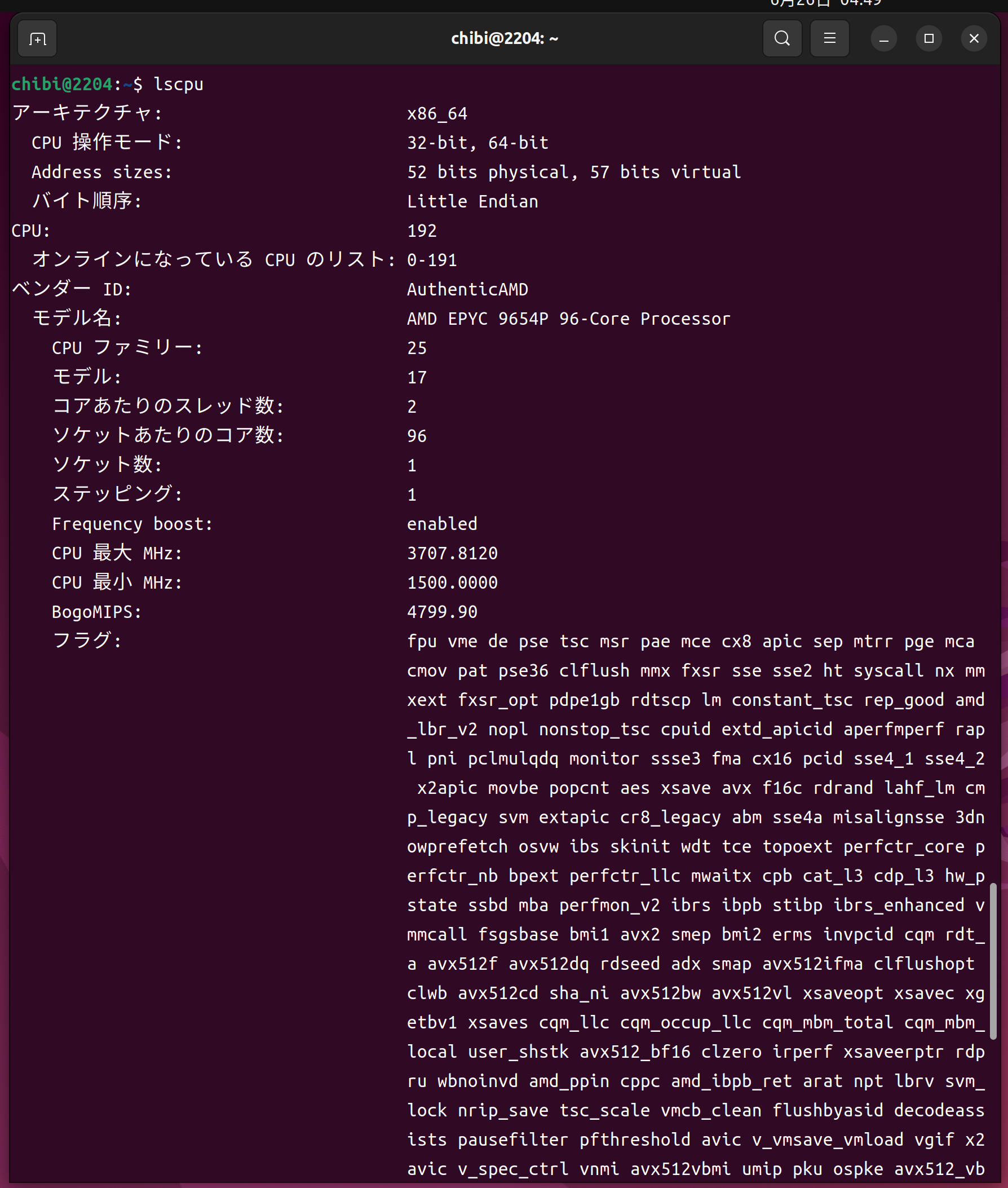 lscpu AMD EPYC 9654P 96-Core Processor 192Threads