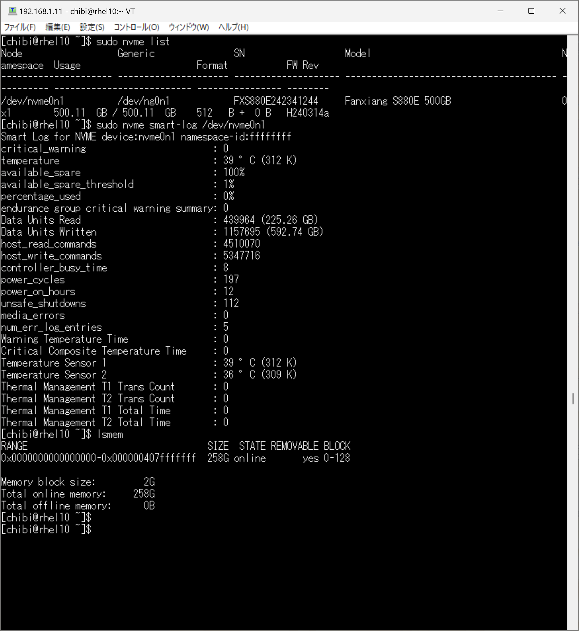 nvme list nvme smart-log /dev/nvme0n1 lsmem 256GB