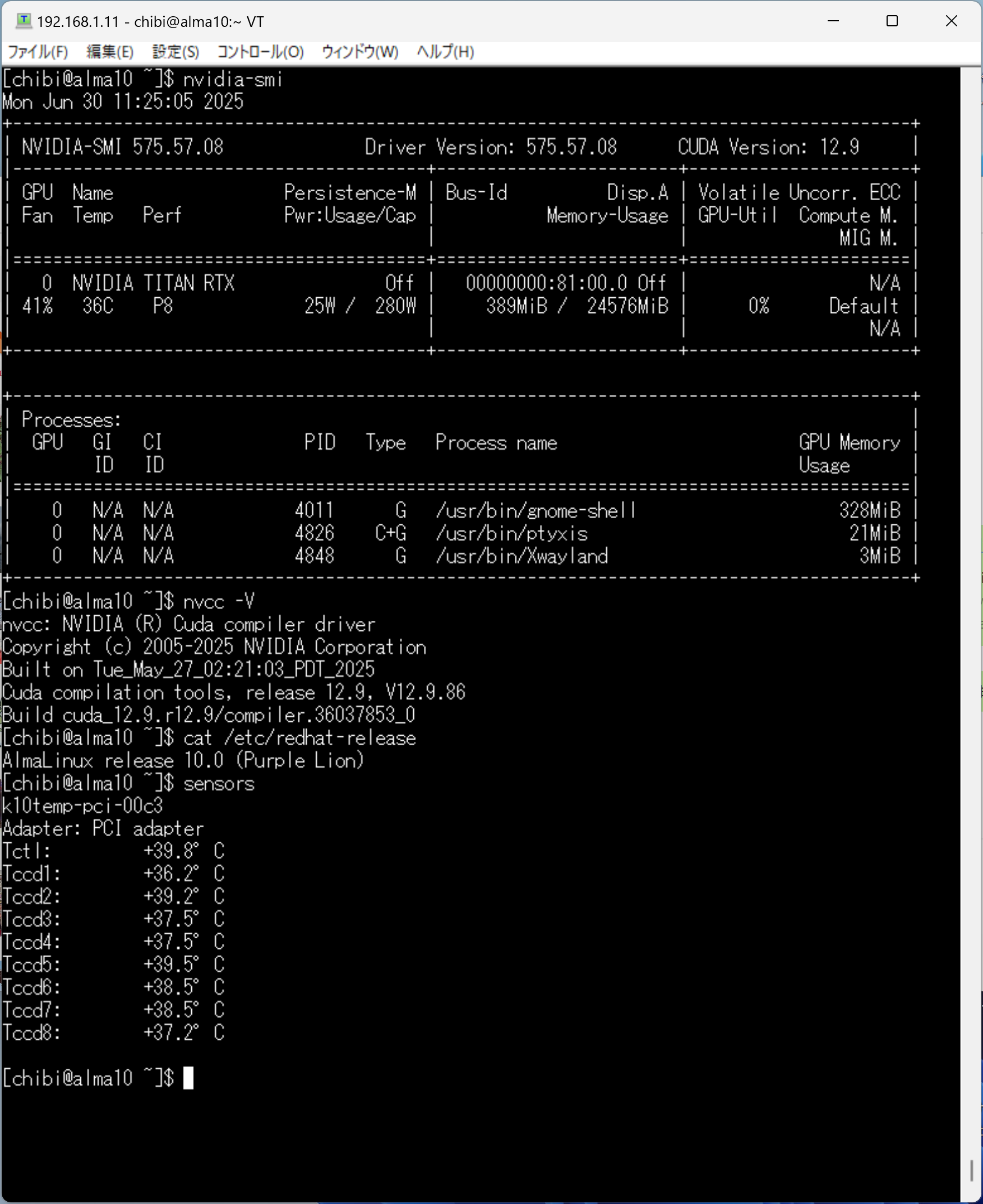 - 第2世代 AMD EPYC 7742 64-Core Processor 128Threads 256GB RTX2080Ti EDILOCA EN605 256GBで構成された Ubuntu 22.04.5 LTS へ CUDA-toolkit 12.9.1をInstall してnvidia-smi nvcc -V cat /etc/os-release sensors lsmem nvme list nvme smart-log /dev/nvme0n1 lscpuを設定してみた
