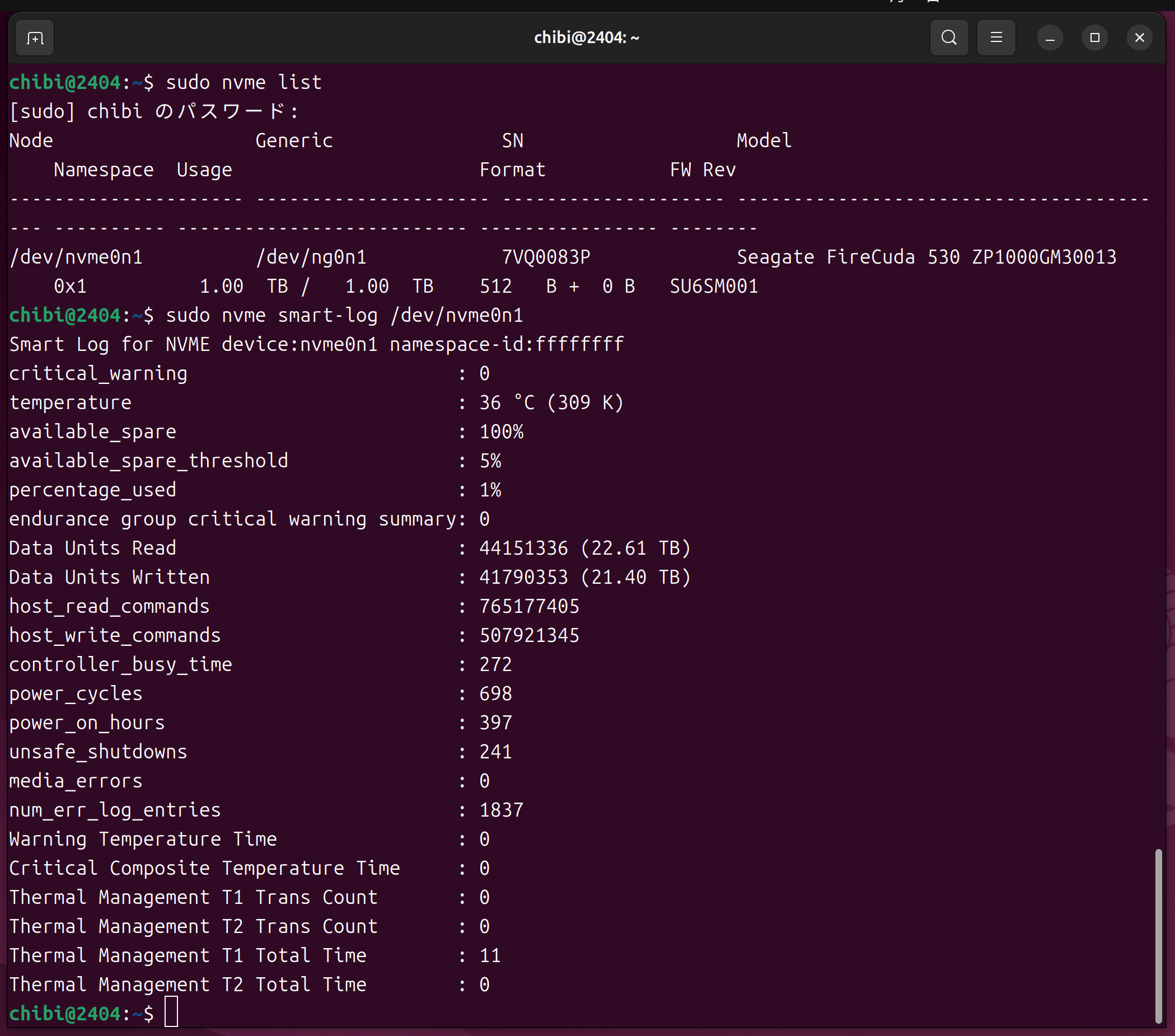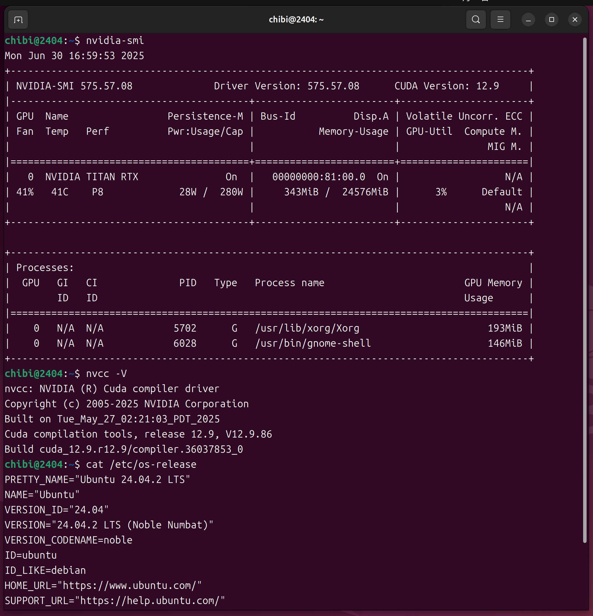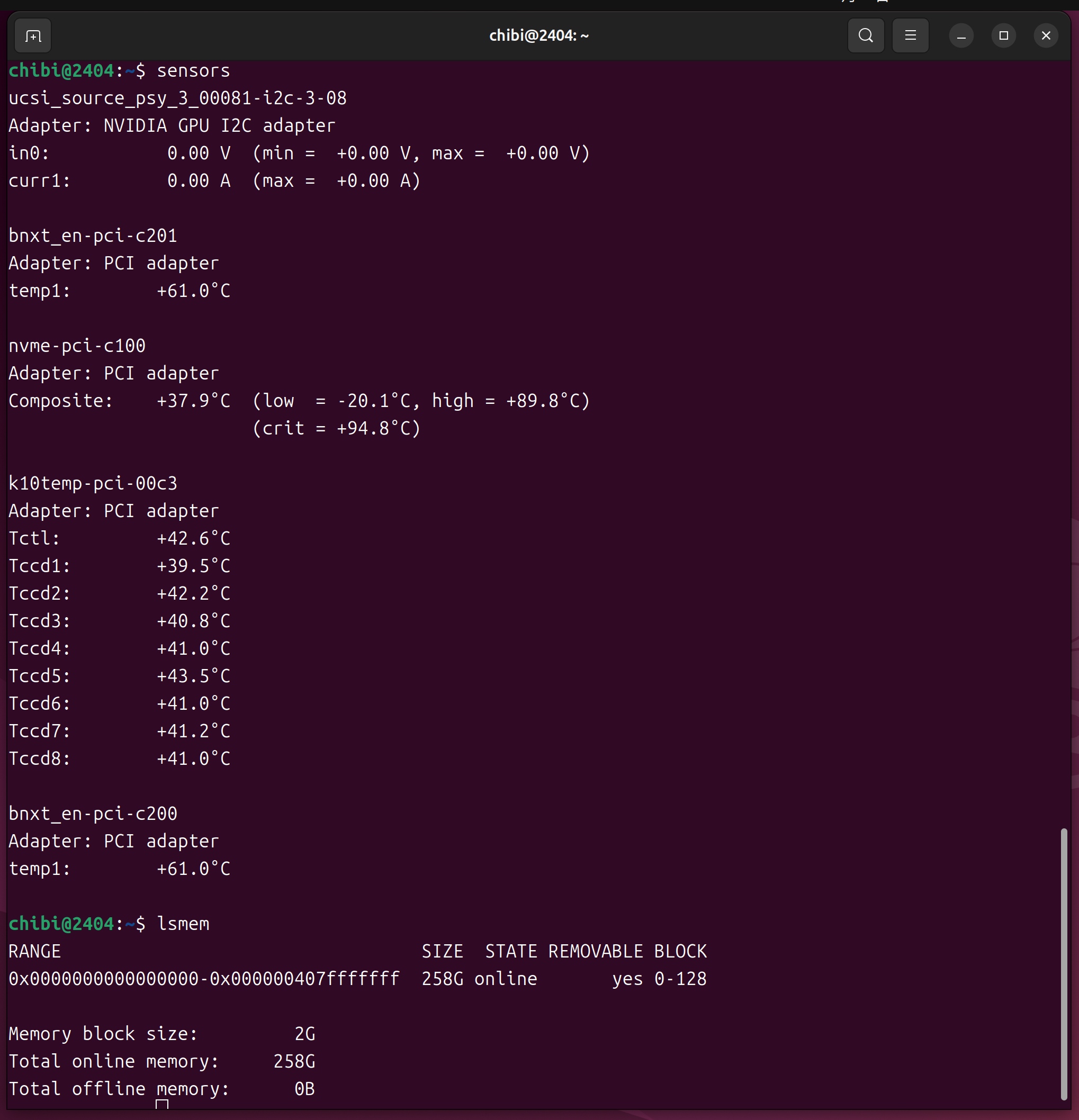 第3世代 AMD EPYC 7763 64-Core Processor 128Threads 256GB TITAN RTX Seagate FireCuda 530 ZP1000GM30013 1TB で構成されたUbuntu 24.04.2 LTS へ CUDA-toolkit 12.9.1 をInstall してnvidia-smi nvcc -V cat /etc/os-release sensors lsmem nvme list nvme smart-log /dev/nvme0n1 lscpuを設定してみた